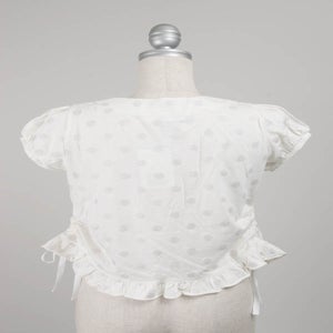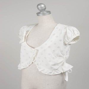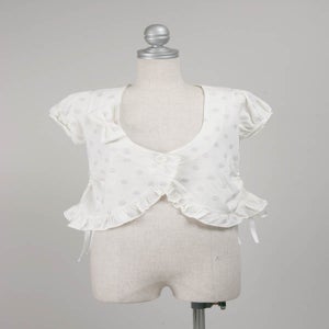 A cute bolero with glitter dots and a bonnet. The cream and pink combination is girly. The shirring at the side hem allows for customization.