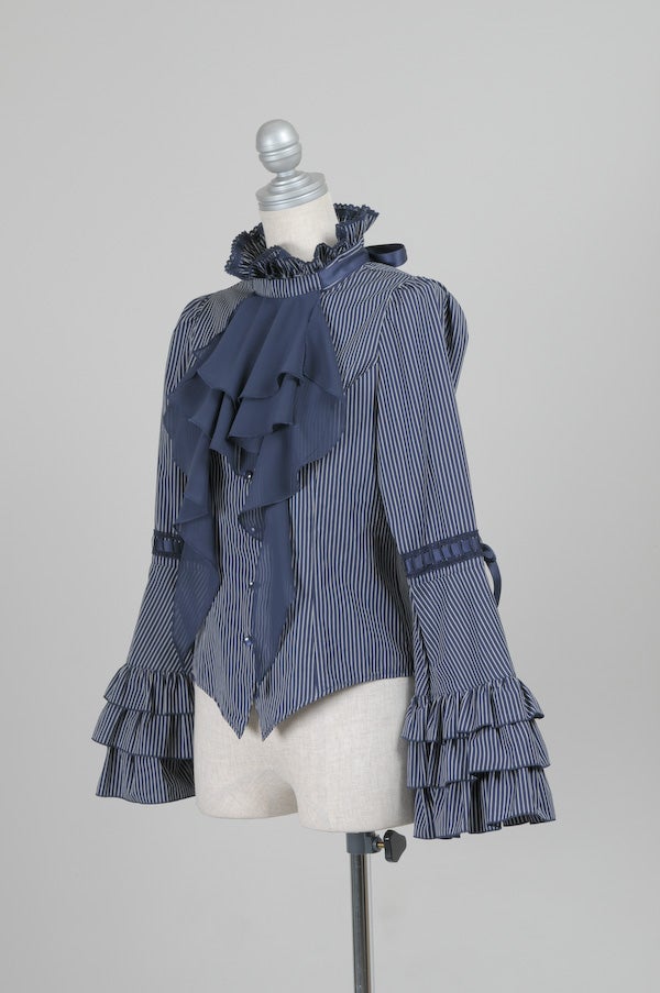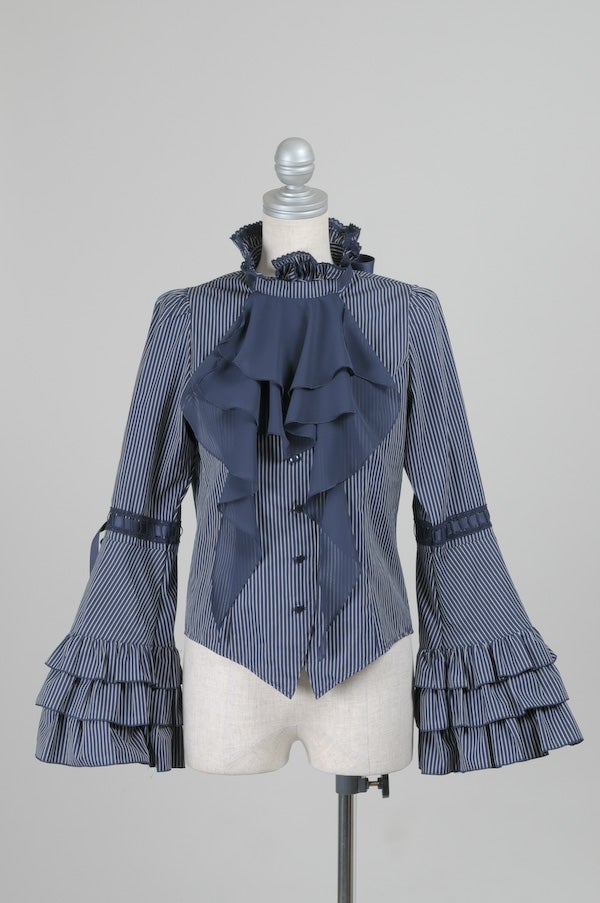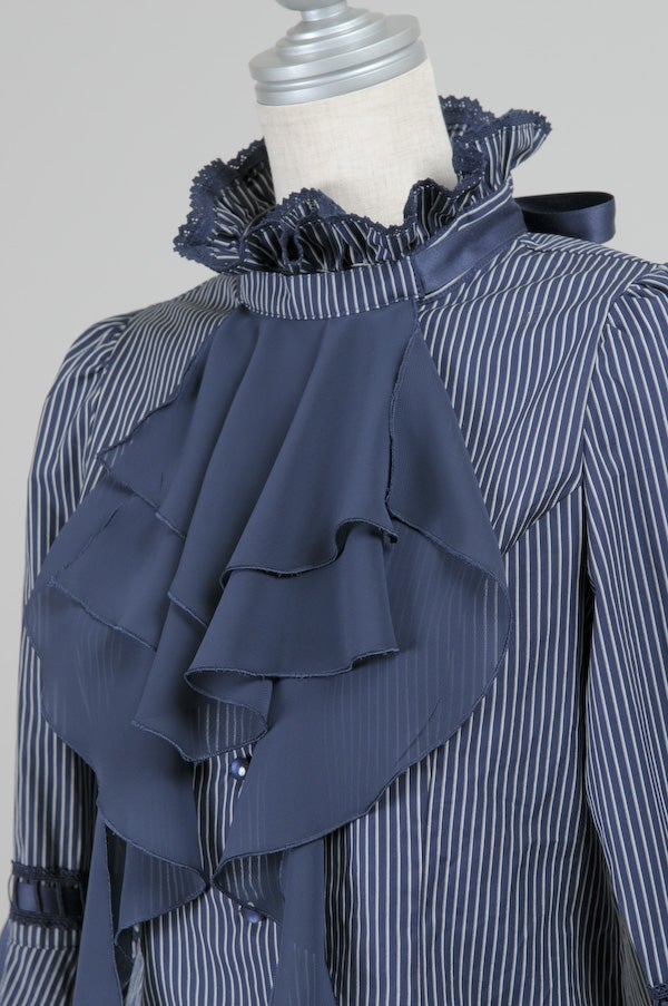シフォンのジャボ付き姫袖ブラウス。ネイビーのストライプは気品があって黒にもよくマッチします。ジャボは取り外し可能。