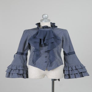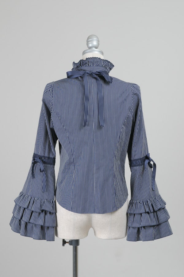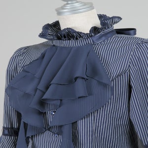 A chiffon princess-sleeved blouse with a jabot. The navy stripes are elegant and match well with black. The jabot is removable
