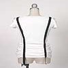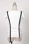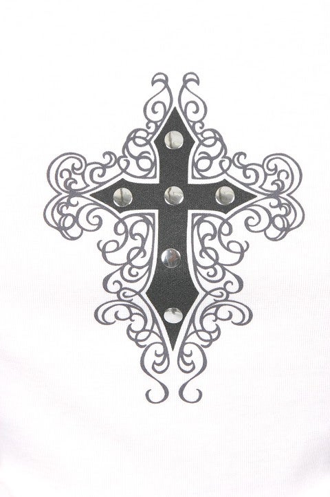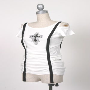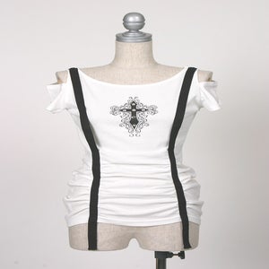 肩が開いた個性的なデザイン。裾のシャーリングも凝っている。十字架のまわりにはカシメがうってあります。