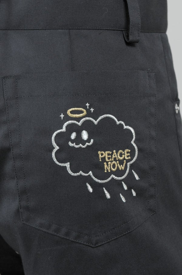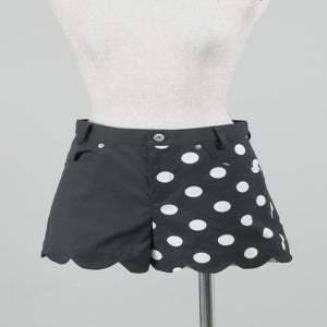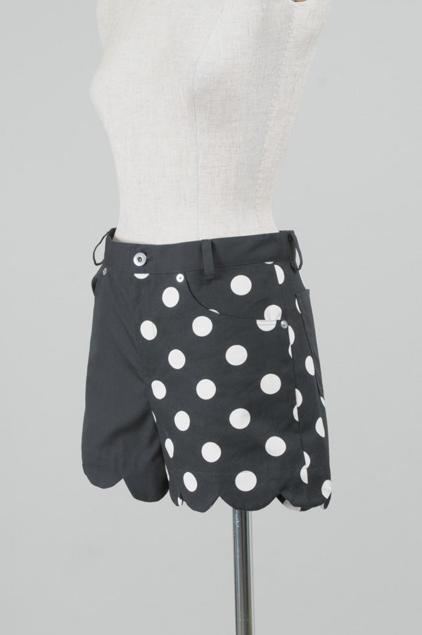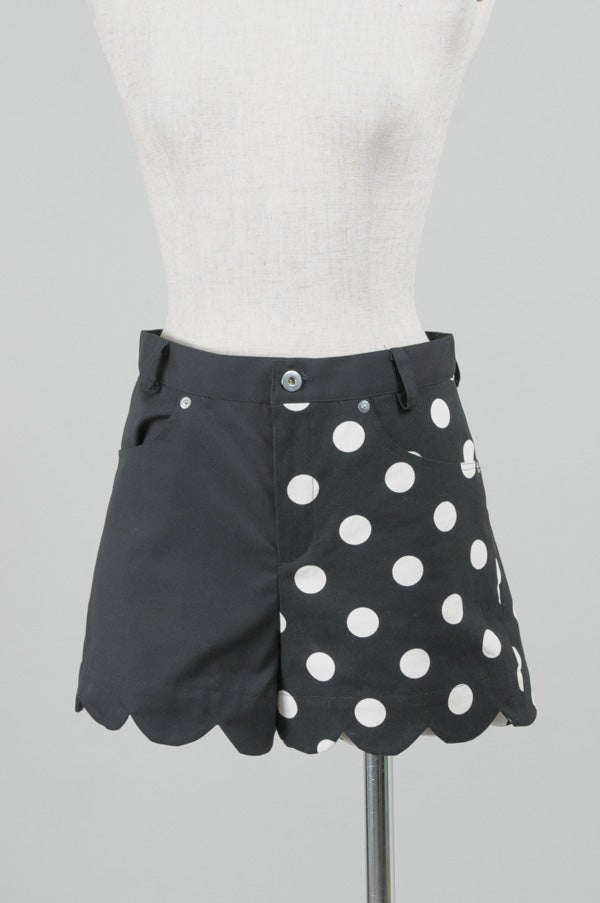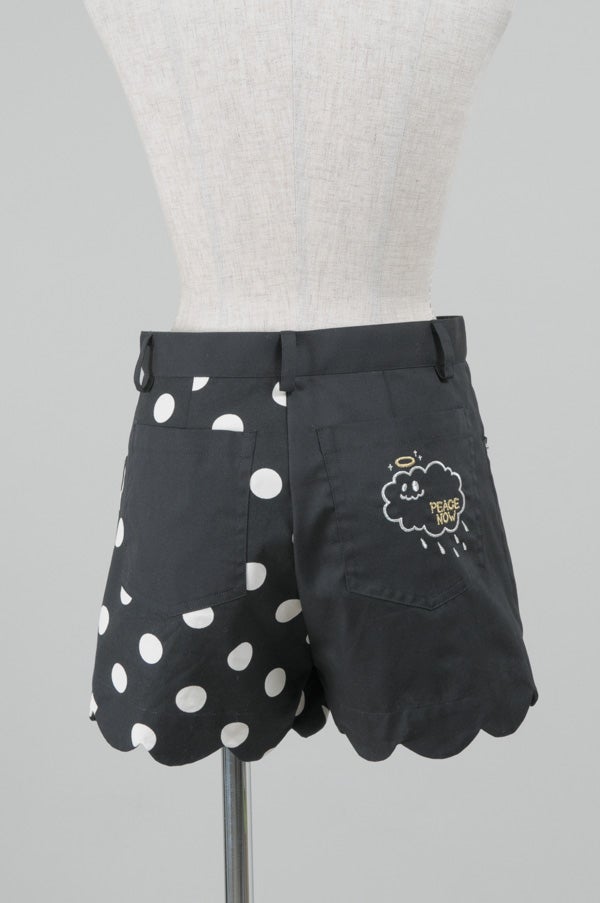 These shorts feature a cute combination of solid and polka dots. The frilly hem is also cute. The back pocket has embroidered clouds.