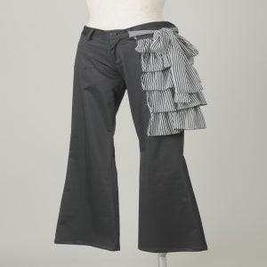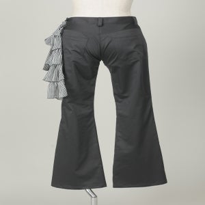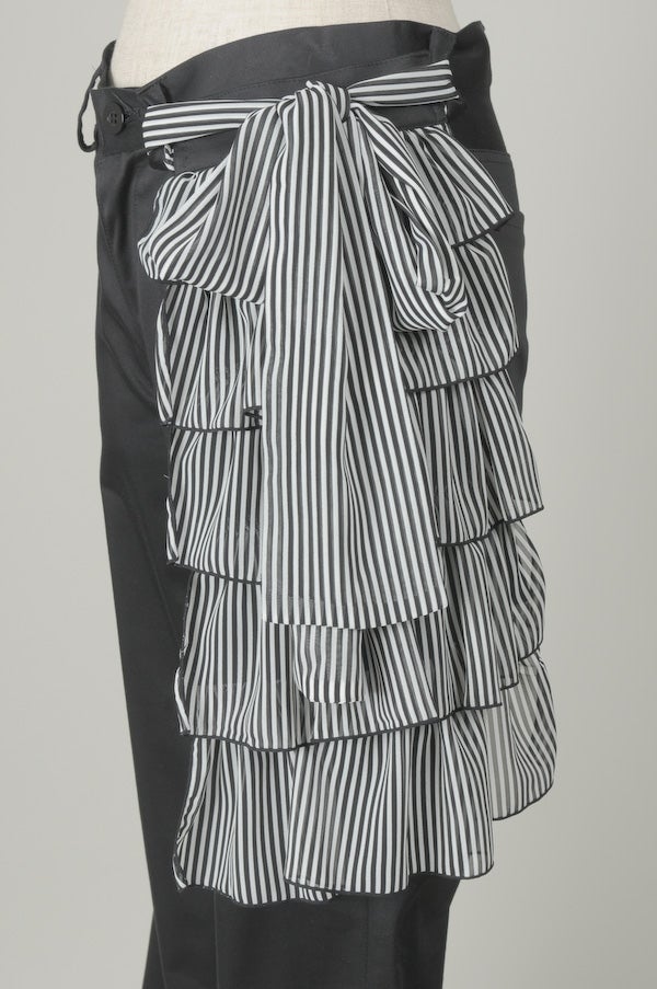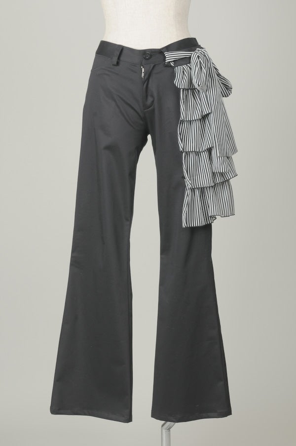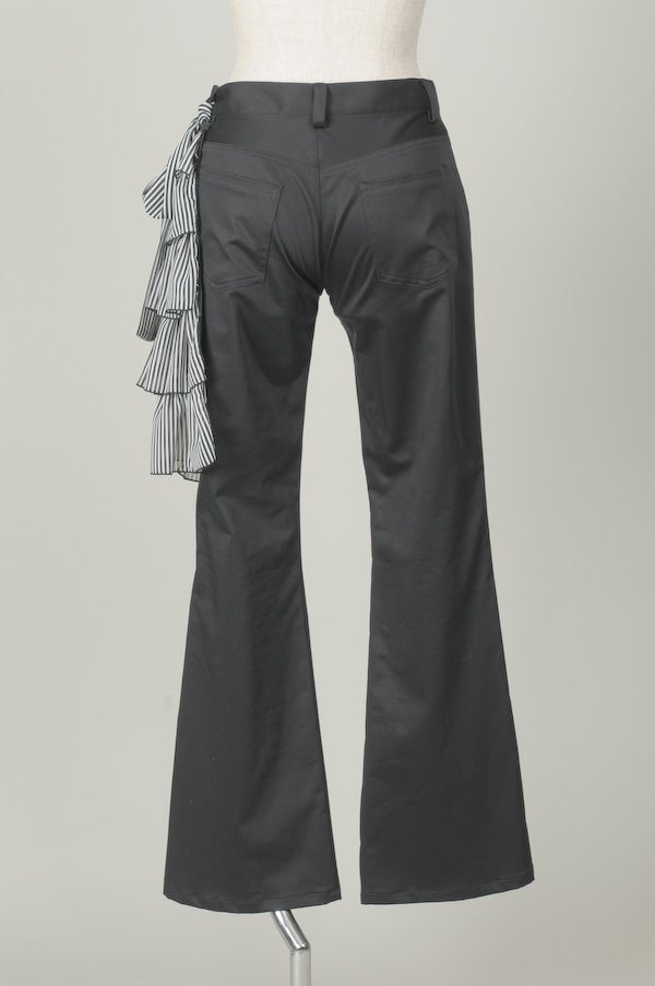 ストライプシフォンが目を引くストレッチパンツ。定番のブーツカットで足長効果。シフォンは取り外し可能。