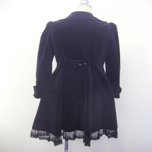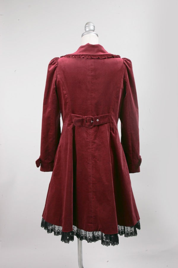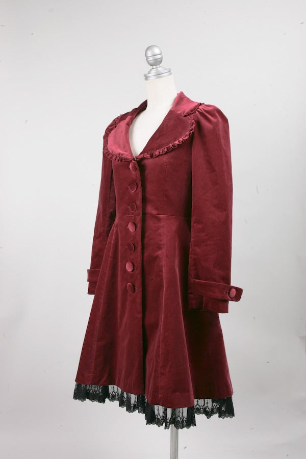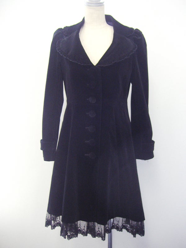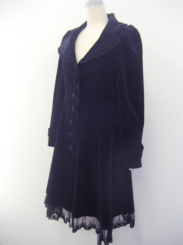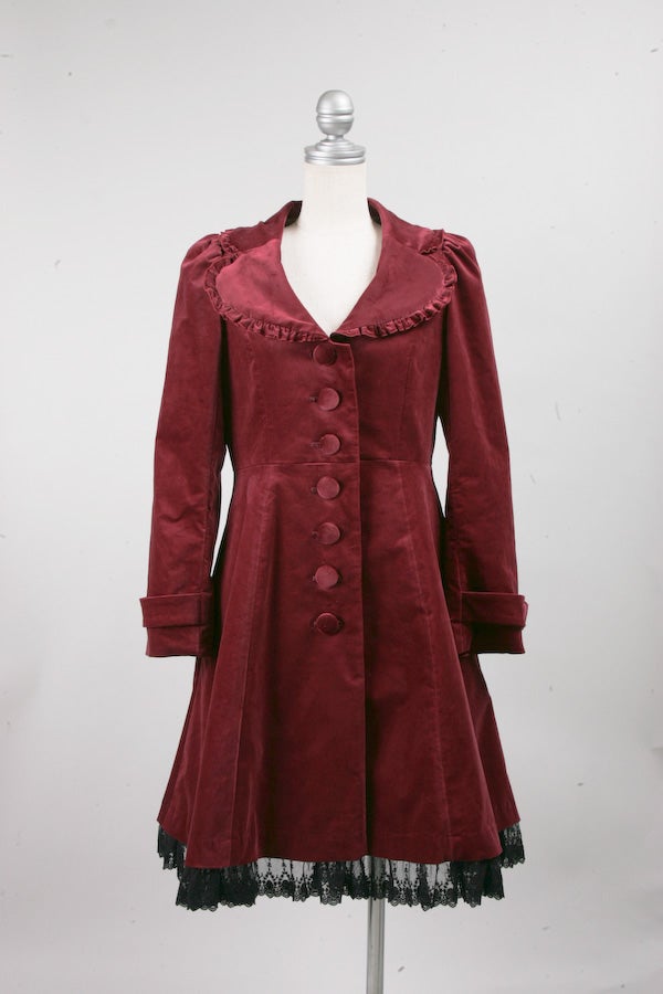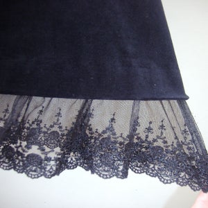 The flared skirt from the waist down is feminine, and the black lace at the hem adds a cute touch.