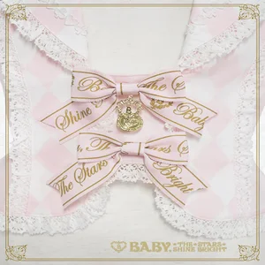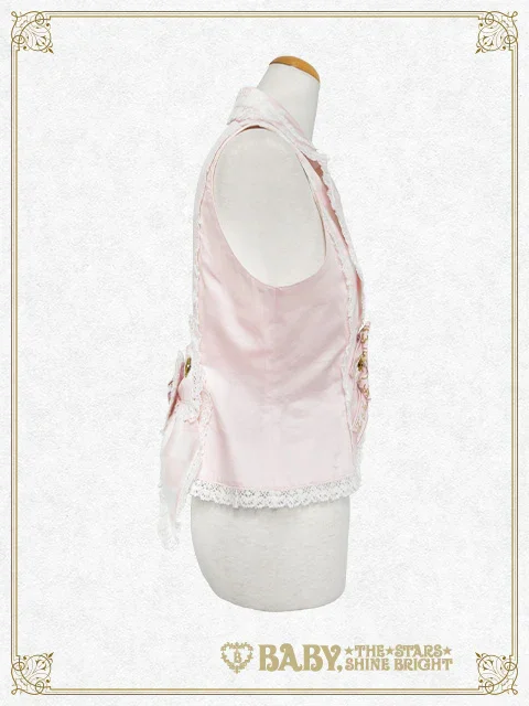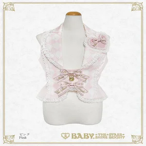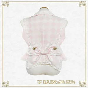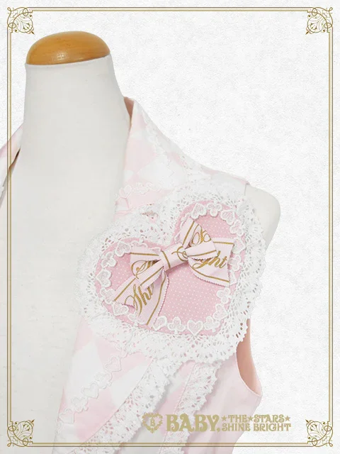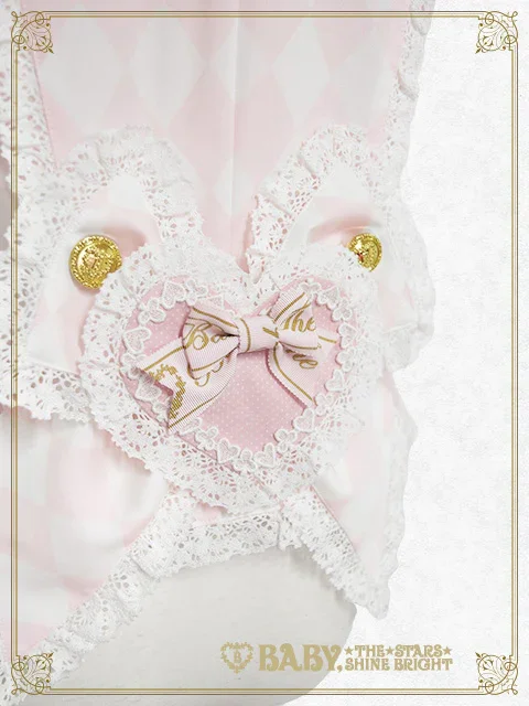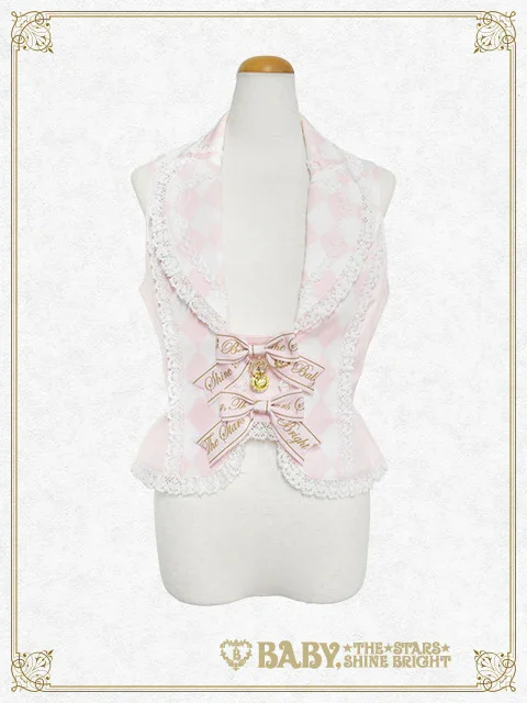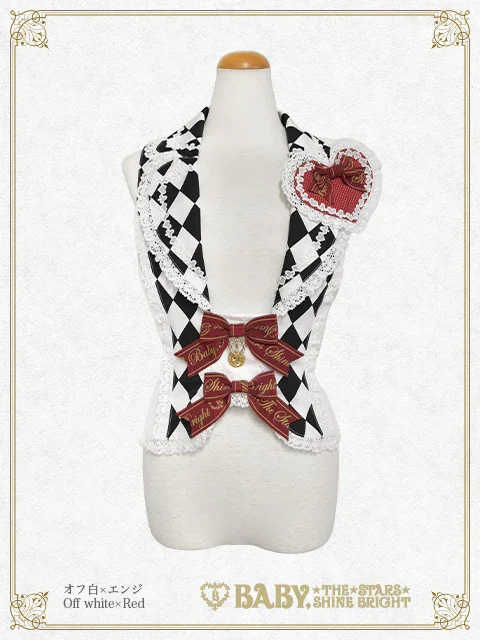 襟や前後身頃に部分的に使用されたダイヤ柄の生地が目を引くベストは、お取り外し可能なハートモチーフやお背中の大きめおリボン、BABYオリジナルのグログランロゴリボンがポイント!
