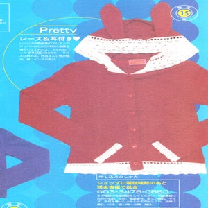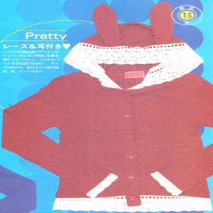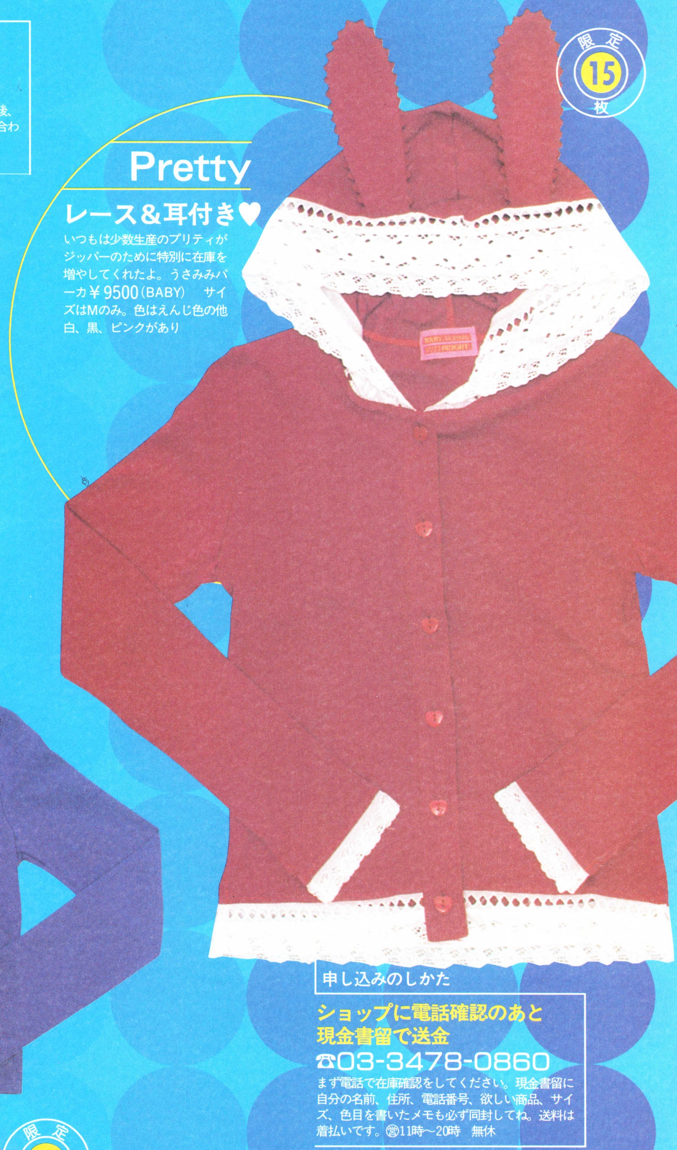 Item description: "With lace & ears. Usually, Pretty produces a limited quantity, but they increased their stock especially for Zipper. Bunny ear jacket ¥9500 (BABY) Size M only. Colors include red, white, black, and pink."