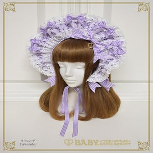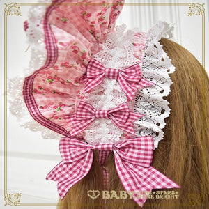 This bonnet is made from a sweet and cute fabric with a floral and gingham pattern and strawberries and ribbons♡