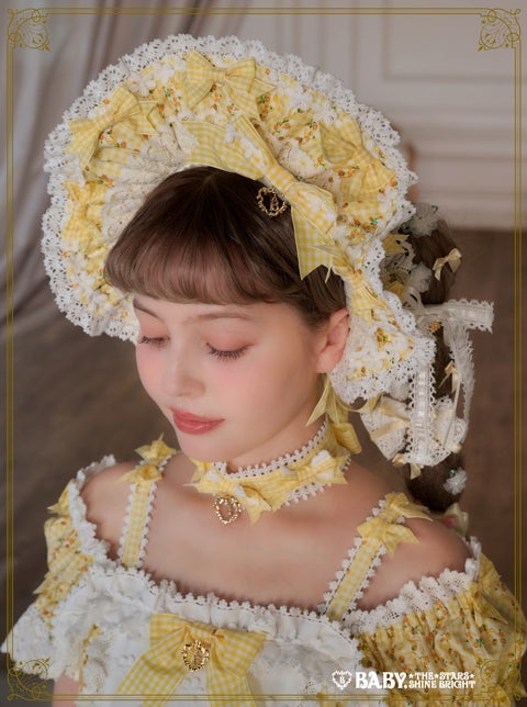 トーションレースやケミカルレースをふんだんに使用し、ギンガムリボンをたくさんあしらった華やかなデザイン♪