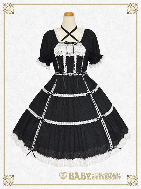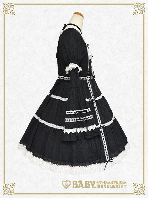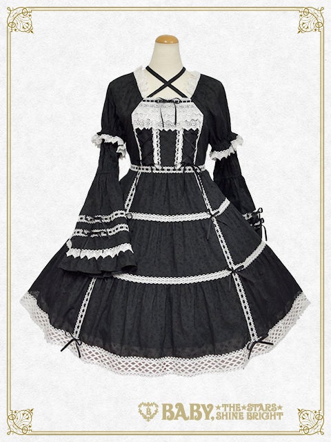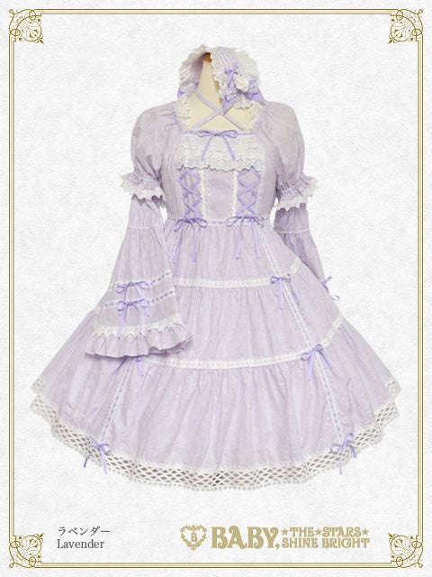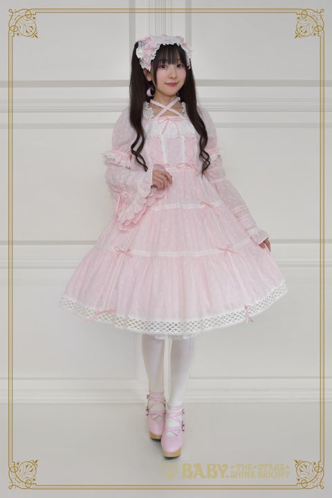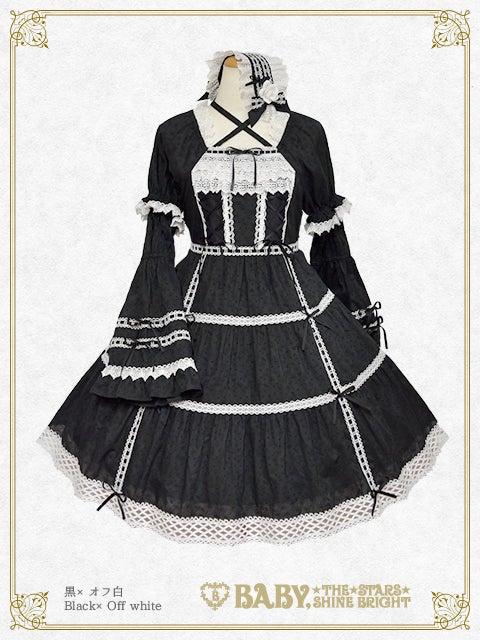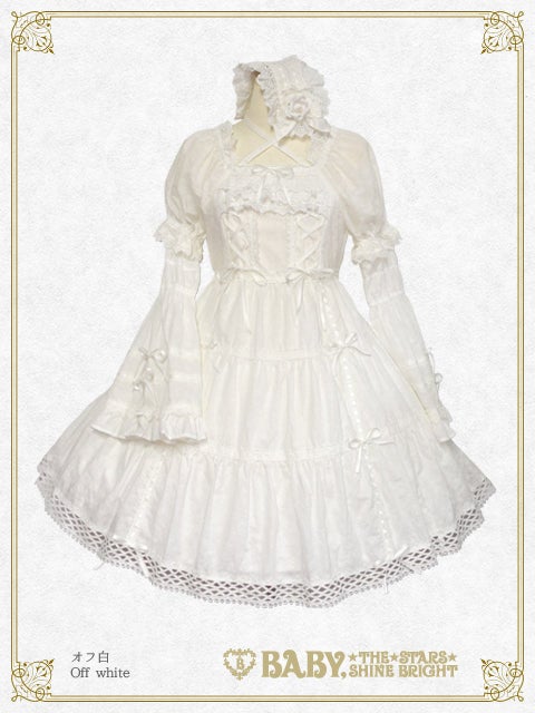 お取り外し可能な姫袖や贅沢にあしらわれたトーションレ―ス、スカートのティアード仕様やおリボンを通したはしごレースのデザインなど、BABYらしい可愛らしさとお上品さが同居したワンピースに、薔薇コサージュが華やかなヘッドドレスがセットになった、レジェンドアイテムです♡