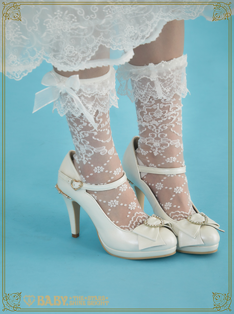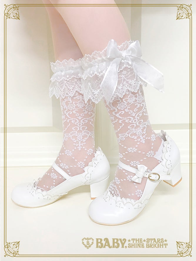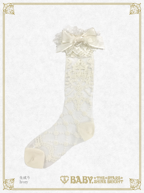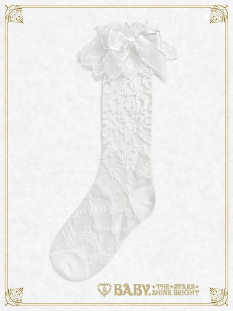 レース柄のふくらはぎの真ん中あたりに来る丈のソックスです。