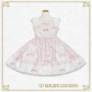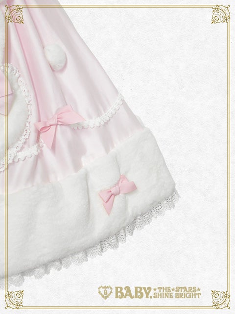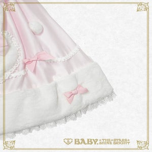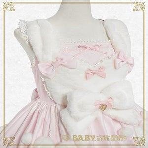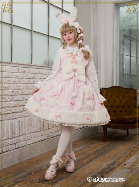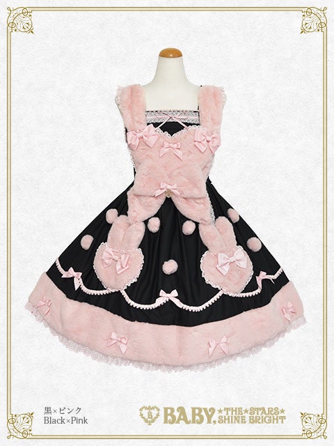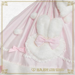 This cute jumperskirt features a bunny face on the body and skirt, and fur trimmings all around the hem. The removable waist ribbon in the front and pom-poms that resemble falling snowflakes are all made of fluffy fur; bringing out the adorableness of the snow bunny♡