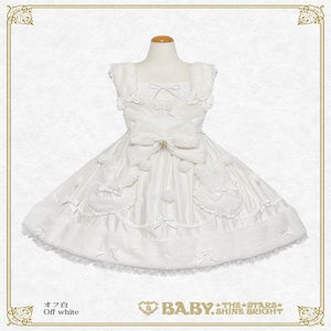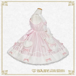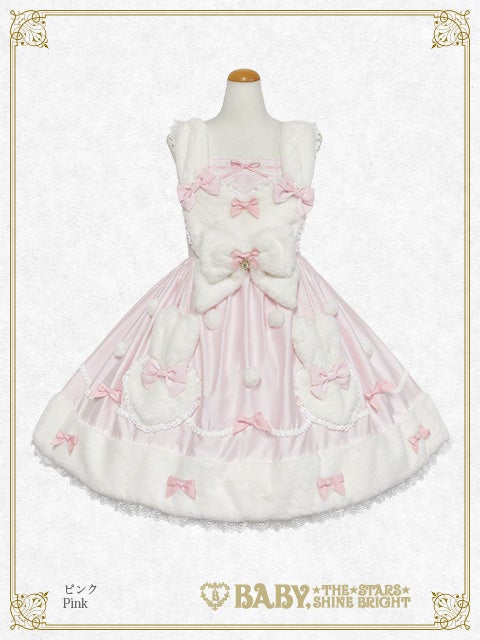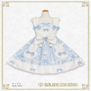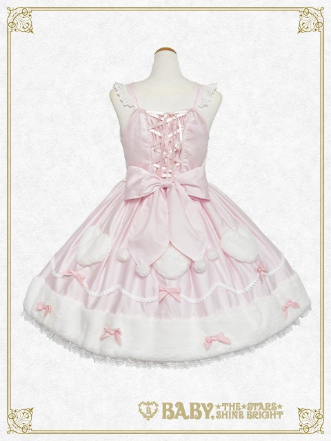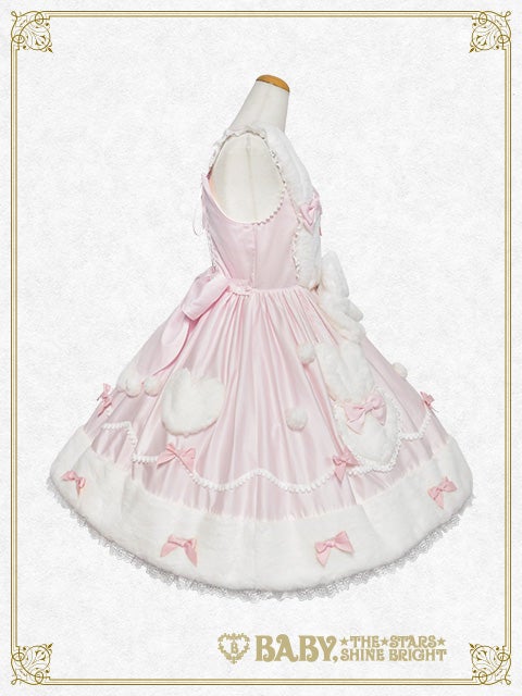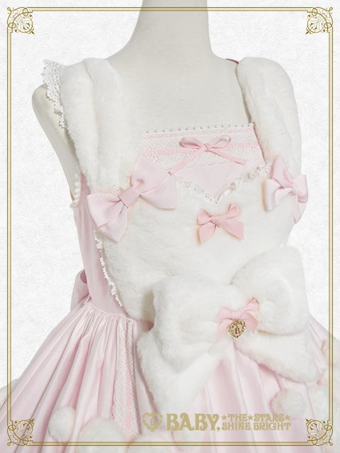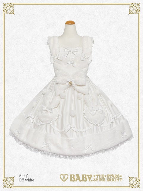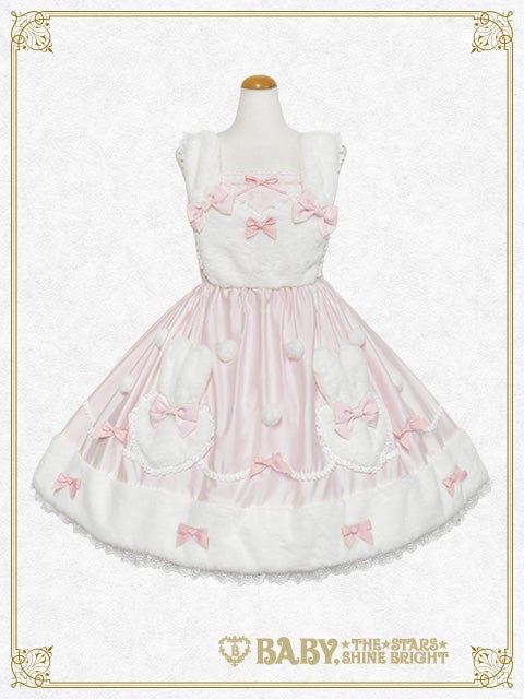うさぎさんのお顔をかたどった身頃やスカート飾り、裾にぐるりとあしらったファーがCuteなジャンパースカートは、お取り外し可能な前ウエストリボンや、舞い落ちた雪のようなポンポン飾りなど、たくさんのふわふわファーが雪うさぎさんの愛らしさを演出します♡