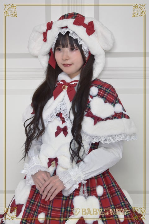 フードのお顔まわりや裾、ハートモチーフやポンポン飾りなどふわふわたっぷりのケープは、ファーのうさみみ付きフードで一気にうさぎさんになれちゃうCuteな1着です♡