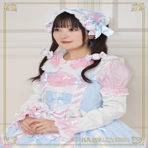 ストライプ生地を随所に使用し、綿レースをたっぷりあしらって可愛らしく仕上げました。