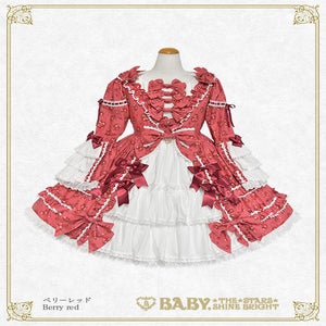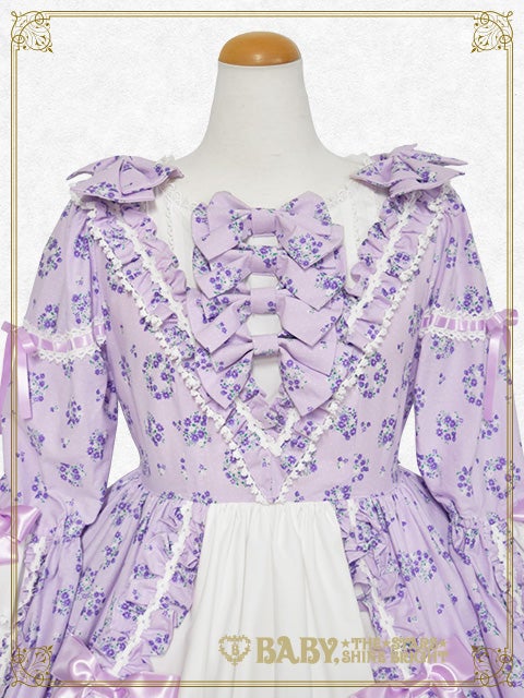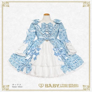 胸元にはピンタックや沢山のリボンがあしらわれ、お袖は華やかに広がるフリルいっぱいの姫袖仕様となっております。