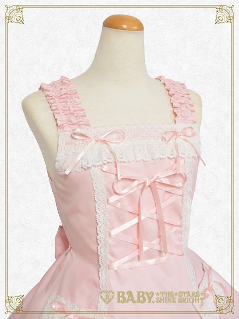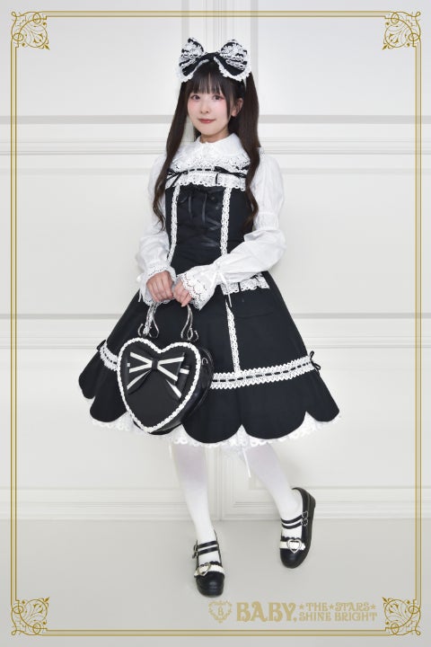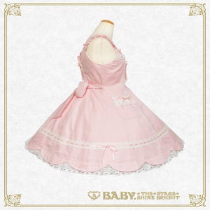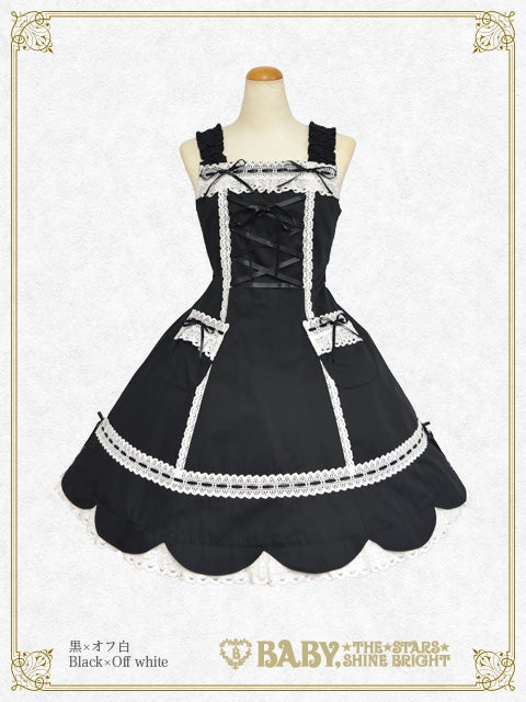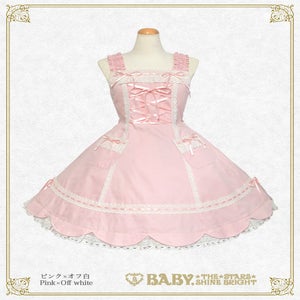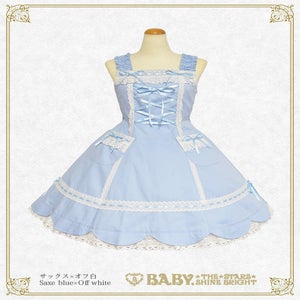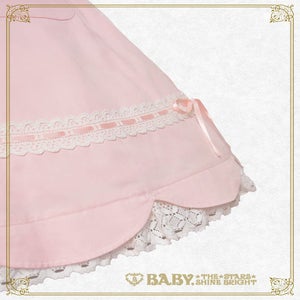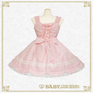 裾にあしらったスカラップ仕様やリボン通しレースが愛らしい、BABY定番のジャンパースカートは