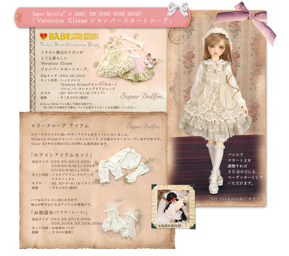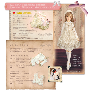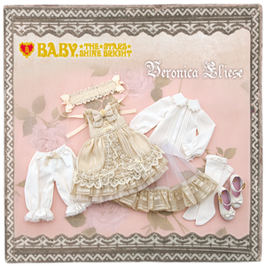 The Veronica Elisse Jumper Skirt Coordinate Dress Set is a collaboration between VOLKS and BABY, THE STARS SHINE BRIGHT for Super Dollfie. Originally released paired with the Dear SD line but also for sale individually. Size DSD, SD, SD13, SDGr, DDS (SS/S/M/L), DDSB, DD (SS/S/M/L), DDB, DDdy.