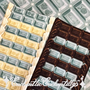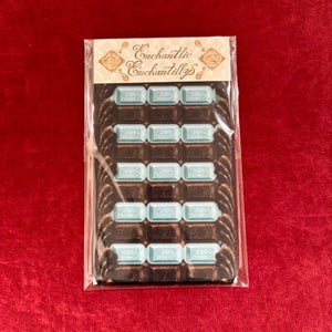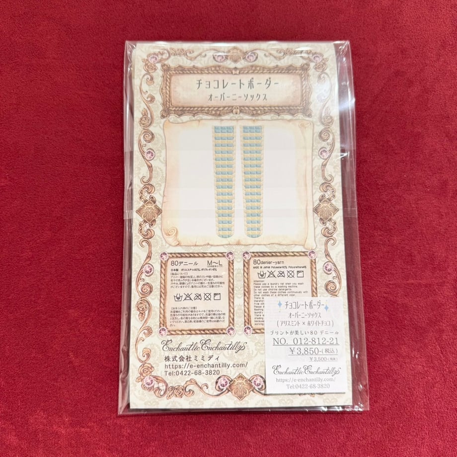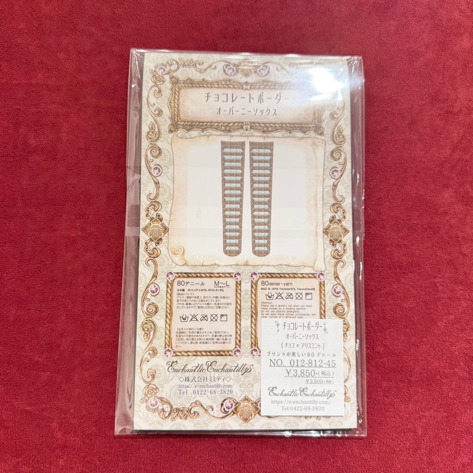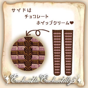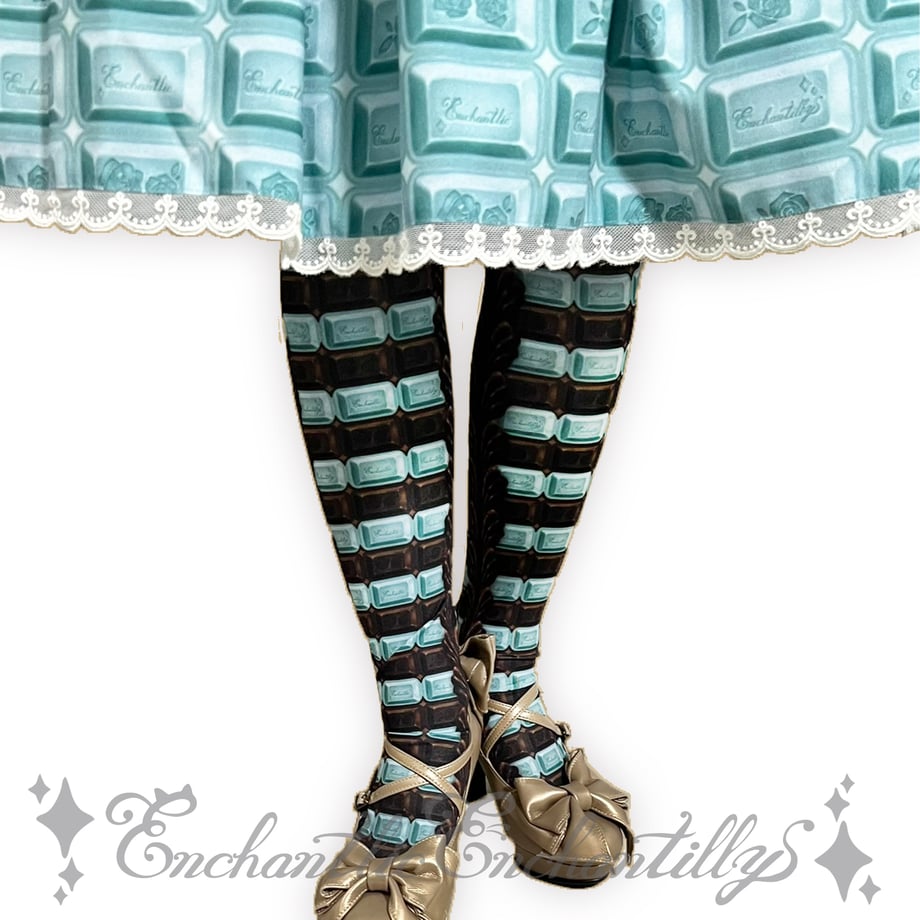 Enchantlic Enchantilly「アンシャンテリー チョコレート柄シリーズ」オリジナルプリント。甘く可愛らしいチョコレート柄をアンシャンテリーがさらに可愛い魔法のエッセンスを加えて仕上げました。新色<アリスミント×ホワイトチョコ><チョコ×アリスミント>が登場!美味しそうなオーバーニーソックスです。側面はチョコレートクリームを添えました。お洋服にも合わせやすいオーバーニーです。