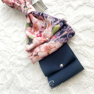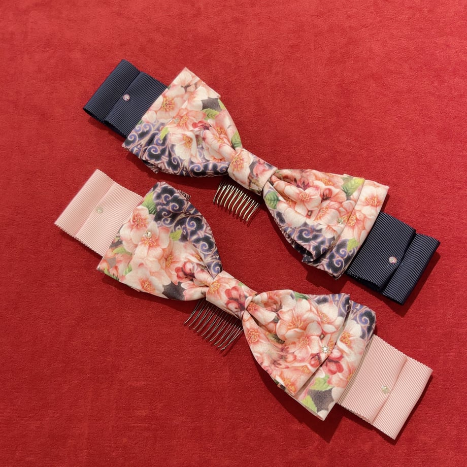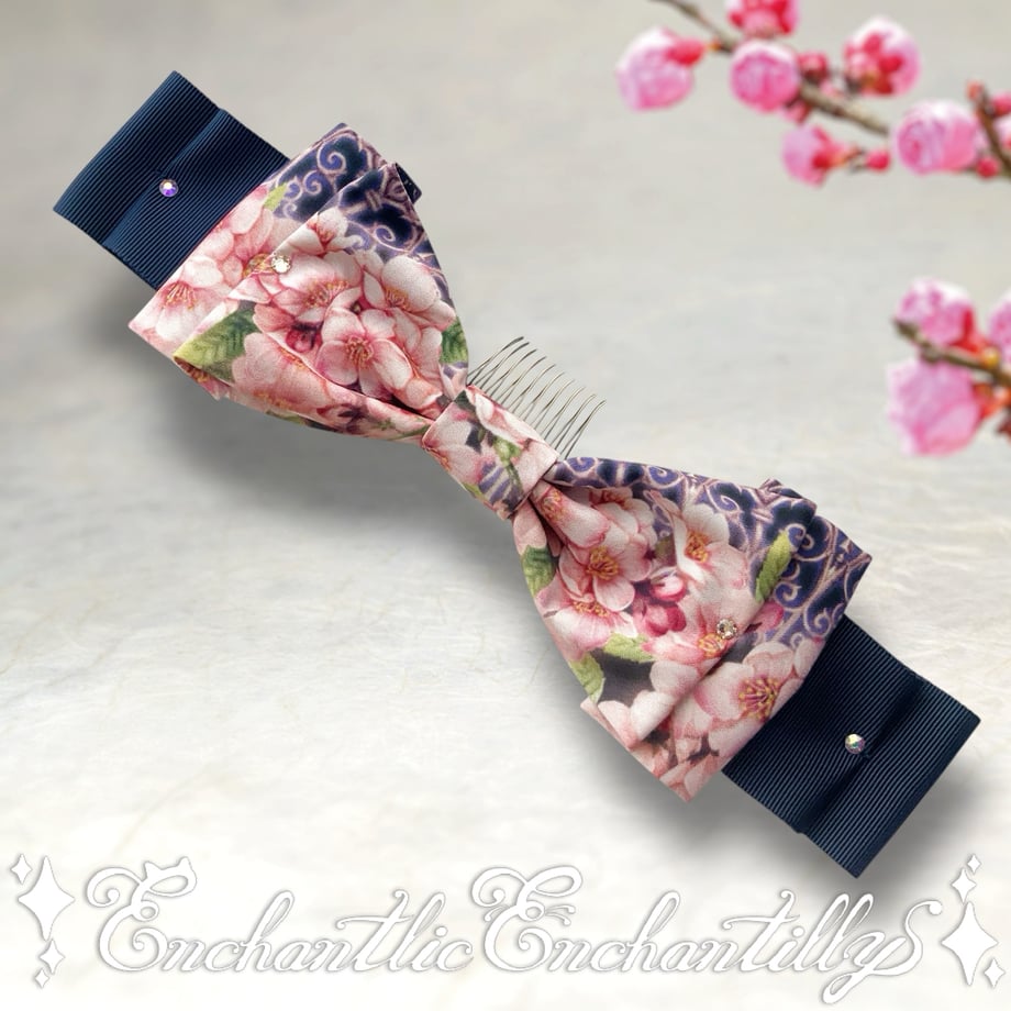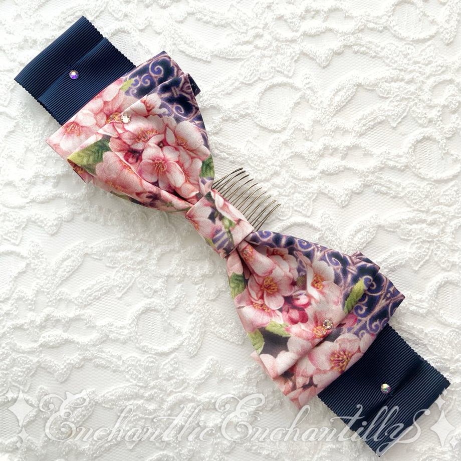 闇夜に咲き誇る桜達の幻影桜城のリボンコーム。動くたびにストーンがキラキラ煌めき、華やかさをアップしてくれます。とても繊細な魅惑のリボンです。
