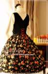 平绒与蔷薇条绒拼色背后小V领连身裙