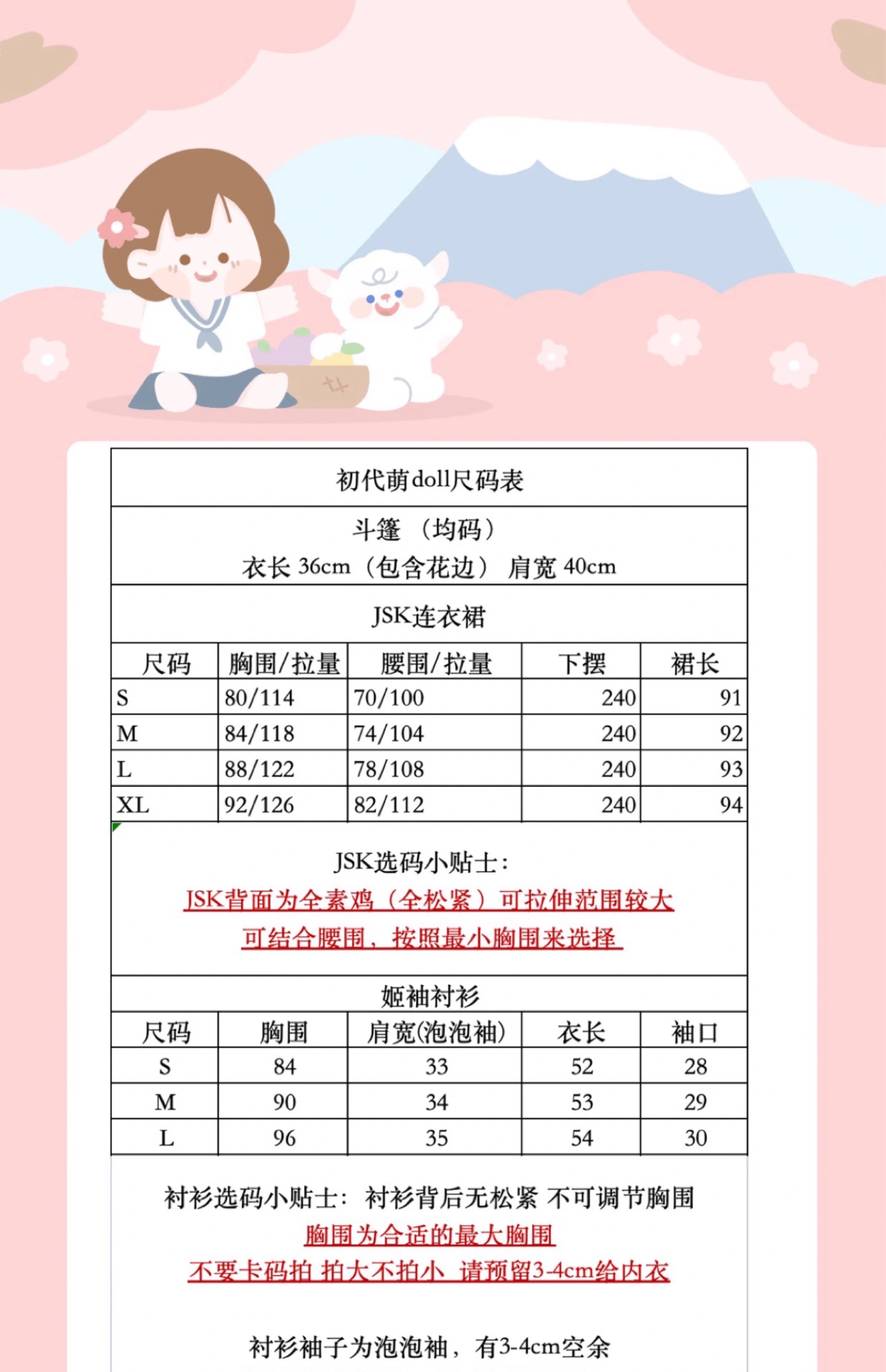 - JSK: The back has an elastic band with a large stretch range. Choose based on bust and waist measurements.