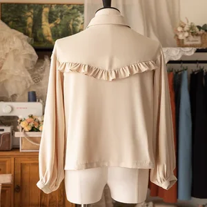 [Design notes] Featuring a delicate bow collar, ruffled chest and shoulder details, and a buttoned front with a charming ruffled hem at the back.