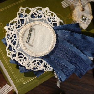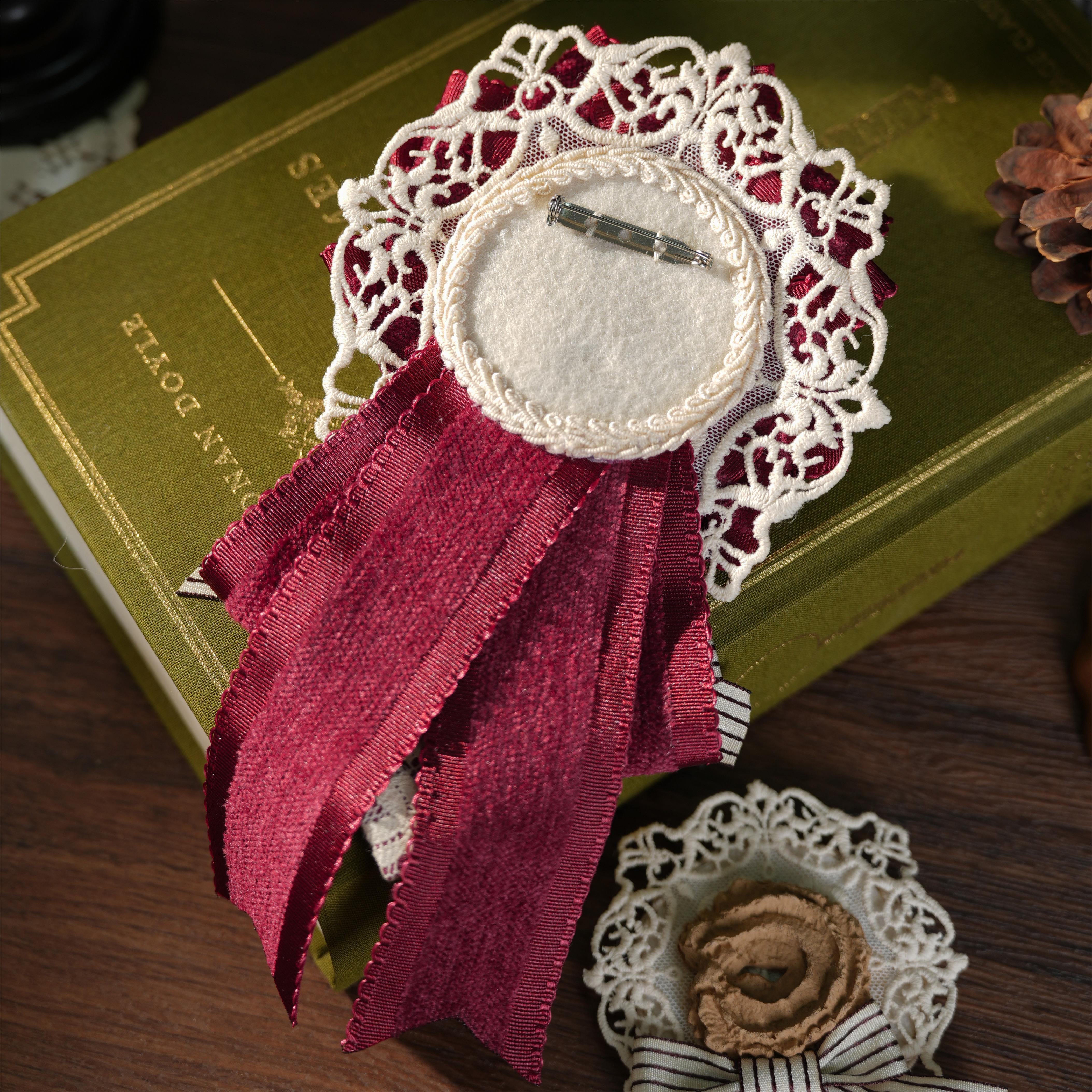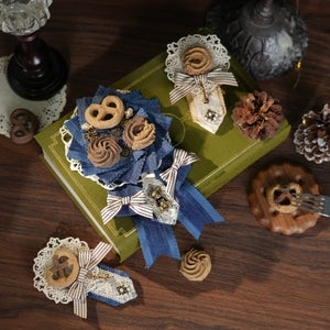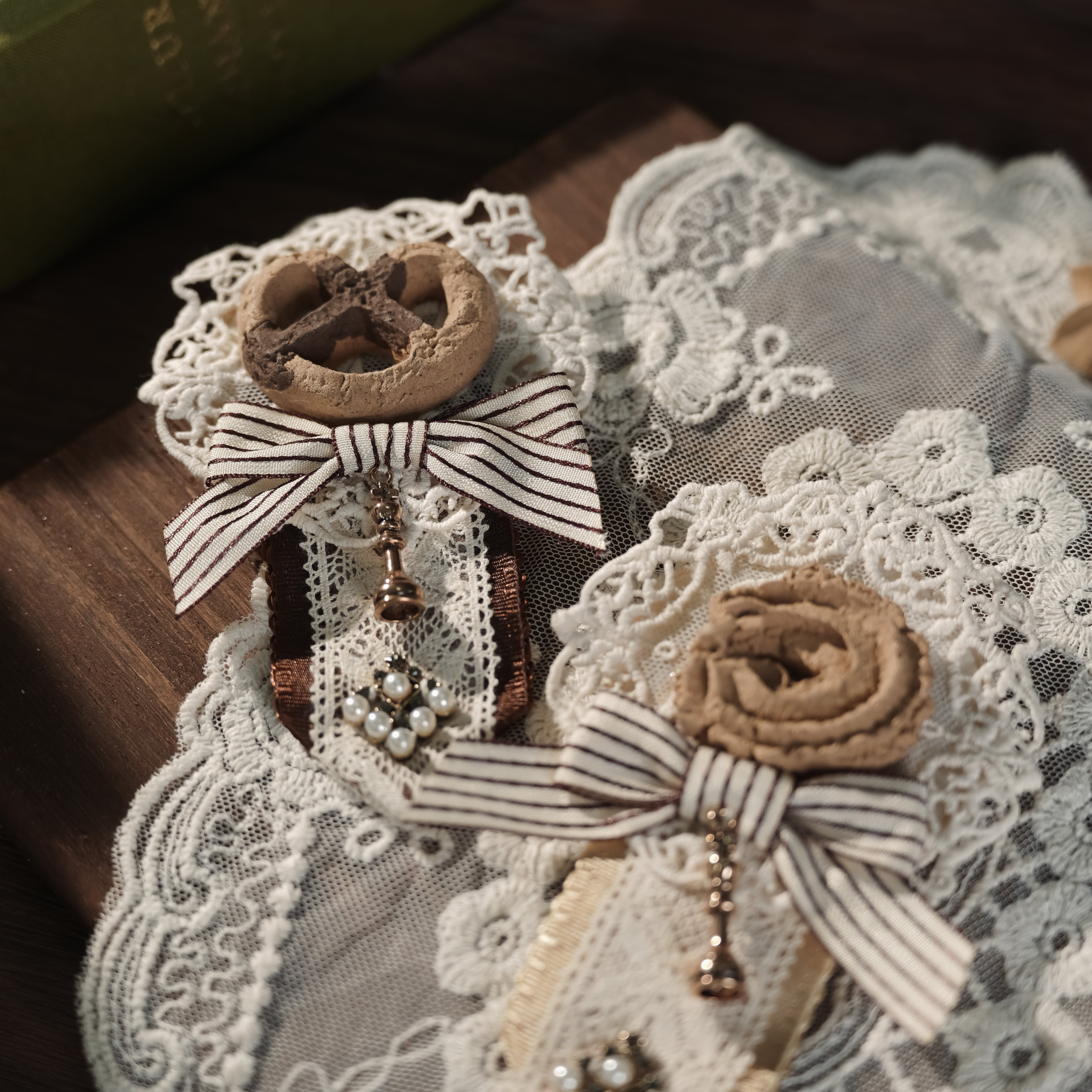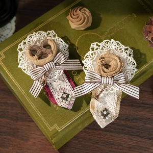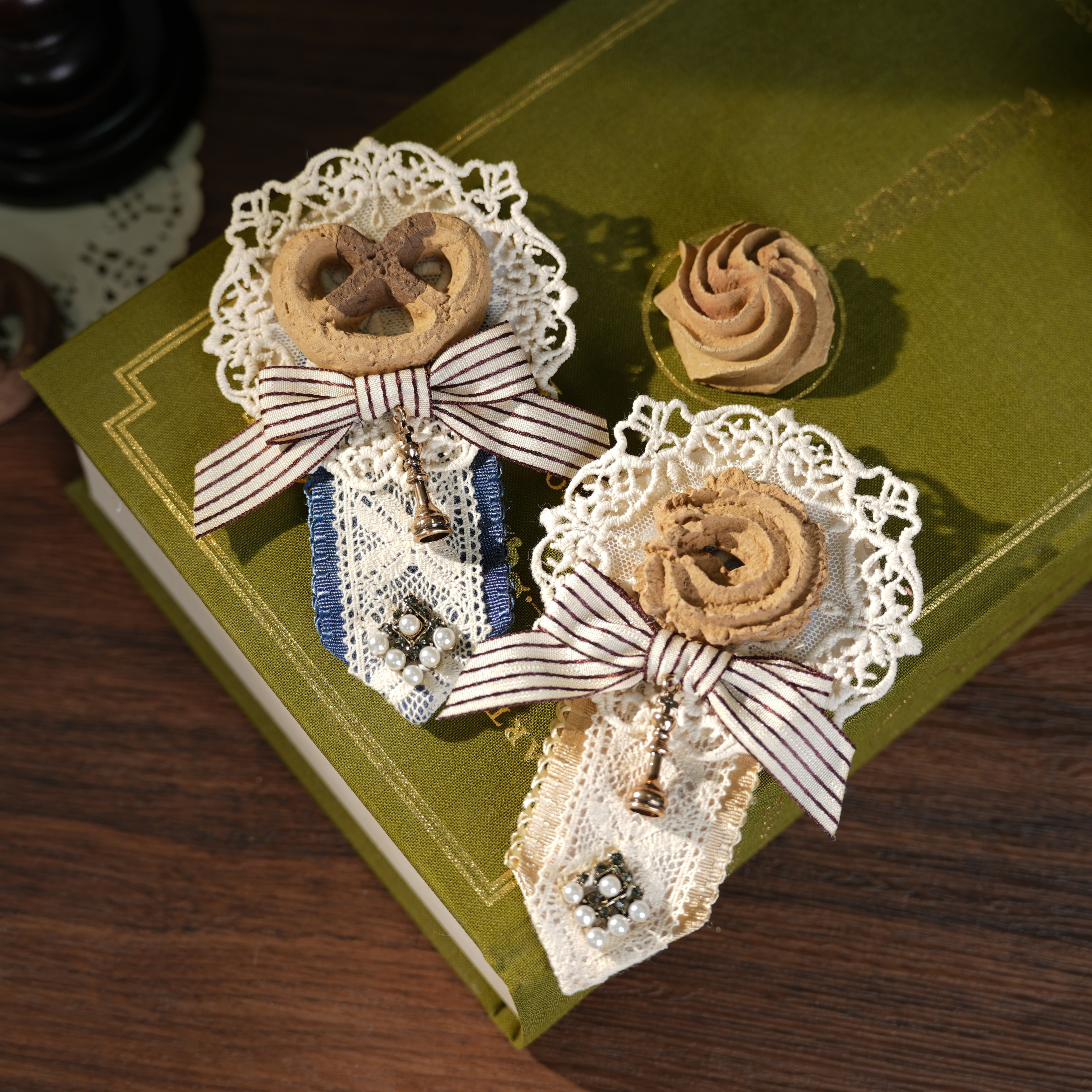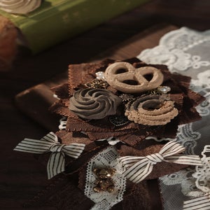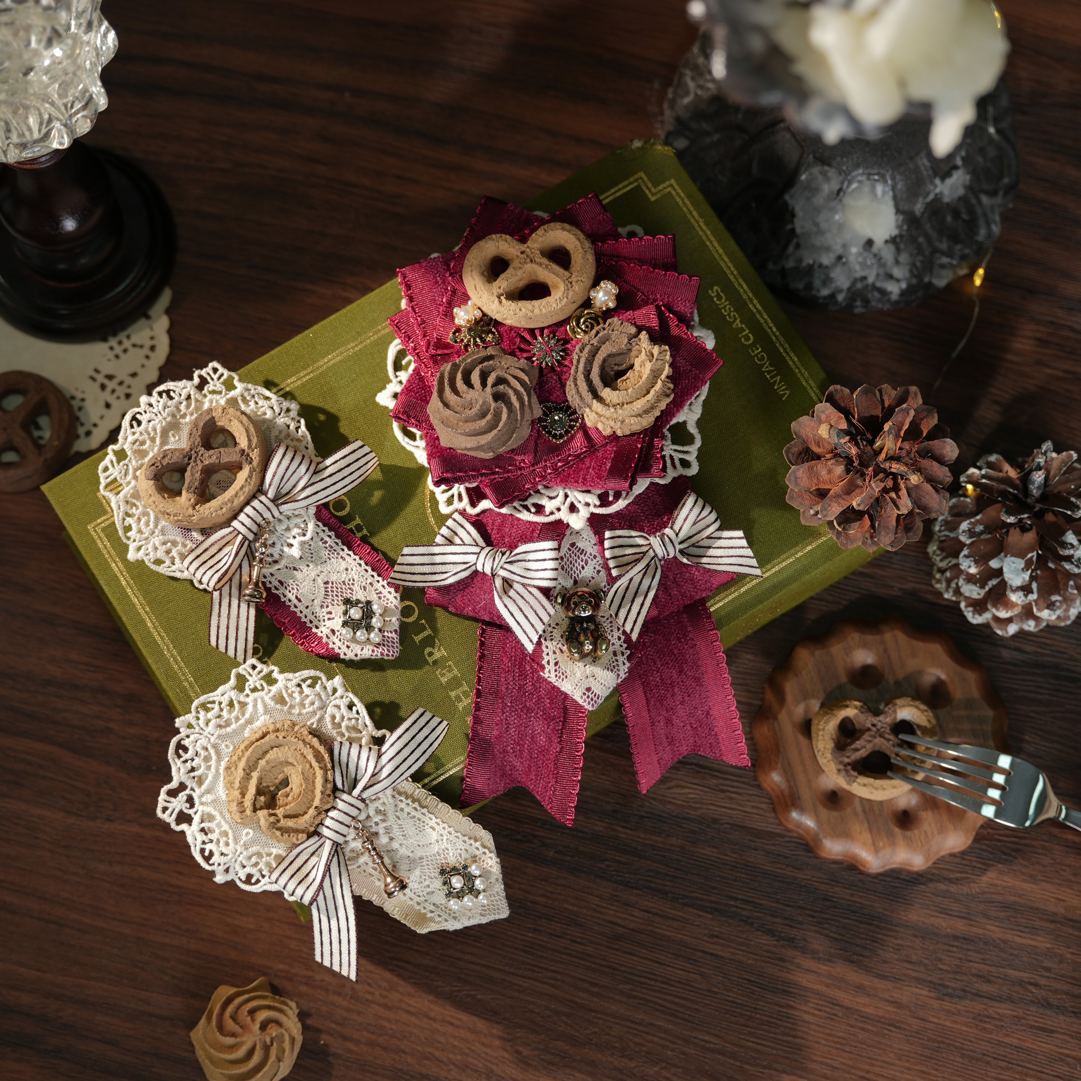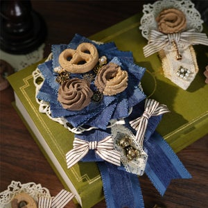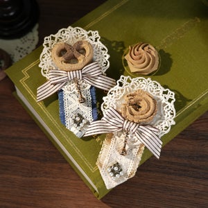[Brand comment] Introducing a unique rosette brooch featuring realistic-looking cookies. The antique charms adorned with the fake cookies are adorable. The ribbon at the bottom features a striped ribbon and a cute teddy bear. ❤ The included mini brooches can be used as a doll accessory or coordinated with other outfits. Its muted colors make it a classic and cute item. Try pairing it with a hat or blouse.