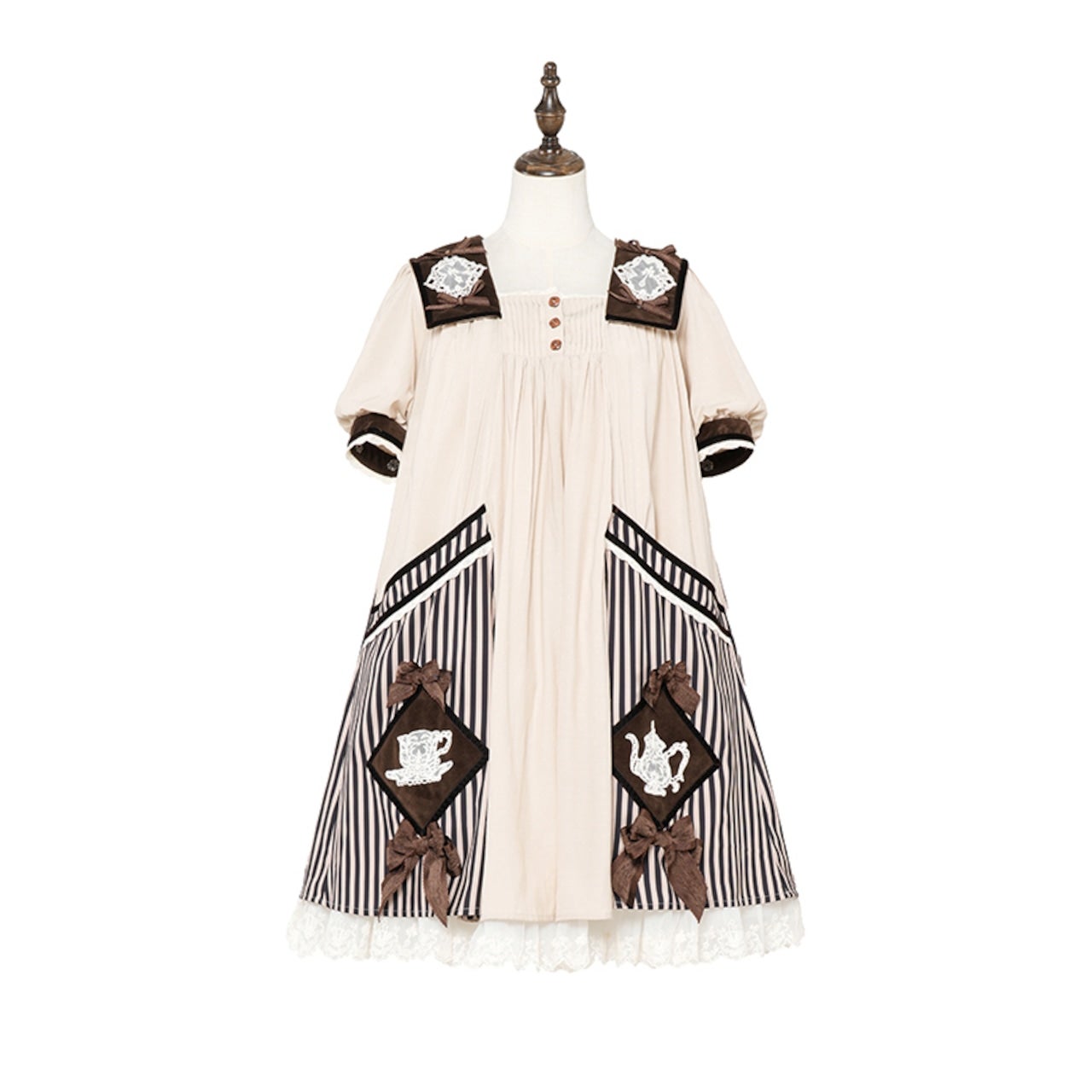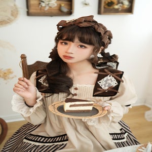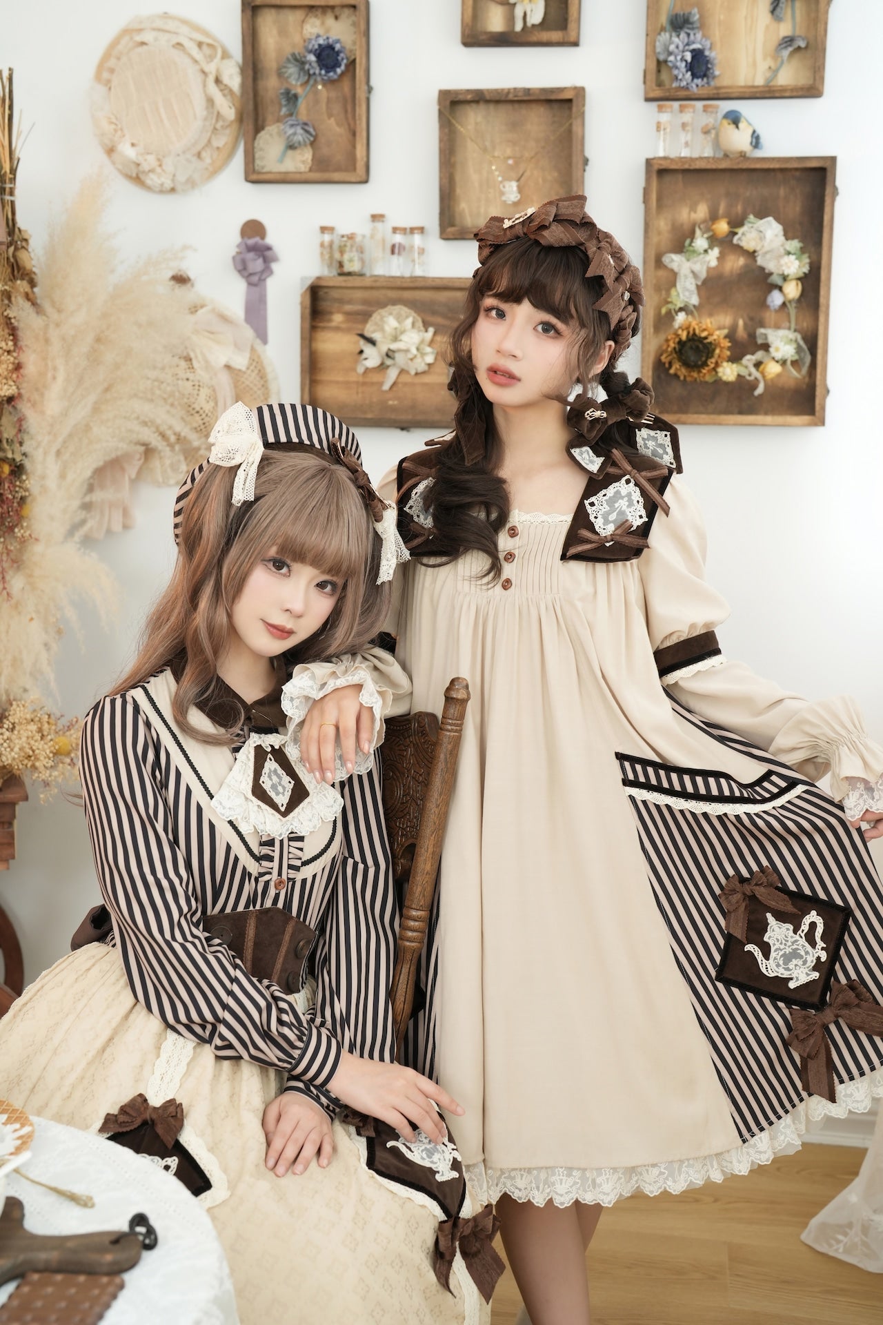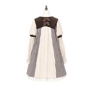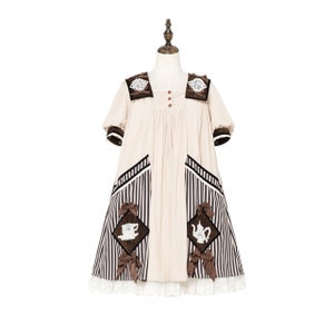 [Brand comment] When you open the door, you are tempted by the comforting aroma of coffee and sweet, fragrant sweets. Cafe Hoshibako is looking forward to welcoming you today. A dress that seems to give off the sweet, gentle aroma of cafe au lait. The cafe au lait color fabric gives off a harmony of milk and coffee. The chest has pin tucks and natural wood buttons. The chocolate color modified sailor collar is decorated with Hoshibako's original motif lace inspired by cutlery and a back ribbon. The pockets are made of the same fabric as the striped blouse and also feature motif lace inspired by Hoshibako's original tea set. You can also remove the sleeves to wear it as a short-sleeved puff-sleeved dress. Pair it with the ribbon tie, necktie, or beret from the same series for an even cuter look. Enjoy Hoshibako's cafe style.