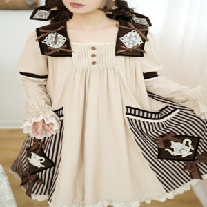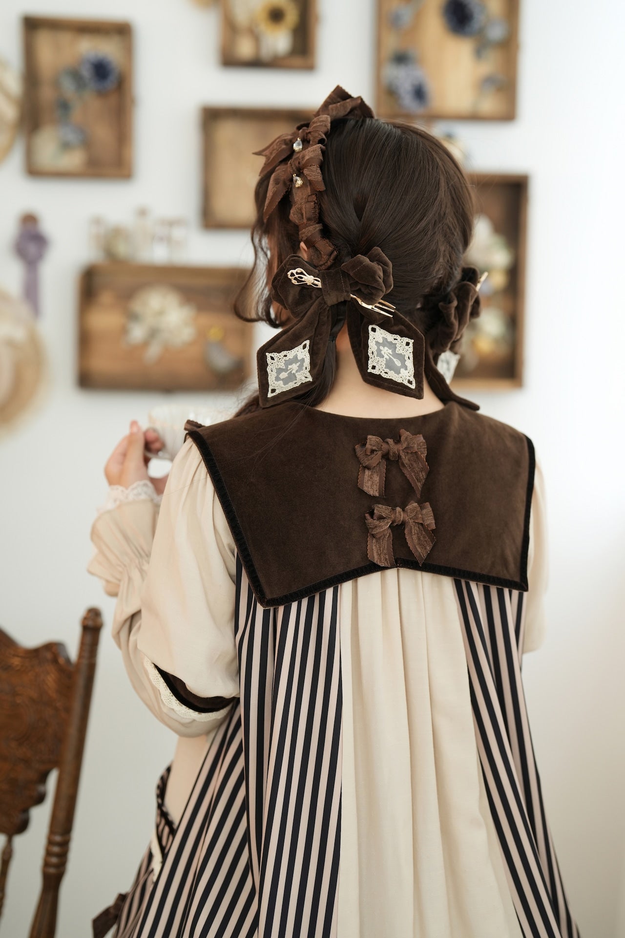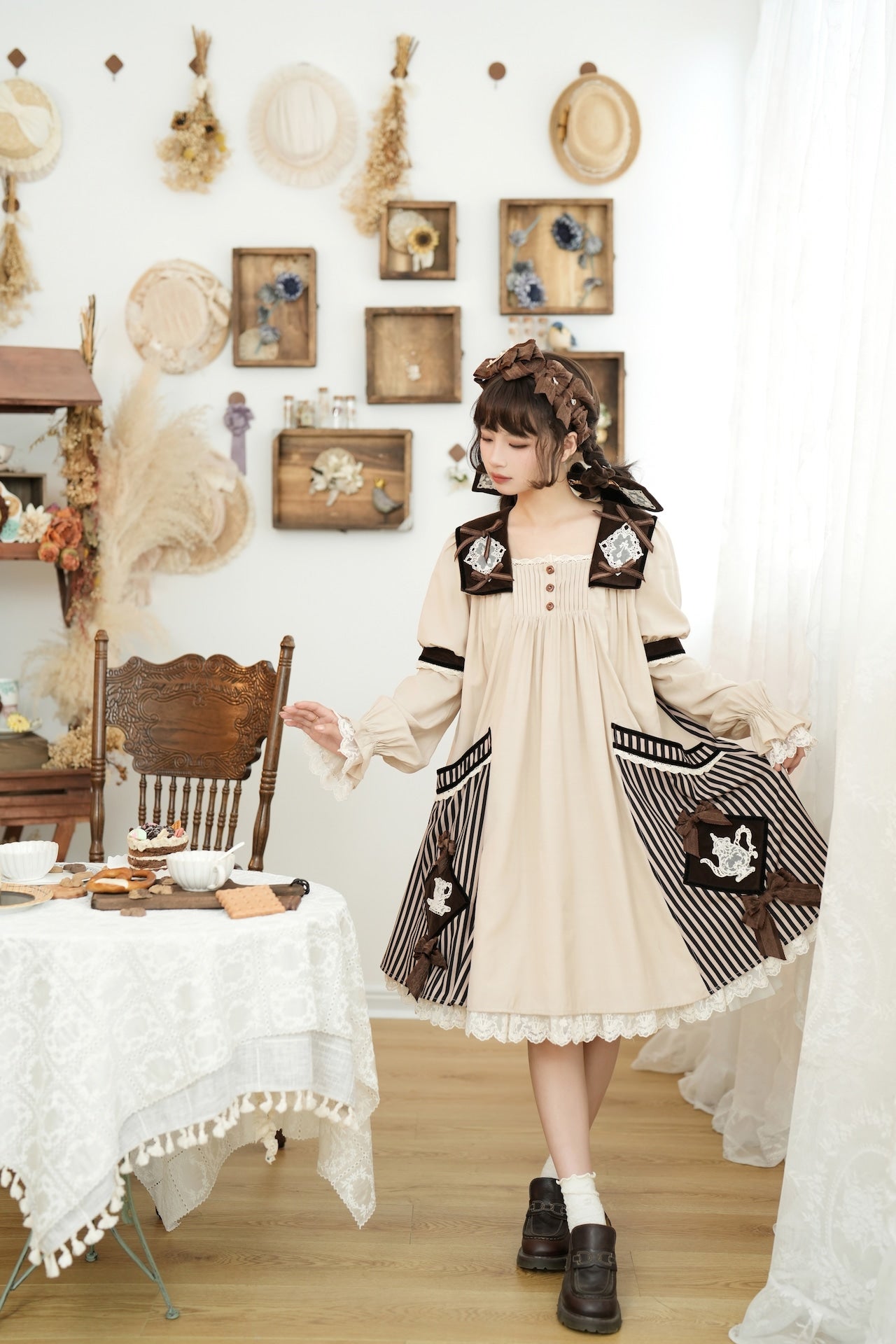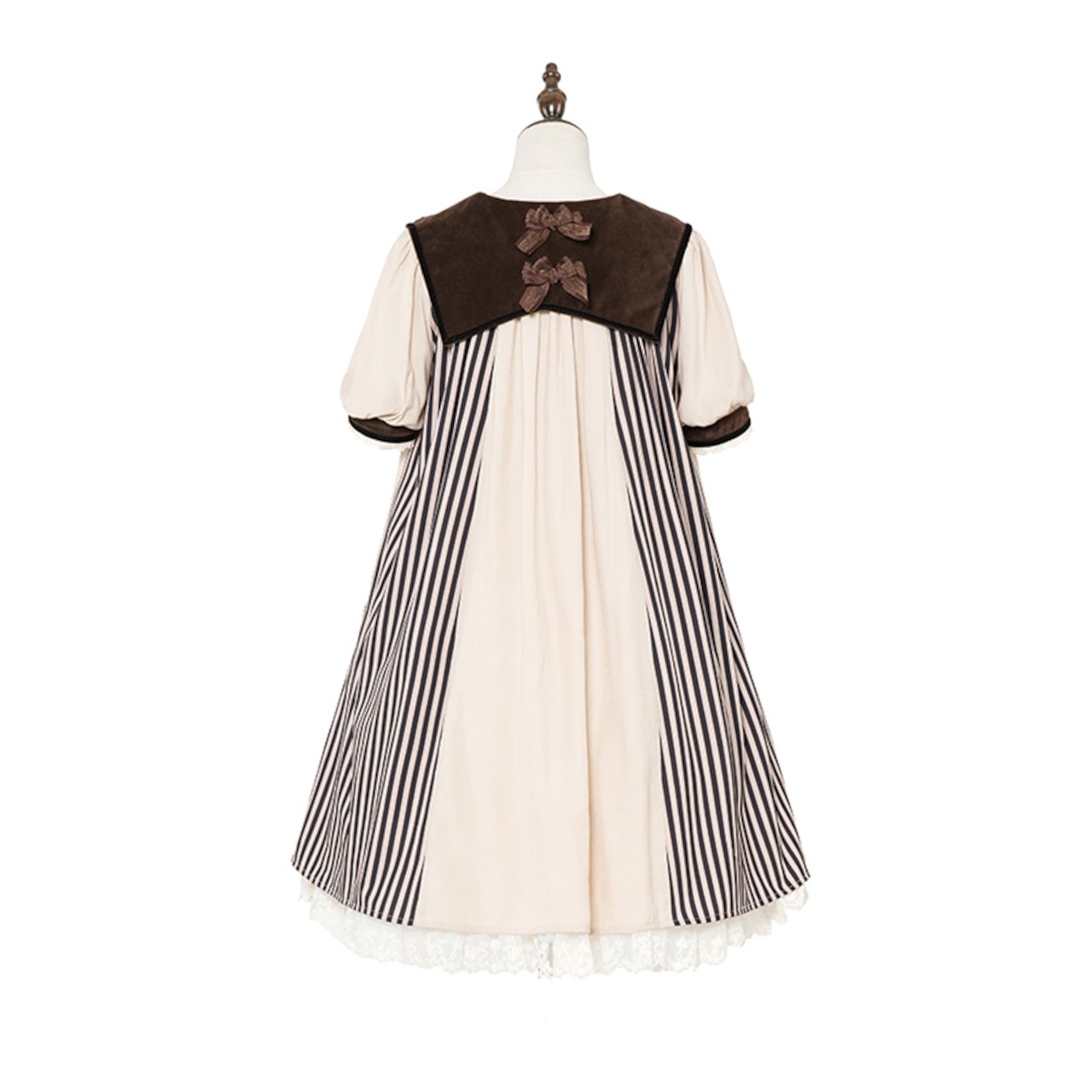 [Brand comment] When you open the door, you are tempted by the comforting aroma of coffee and sweet, fragrant sweets. Cafe Hoshibako is looking forward to welcoming you today. A dress that seems to give off the sweet, gentle aroma of cafe au lait. The cafe au lait color fabric gives off a harmony of milk and coffee. The chest has pin tucks and natural wood buttons. The chocolate color modified sailor collar is decorated with Hoshibako's original motif lace inspired by cutlery and a back ribbon. The pockets are made of the same fabric as the striped blouse and also feature motif lace inspired by Hoshibako's original tea set. You can also remove the sleeves to wear it as a short-sleeved puff-sleeved dress. Pair it with the ribbon tie, necktie, or beret from the same series for an even cuter look. Enjoy Hoshibako's cafe style.
