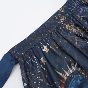 ファンタジーの世界へ飛び込んだような星と魔法陣の柄が美しい、スカーレットステラシリーズから新たなアイテムが登場✡。:* 幻想的な星々やステンドグラスのような魔方陣が美しいスカート。サテンのツヤっとした光沢感がより華やかな雰囲気を引き立てます。ウエストはゴムなのでゆったりとしたはき心地◎ところどころに輝く星のようなゴールドのレースとリボンをあしらいました。ベルトのフロント部分はレースアップ風になっていて、チャームのようなプリントも☆お手持ちの同シリーズと合わせても素敵にご着用いただけます✧