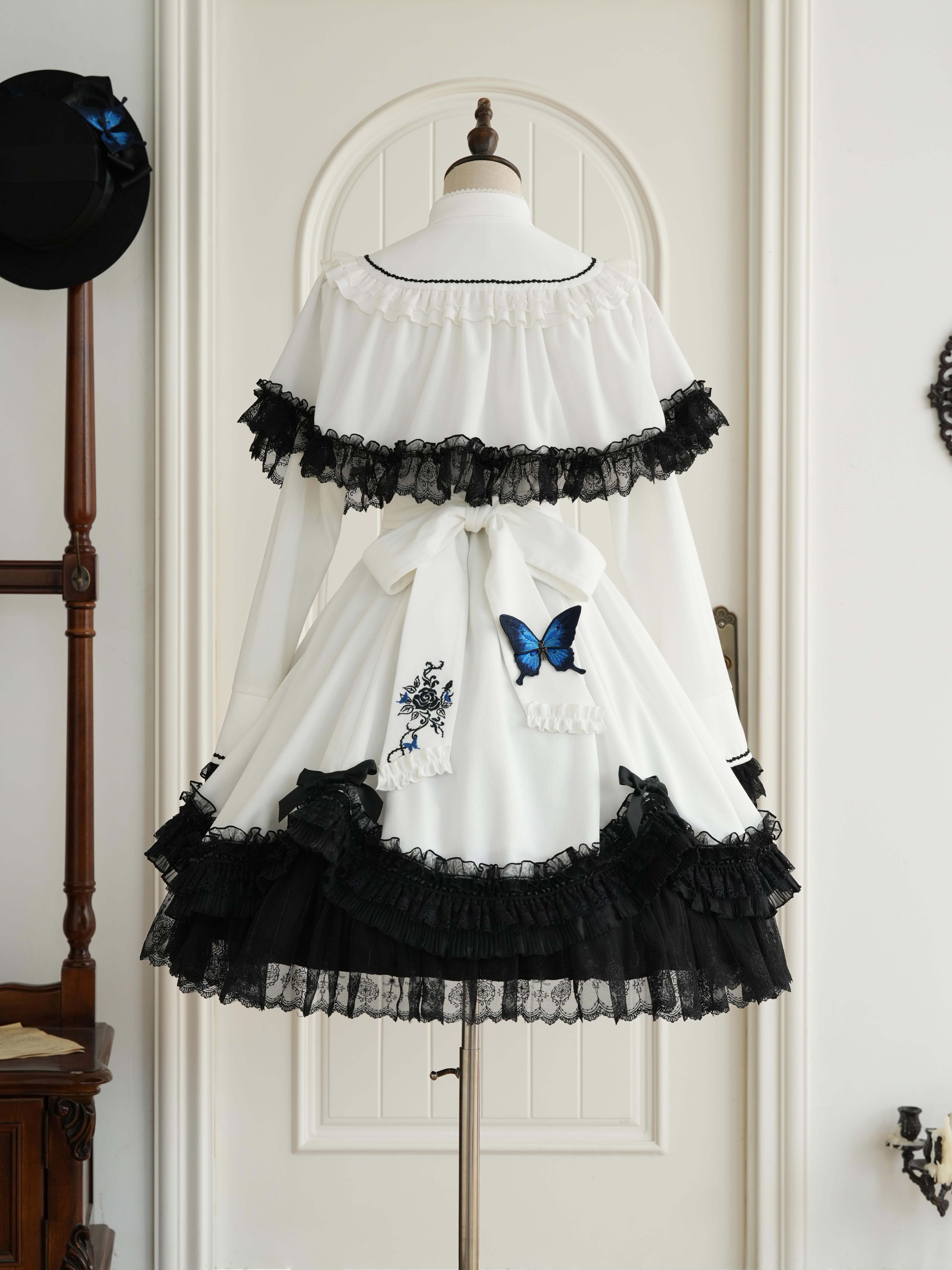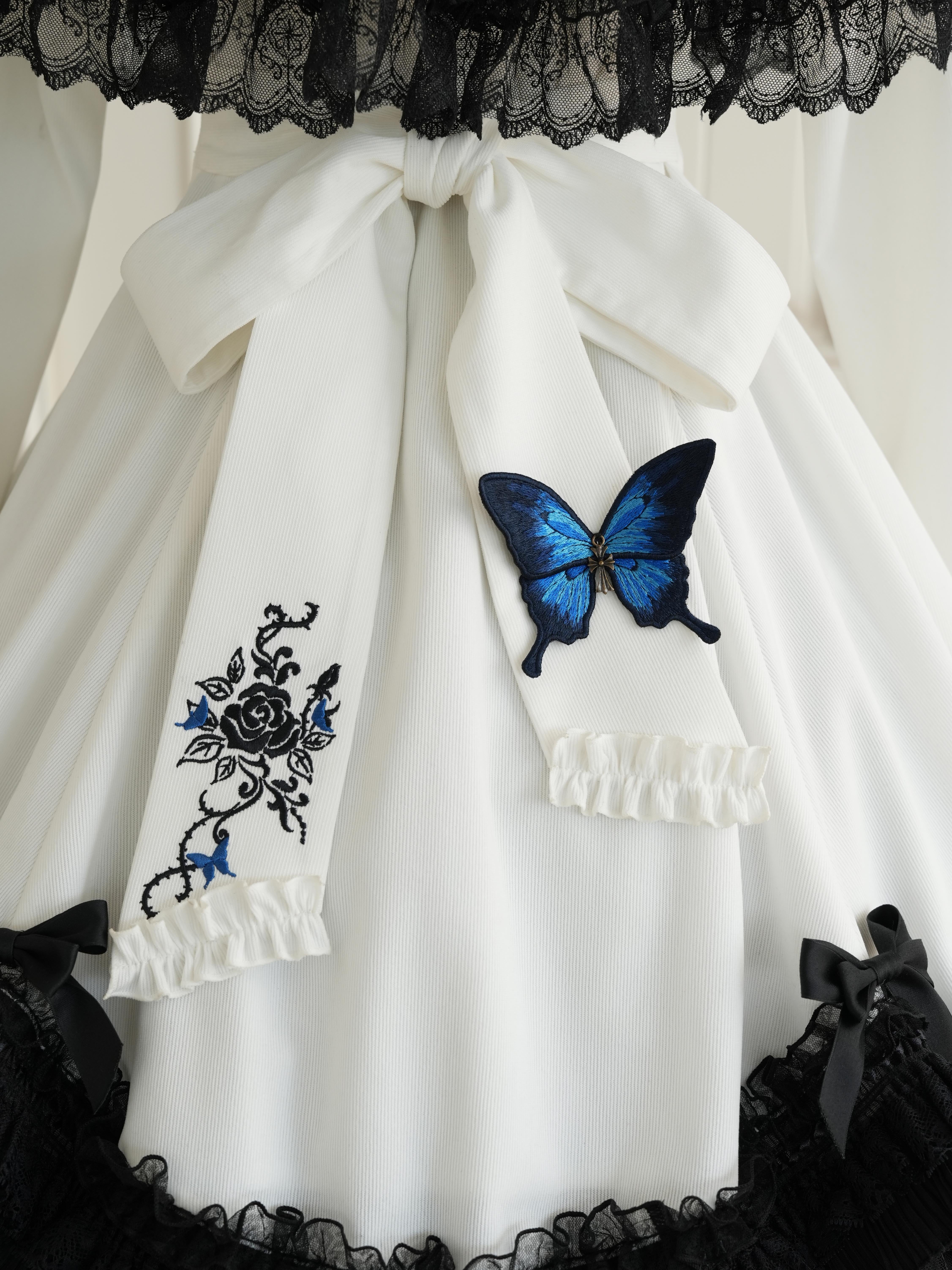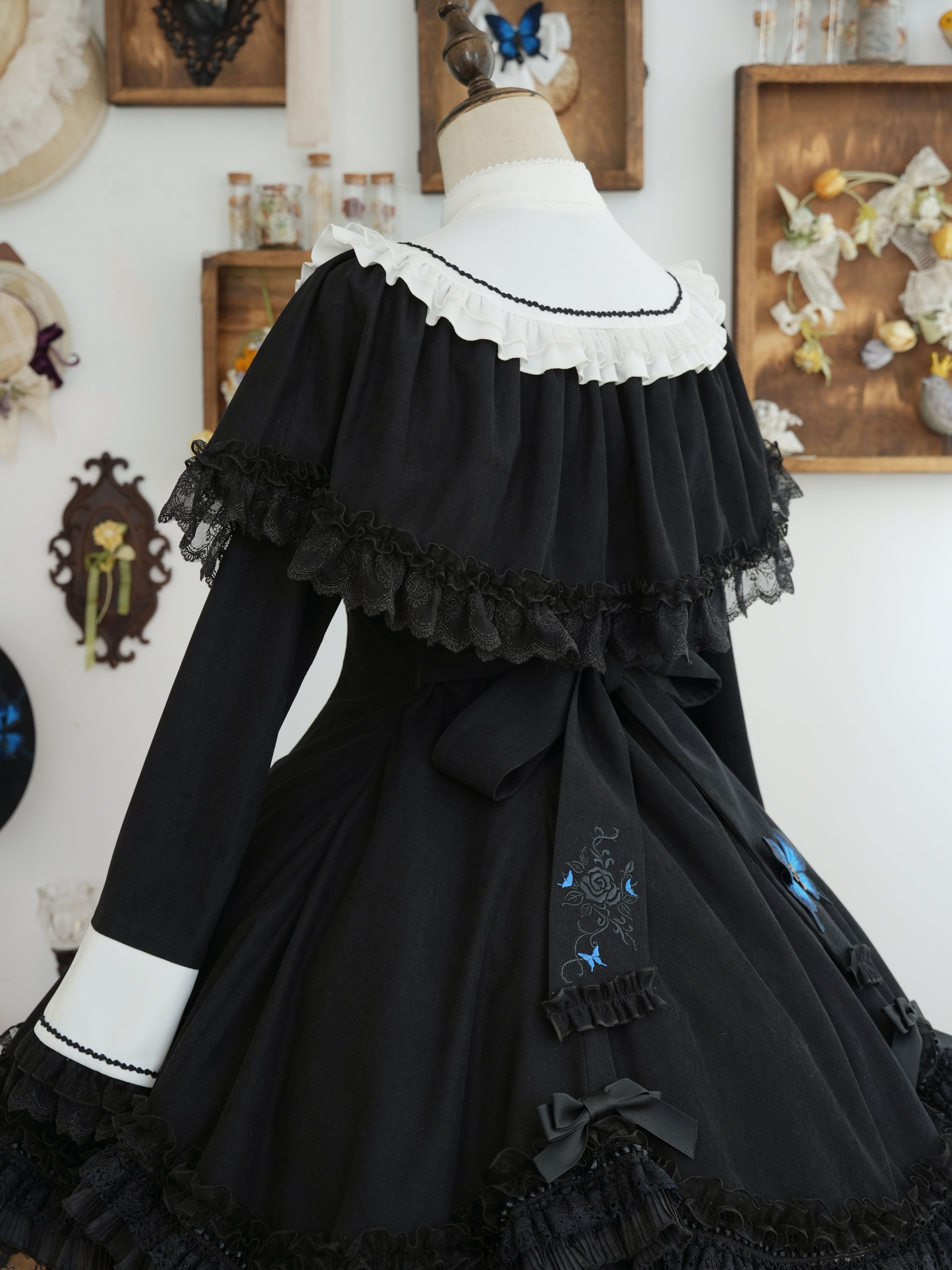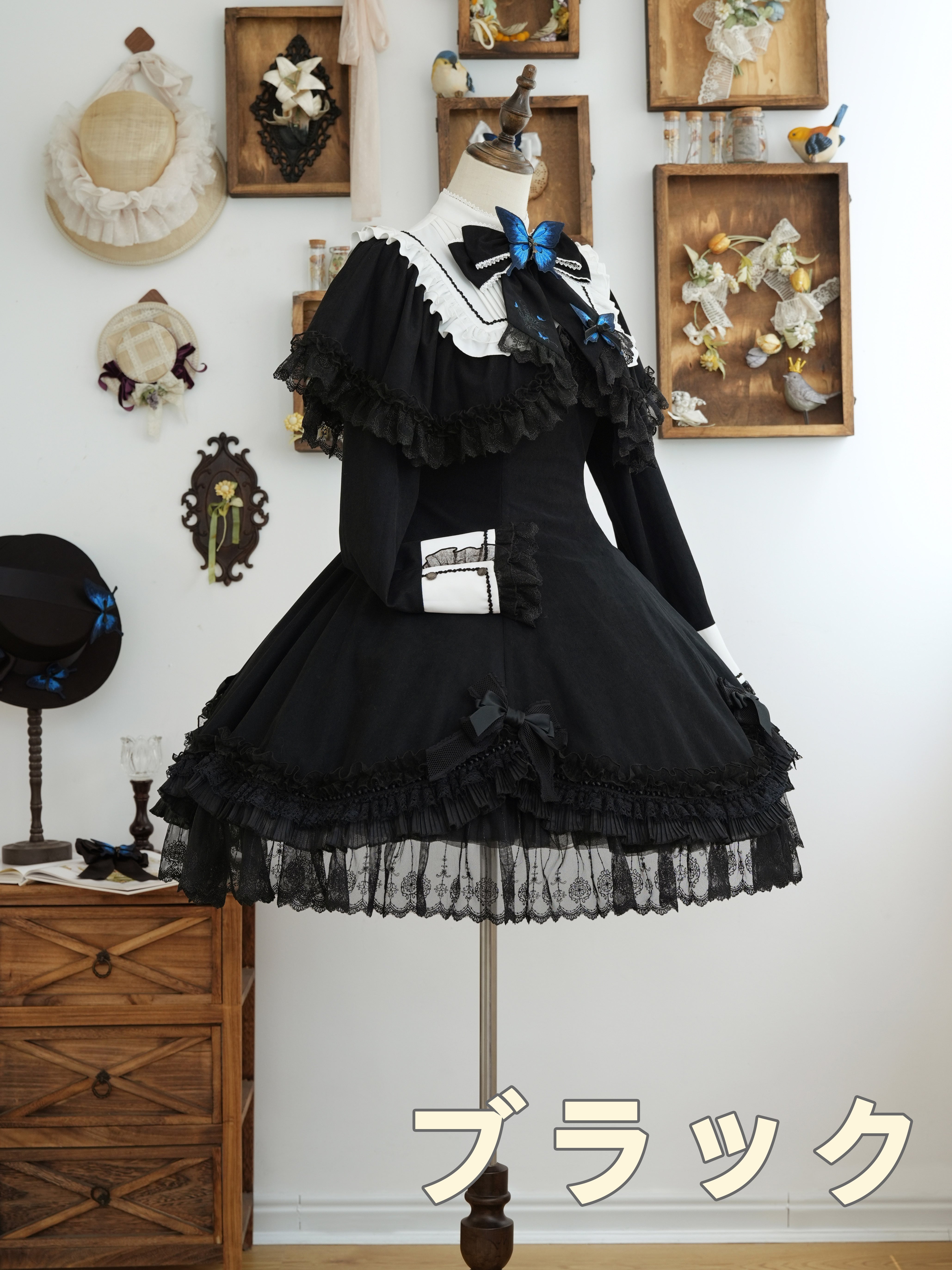 [Brand comment] "A beautiful lapis lazuli butterfly softly lands on your fingertips, resting its vibrant wings quietly." Introducing a new series featuring the cape collar and Ulysses, a vibrant blue butterfly that draws you in. A dress with a gorgeous cape collar. A silhouette with a wide, flowing skirt and a tightly cinched waistline. A large ribbon brooch on the chest, beautiful black rose embroidery on the belt, and a lapis lazuli butterfly dancing enchantingly. The cape collar and hem are generously decorated with antique-motif lace. Coordinating the whole series creates an atmosphere reminiscent of a fairy tale.