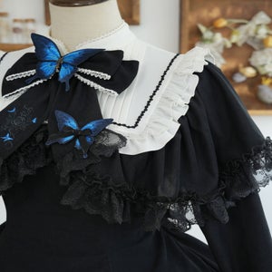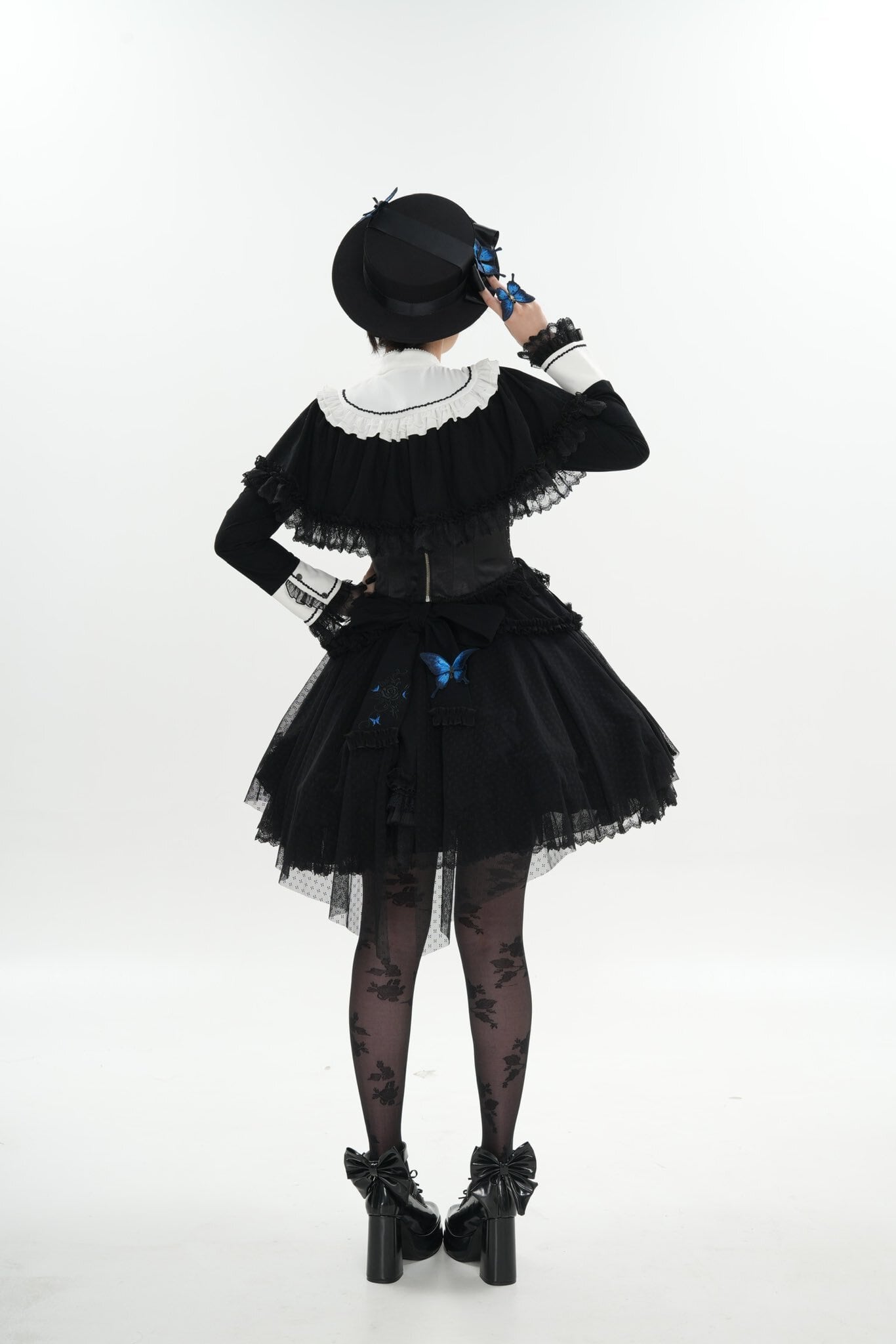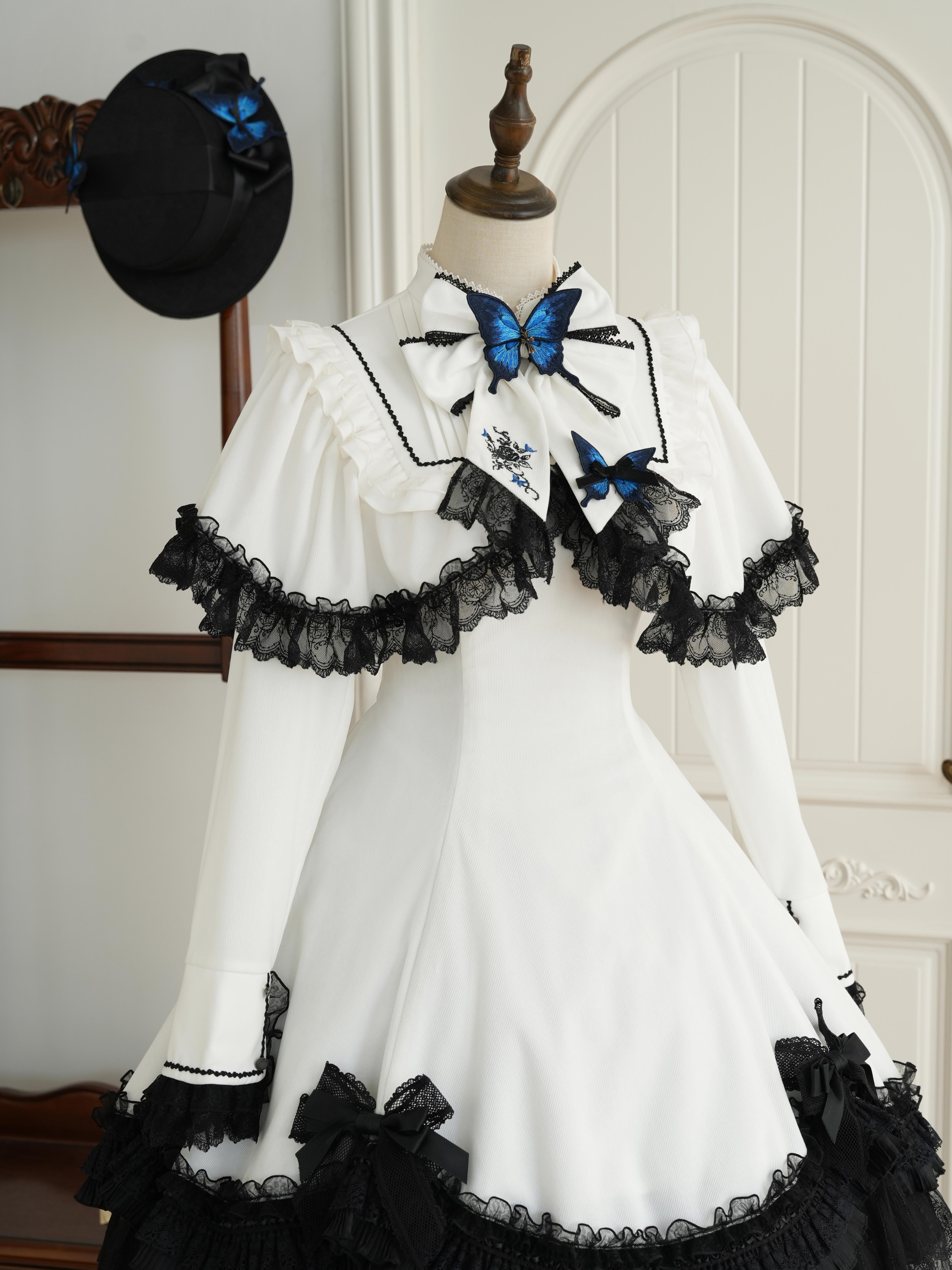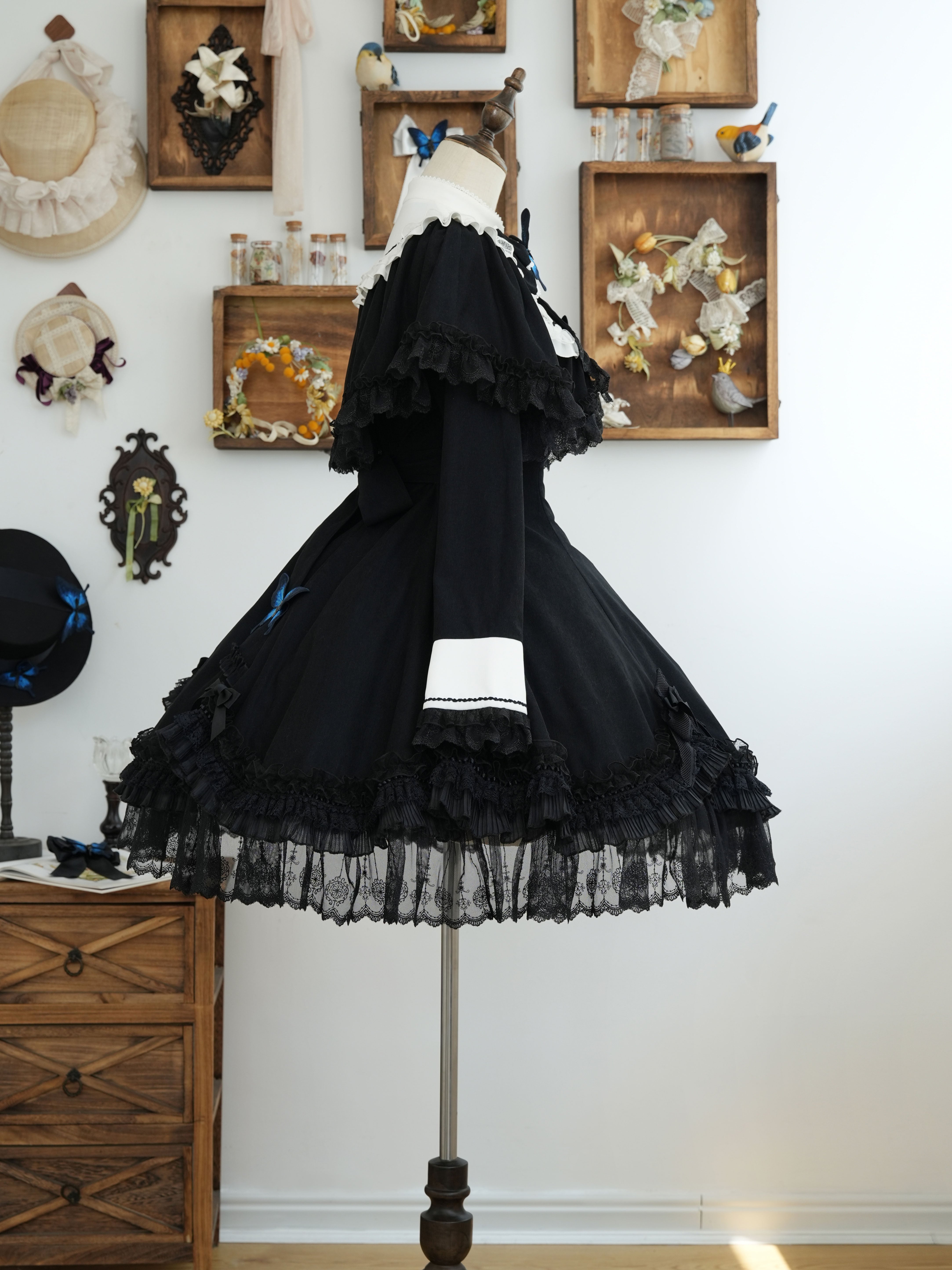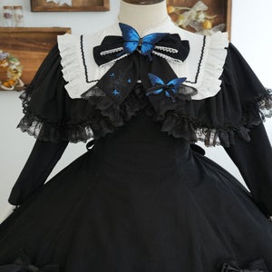 [Brand comment] "A beautiful lapis lazuli butterfly softly lands on your fingertips, resting its vibrant wings quietly." Introducing a new series featuring the cape collar and Ulysses, a vibrant blue butterfly that draws you in. A dress with a gorgeous cape collar. A silhouette with a wide, flowing skirt and a tightly cinched waistline. A large ribbon brooch on the chest, beautiful black rose embroidery on the belt, and a lapis lazuli butterfly dancing enchantingly. The cape collar and hem are generously decorated with antique-motif lace. Coordinating the whole series creates an atmosphere reminiscent of a fairy tale.