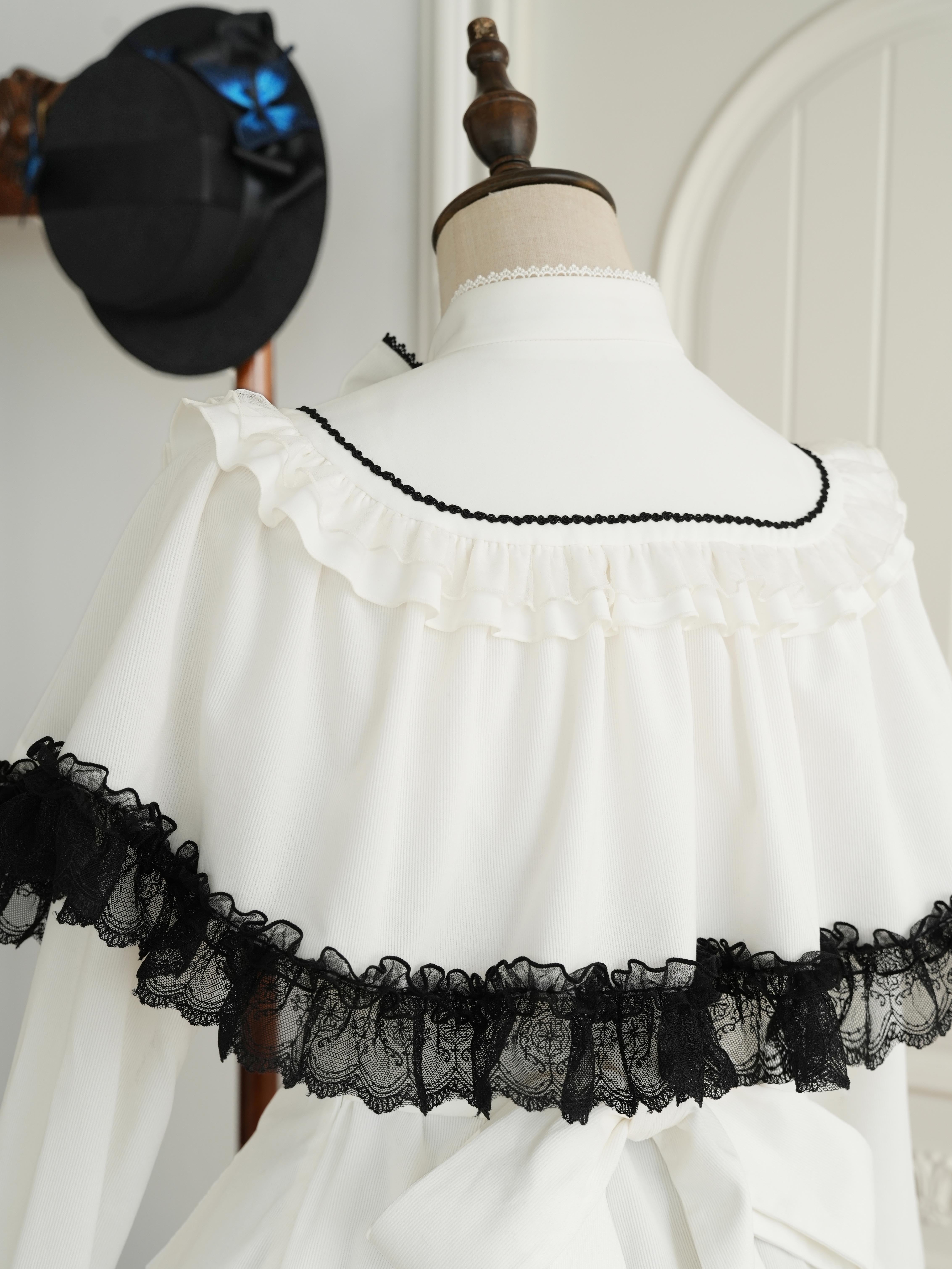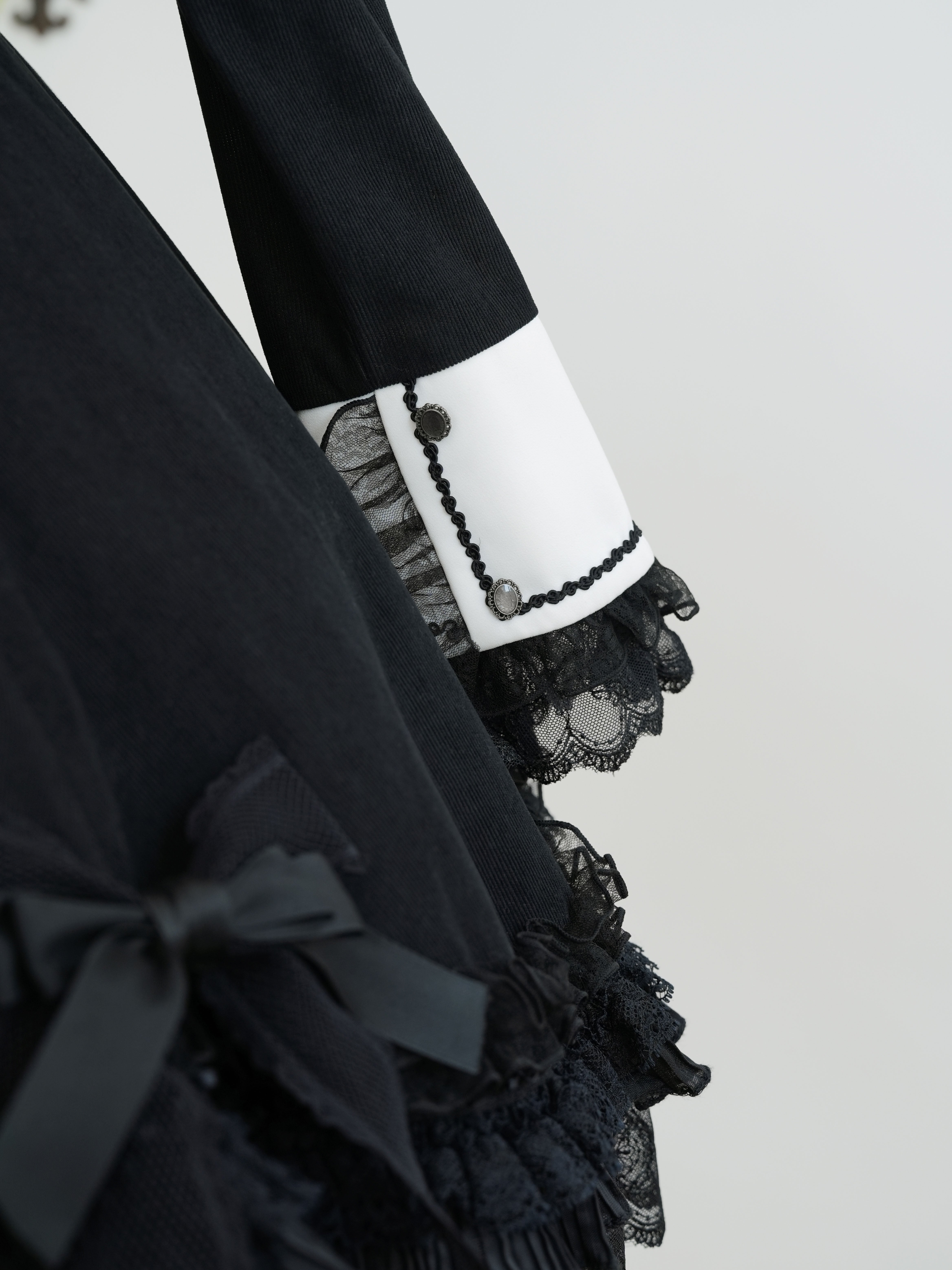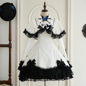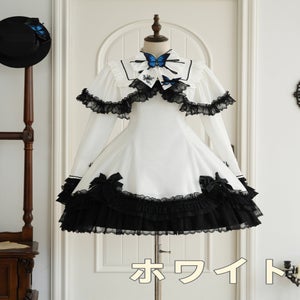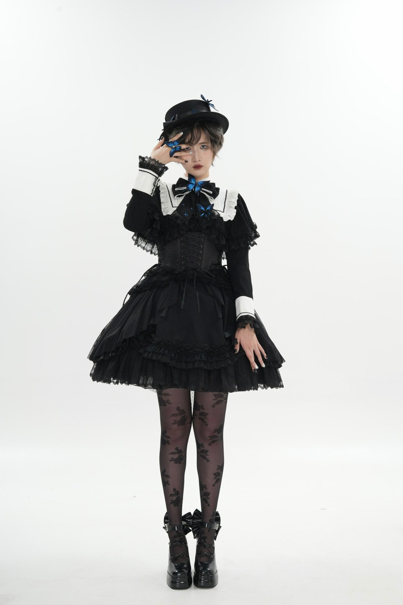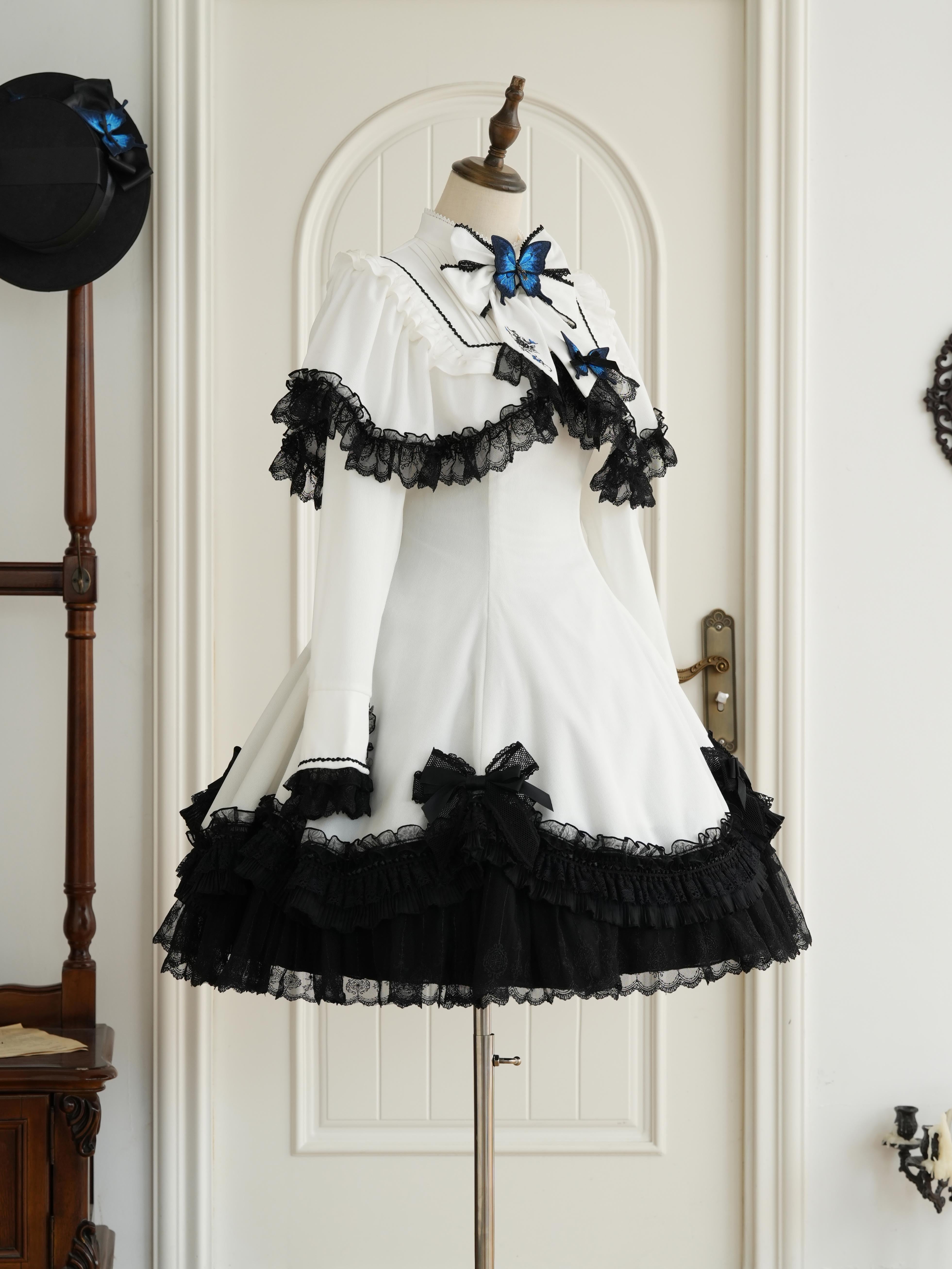 [Brand comment] "A beautiful lapis lazuli butterfly softly lands on your fingertips, resting its vibrant wings quietly." Introducing a new series featuring the cape collar and Ulysses, a vibrant blue butterfly that draws you in. A dress with a gorgeous cape collar. A silhouette with a wide, flowing skirt and a tightly cinched waistline. A large ribbon brooch on the chest, beautiful black rose embroidery on the belt, and a lapis lazuli butterfly dancing enchantingly. The cape collar and hem are generously decorated with antique-motif lace. Coordinating the whole series creates an atmosphere reminiscent of a fairy tale.