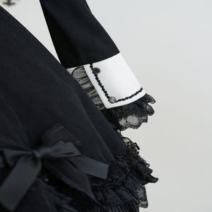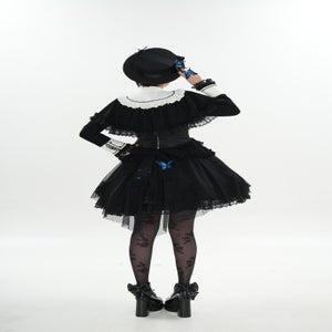 深く吸い込まれるような鮮やかな青い蝶ーユリシスーをあしらったシリーズが登場。ケープカラーが華やかなワンピース。大きく広がるスカートときゅっと絞ったウエストラインのシルエット。胸元の大きなリボンブローチ、ベルトには美しい黒薔薇の刺繍と、瑠璃色の蝶が妖しく舞います。ケープカラーや裾にはアンティークモチーフのレースをたっぷりとあしらいました。シリーズでコーディネートしていただくと、まるで御伽噺のような雰囲気に。