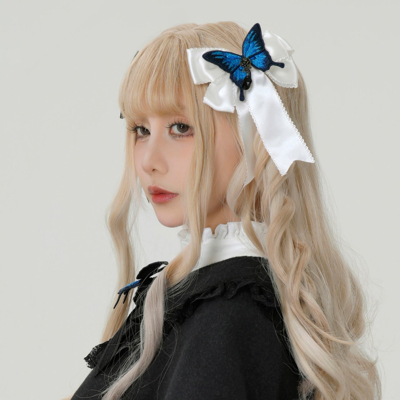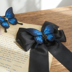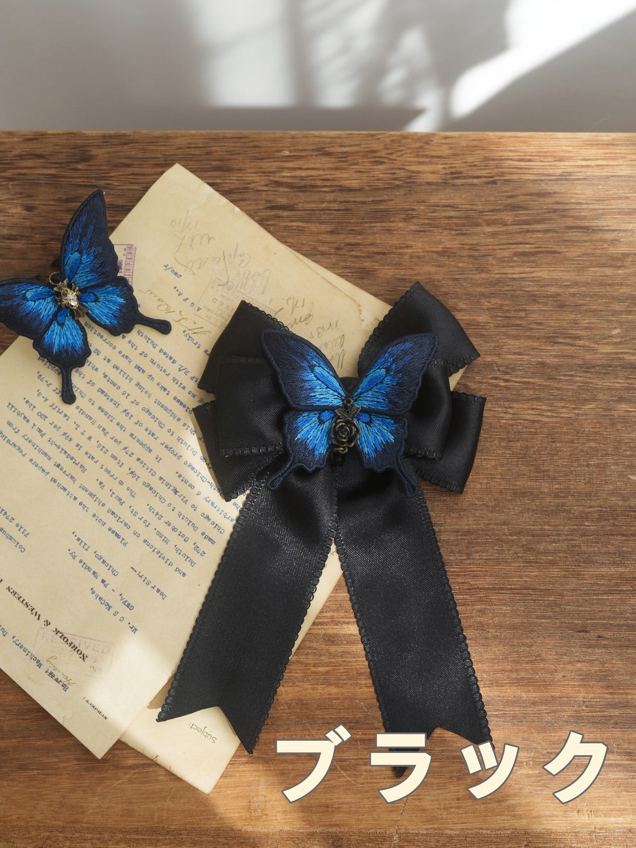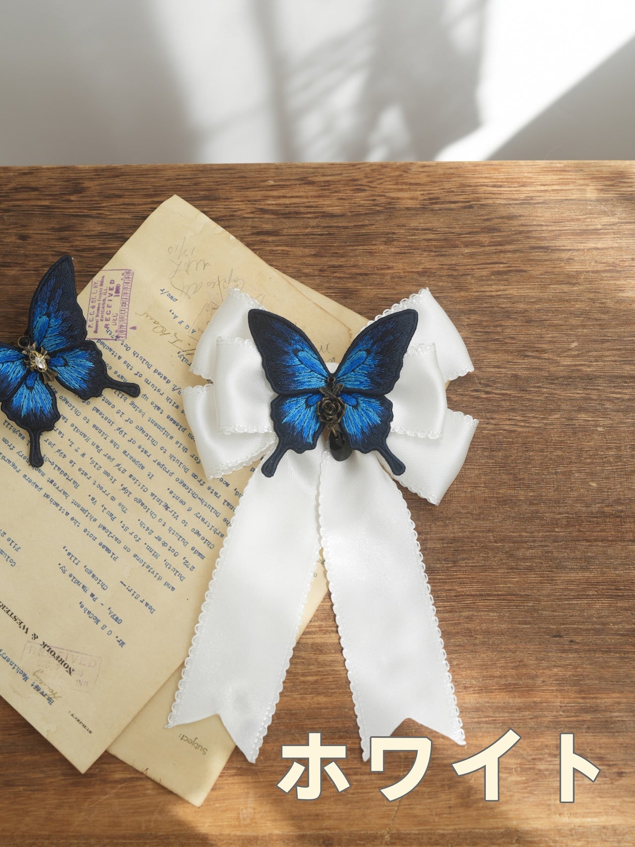 [Brand comment] "A beautiful lapis lazuli butterfly gently lands on your fingertips, resting its vibrant wings quietly." Introducing a new series featuring the captivating, vibrant blue butterfly, Ulysses. This clip is meticulously embroidered down to the delicate pattern of the wings. The glossy wings feature an intricate gradation from black to lapis lazuli. It pairs perfectly with the ribbon with a soft, lustrous scalloped border. *This butterfly cannot be removed. As it is a clip, it can also be used as an accessory. Coordinating the whole series will create an atmosphere reminiscent of a fairy tale.