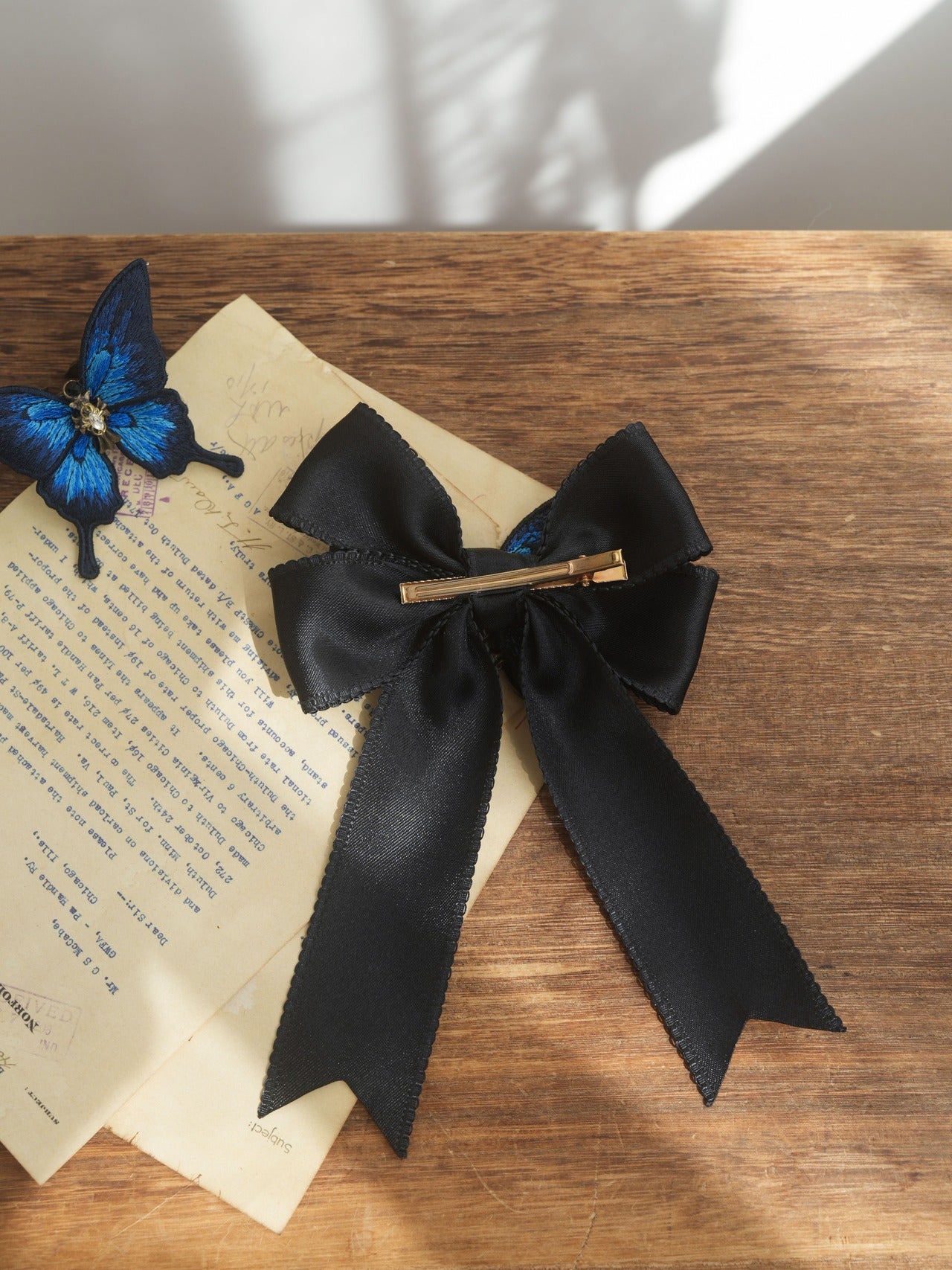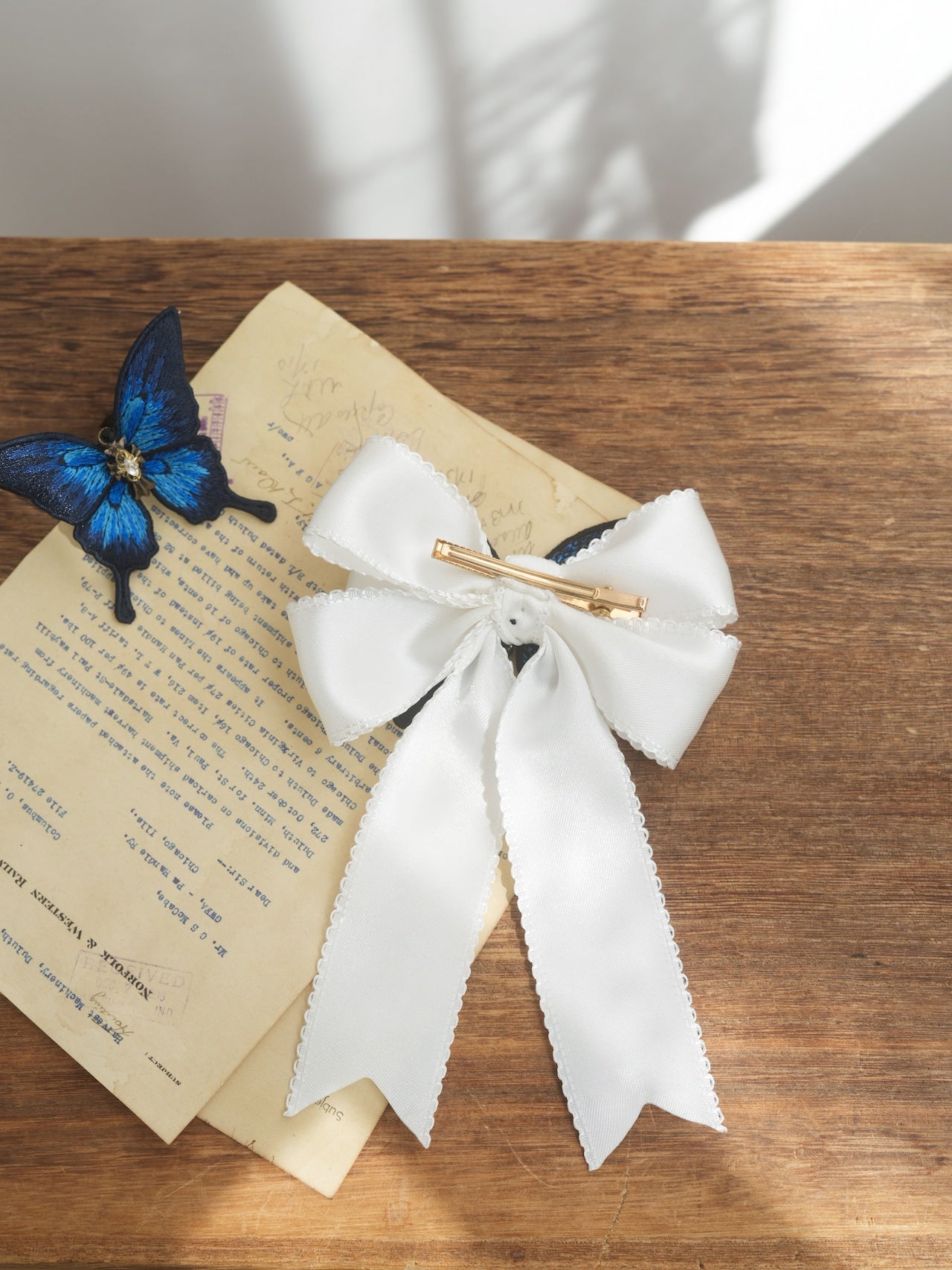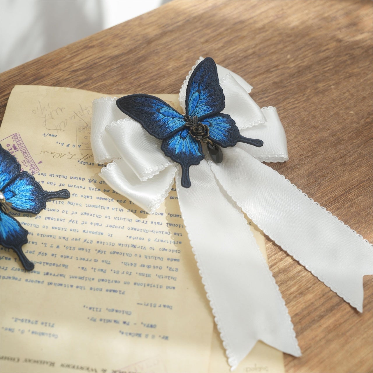 [Brand comment] "A beautiful lapis lazuli butterfly gently lands on your fingertips, resting its vibrant wings quietly." Introducing a new series featuring the captivating, vibrant blue butterfly, Ulysses. This clip is meticulously embroidered down to the delicate pattern of the wings. The glossy wings feature an intricate gradation from black to lapis lazuli. It pairs perfectly with the ribbon with a soft, lustrous scalloped border. *This butterfly cannot be removed. As it is a clip, it can also be used as an accessory. Coordinating the whole series will create an atmosphere reminiscent of a fairy tale.