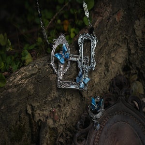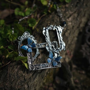 [Brand comment] "A beautiful lapis lazuli butterfly gently lands on your fingertip, resting its vibrant wings in silence." Introducing a necklace made up of three antique frames. The dreamy blue butterflies fluttering about create a world view that is like a scene from a story. The black beads and ornamental silver parts that adorn the chain give it an air of luxury. Each frame has a delicate design reminiscent of medieval European sculpture, creating a classical and romantic atmosphere. It pairs perfectly with Lolita fashion and Gothic styles, and will add a touch of glamour to your chest.