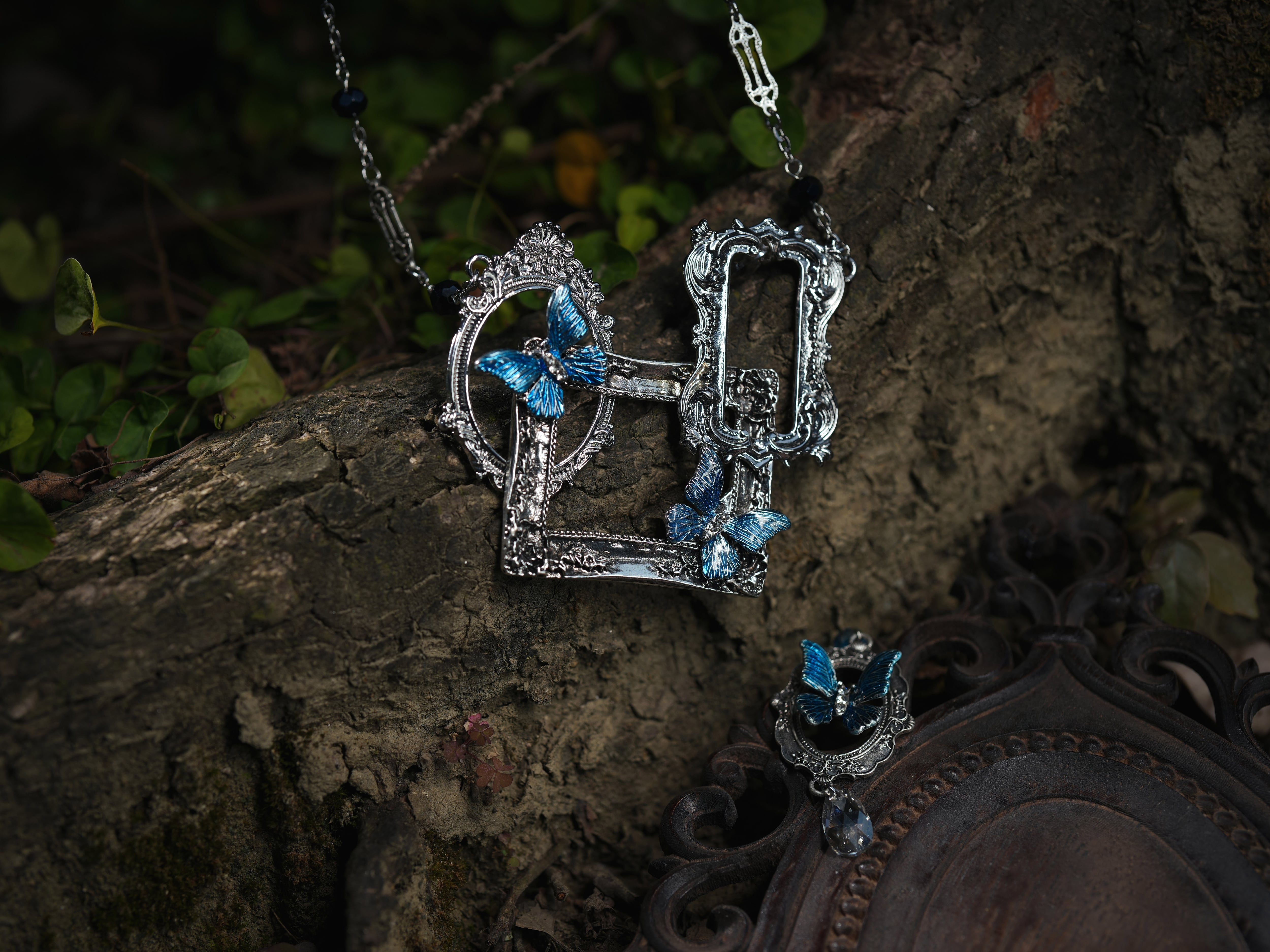 三つのアンティークフレームが連なるネックレスの登場。幻想的なブルーの蝶が舞い、まるで物語の一場面のような世界観を演出します。チェーンを彩るブラックのビーズとオーナメントのようなシルバーパーツが高級感を漂わせます。フレームはそれぞれ中世ヨーロッパの彫刻のような繊細なデザイン。クラシカルかつロマンティックな雰囲気に。ロリータファッションやゴシックスタイルとの相性は抜群で、胸元を華やかに飾ります。