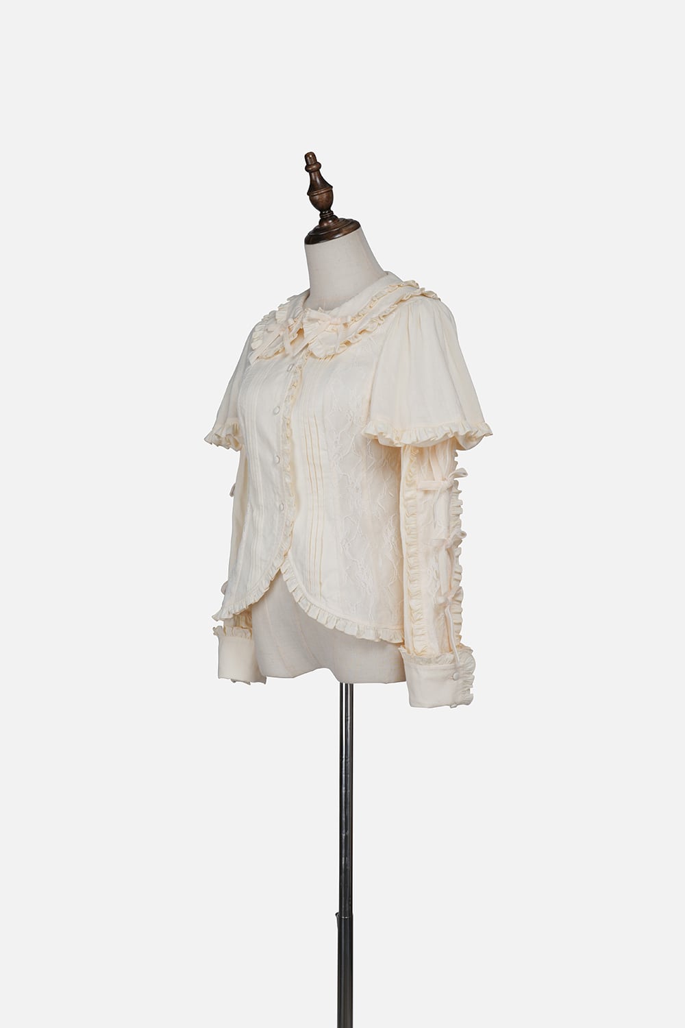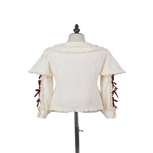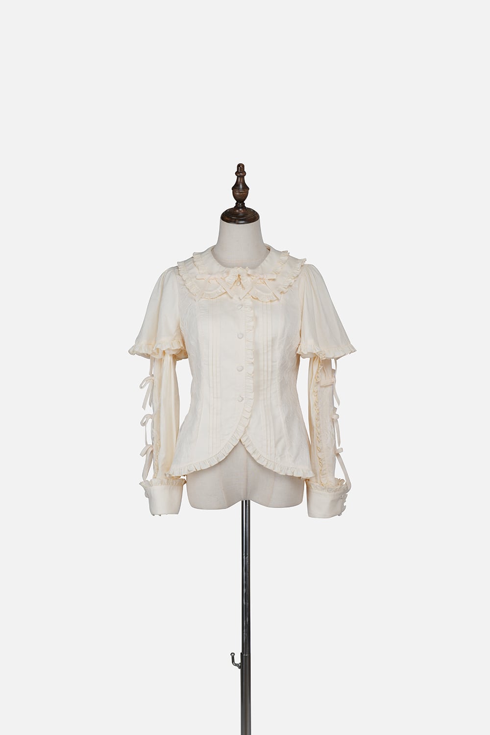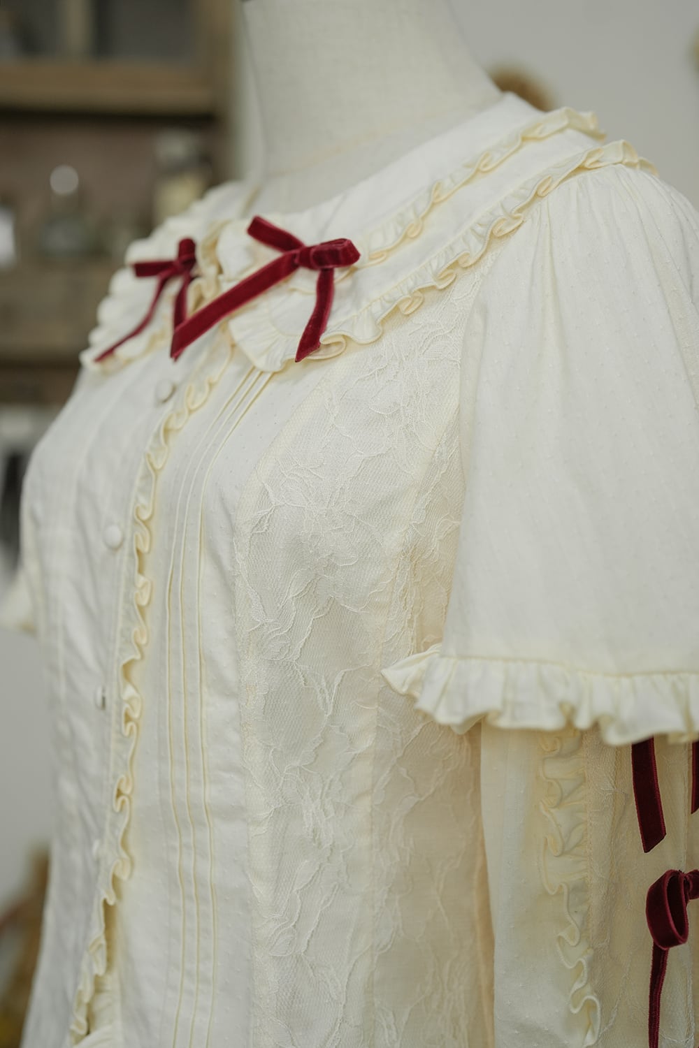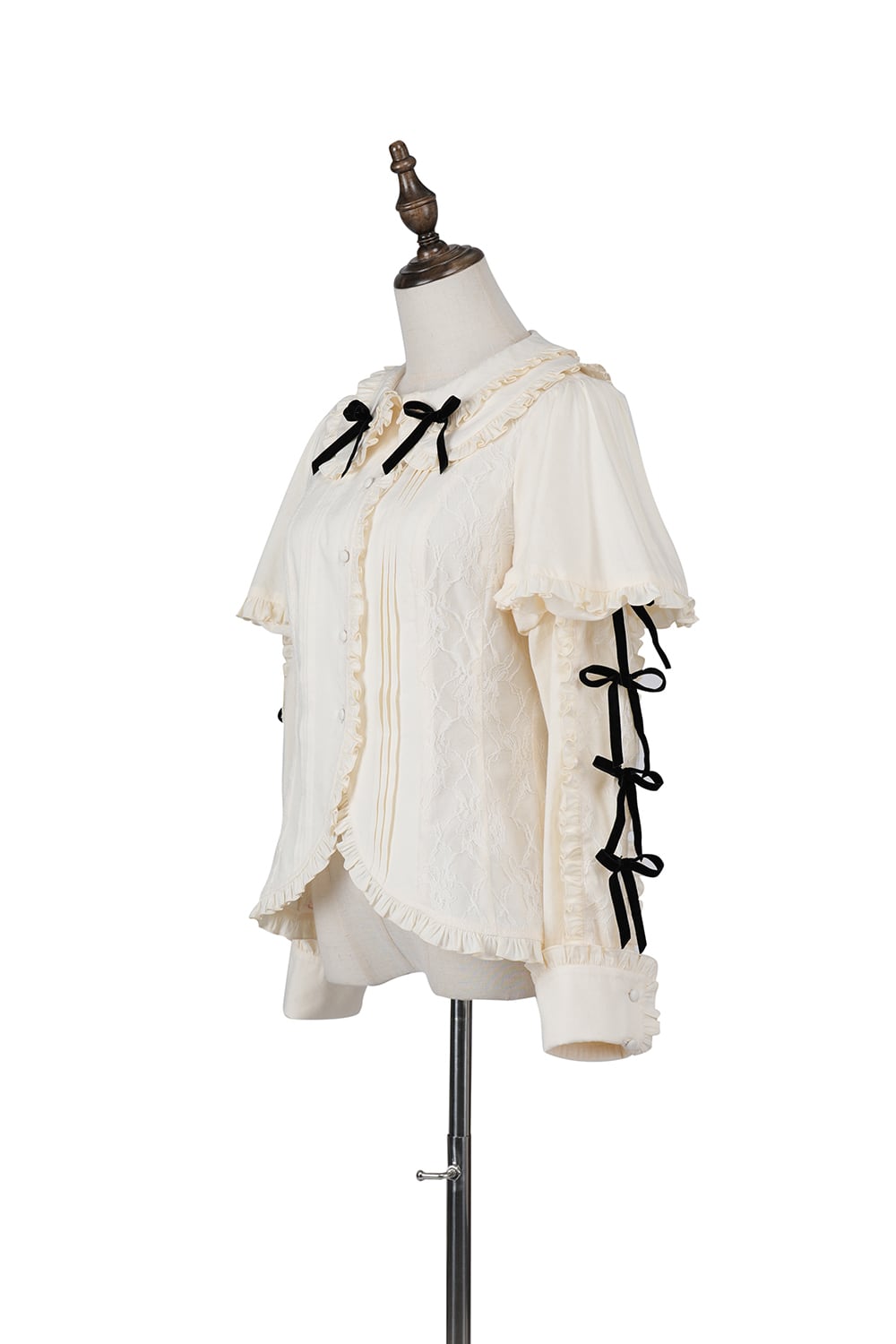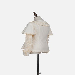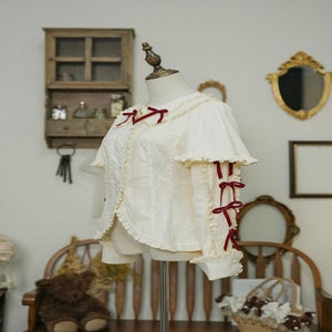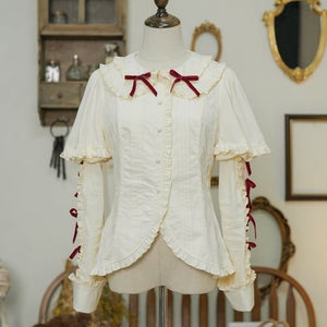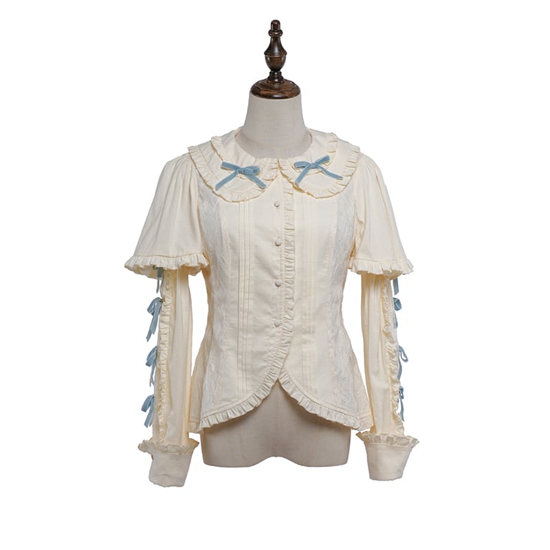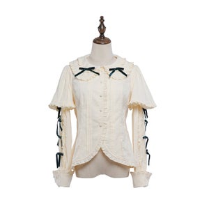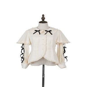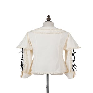 [Brand comment] Introducing the Western Doll Magic Series, this blouse combines the elegance of an antique doll with a touch of cute charm. This blouse is both elegant and cute. The matching ruffles add a touch of cuteness to any outfit, even if it looks simple. The peek-a-boo lace adds a stylish touch. The soft sleeves also help to cover your upper arms. The off-white fabric is easy to coordinate with a variety of outfits, and you can choose from three ribbon colors. *All ribbons are non-removable. Enjoy pairing it with the skirts, jumper skirts, and capes from the same series, as well as your existing outfits.
