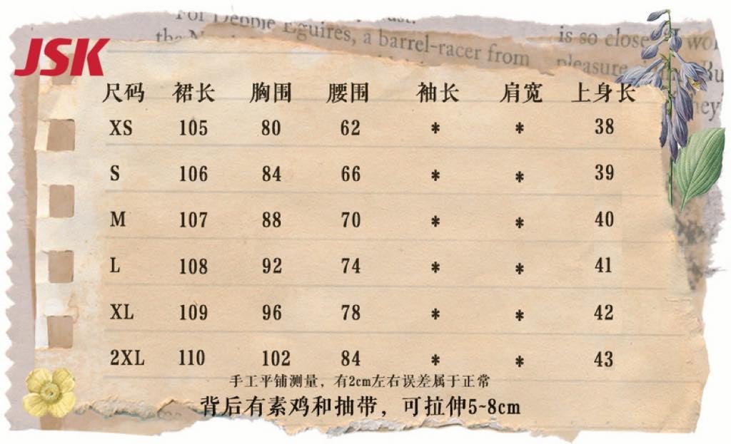 Measurements are taken manually; a deviation of ±2 cm is normal.There is shirring and lacing in the back, which allows for 5–8 cm of stretch.