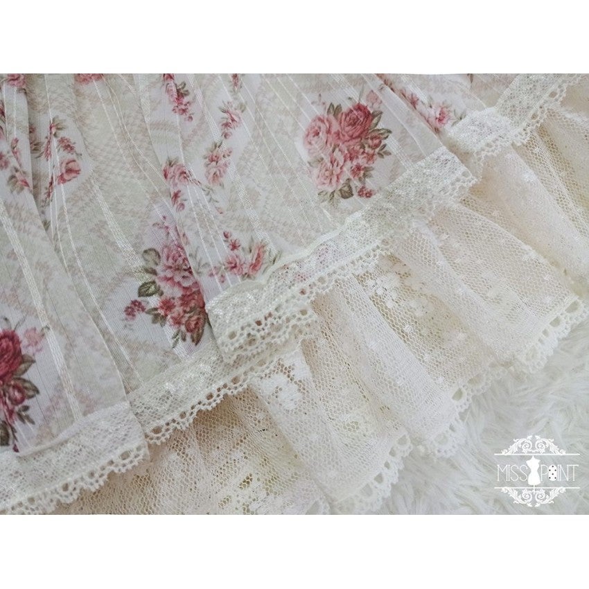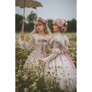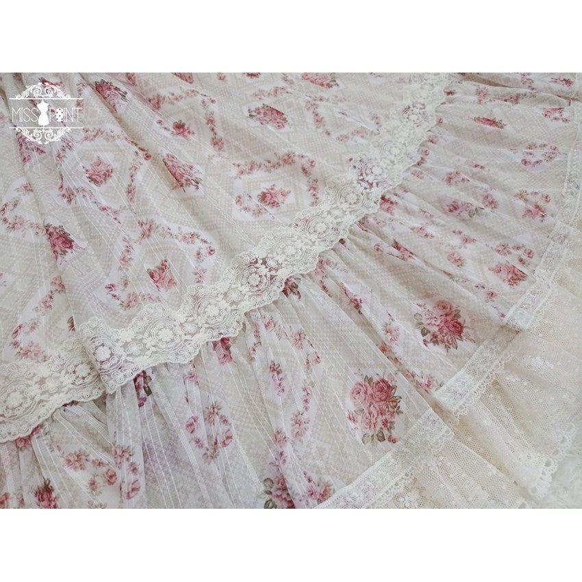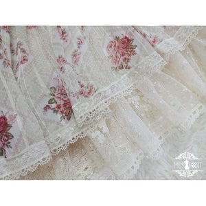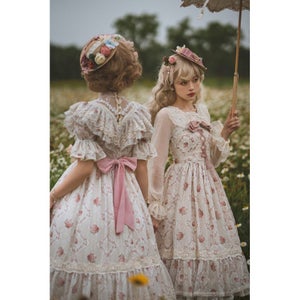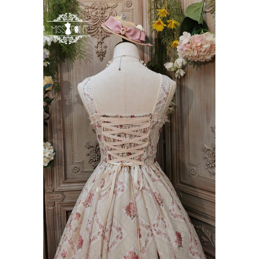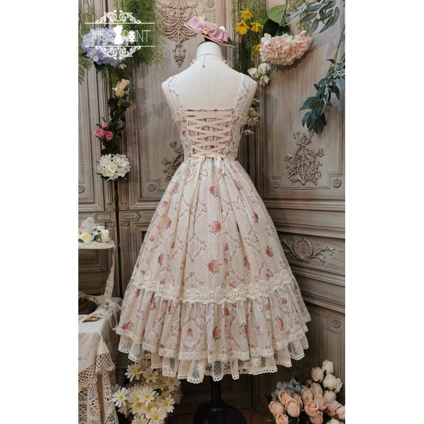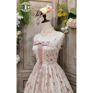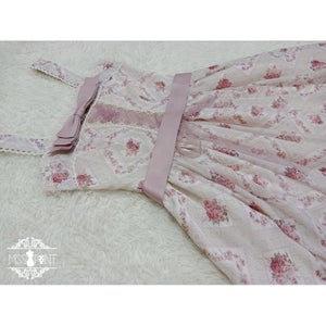 Features: This floral Lolita jumper dress features full of floral print, lace-up front, and lace shoulder. There is a waist tie that can modify your waist better.
