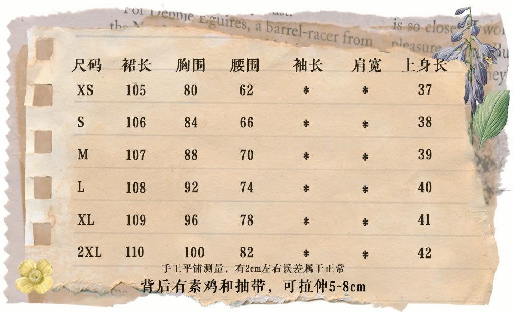 Measurements are taken flat by hand; an error margin of ±2 cm is normal.Back has shirring and lacing, allowing 5–8 cm of stretch.