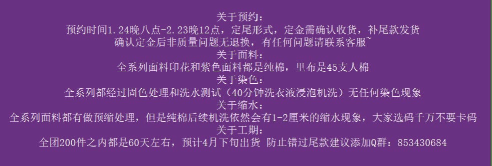 All fabrics in the series have been pre-shrunk. However, 100% cotton may still shrink by 1-2 cm with subsequent machine washing. Please do not choose your size too tightly.