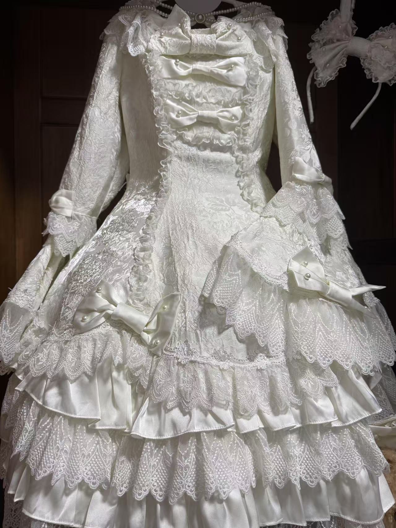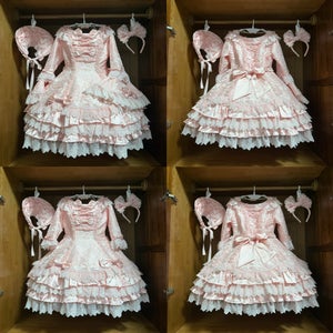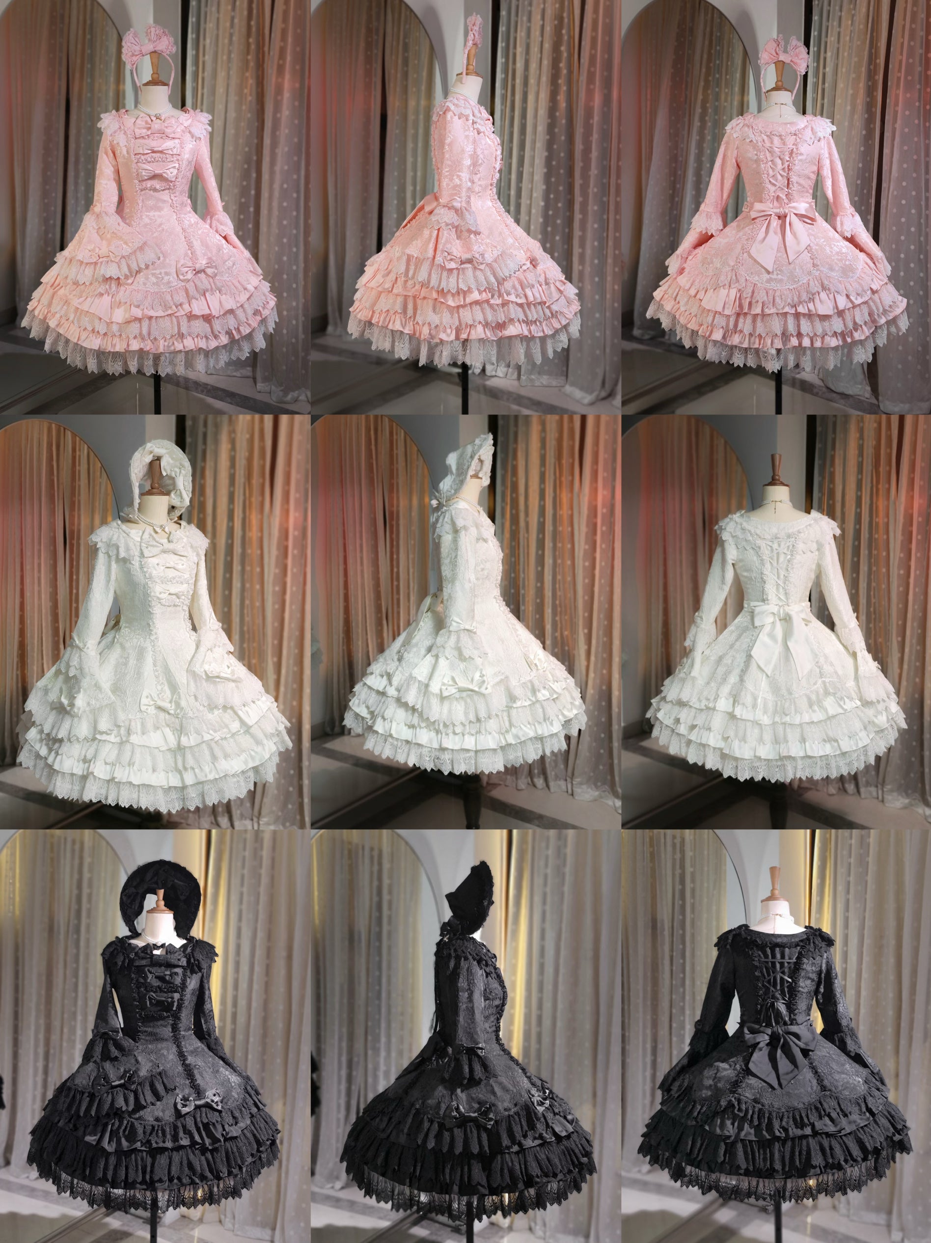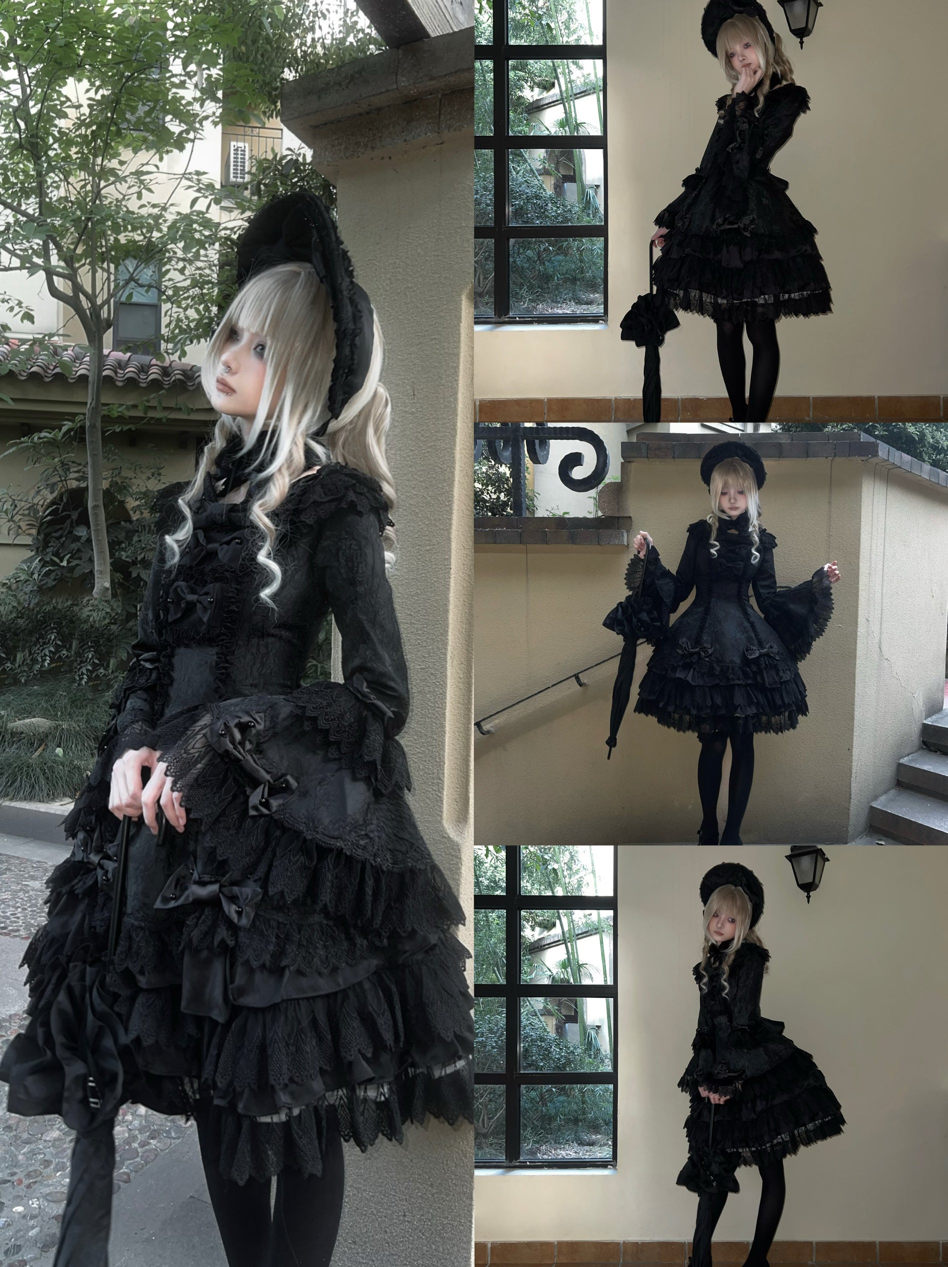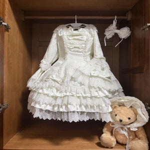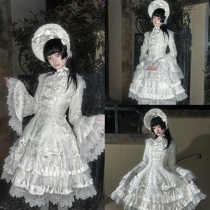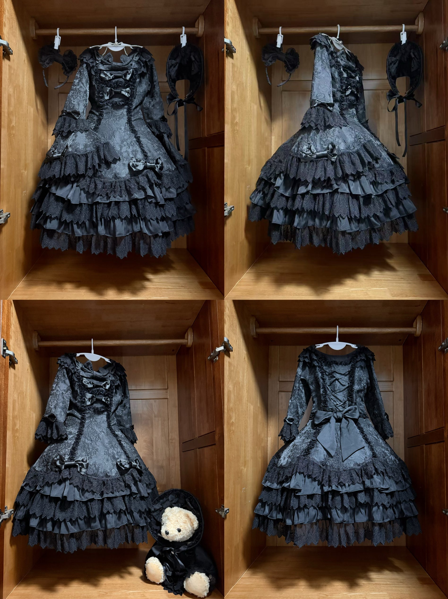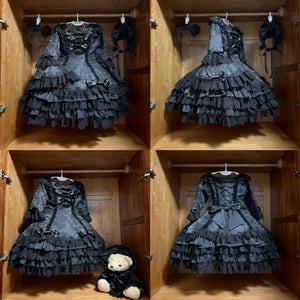 This one-piece dress with numerous elaborate lace layers that shows the retro Victorian style. The back straps can shape the beautiful body line, and multiple bows decorate the grace theme. It is impressive to match with the same series accessories.The fabric is a dark embossed polyester with a pearlized dark pattern, which has a slight shimmer in daylight. The embossed weaving process gives the fabric a rich texture. It is thick yet breathable. Its weight makes it more suitable for spring, fall, and winter wear. The lining is 45-count rayon. The dress is beaded, so be cautious when machine-washing.