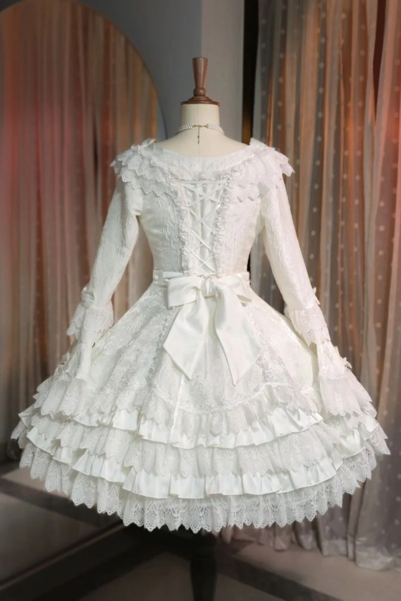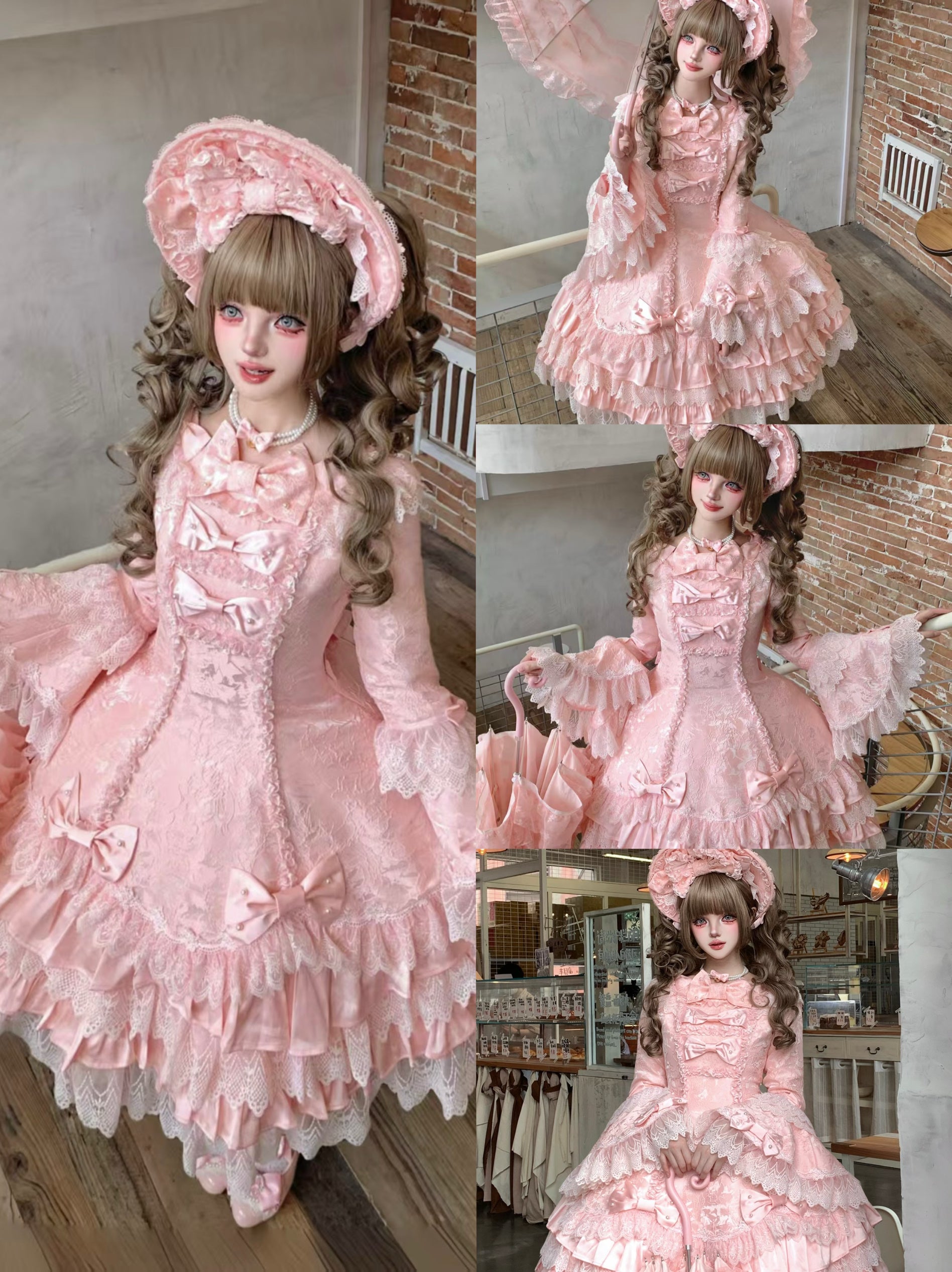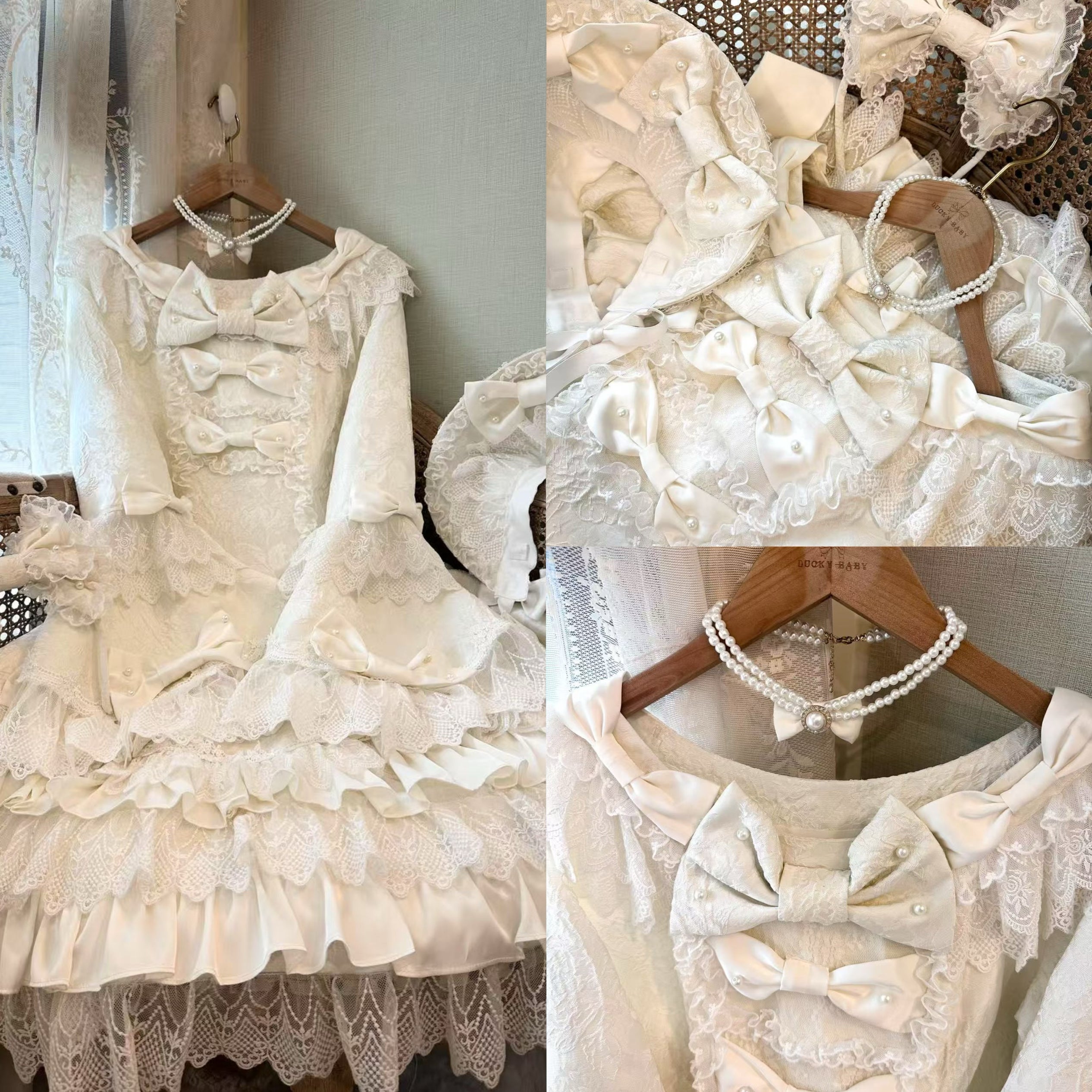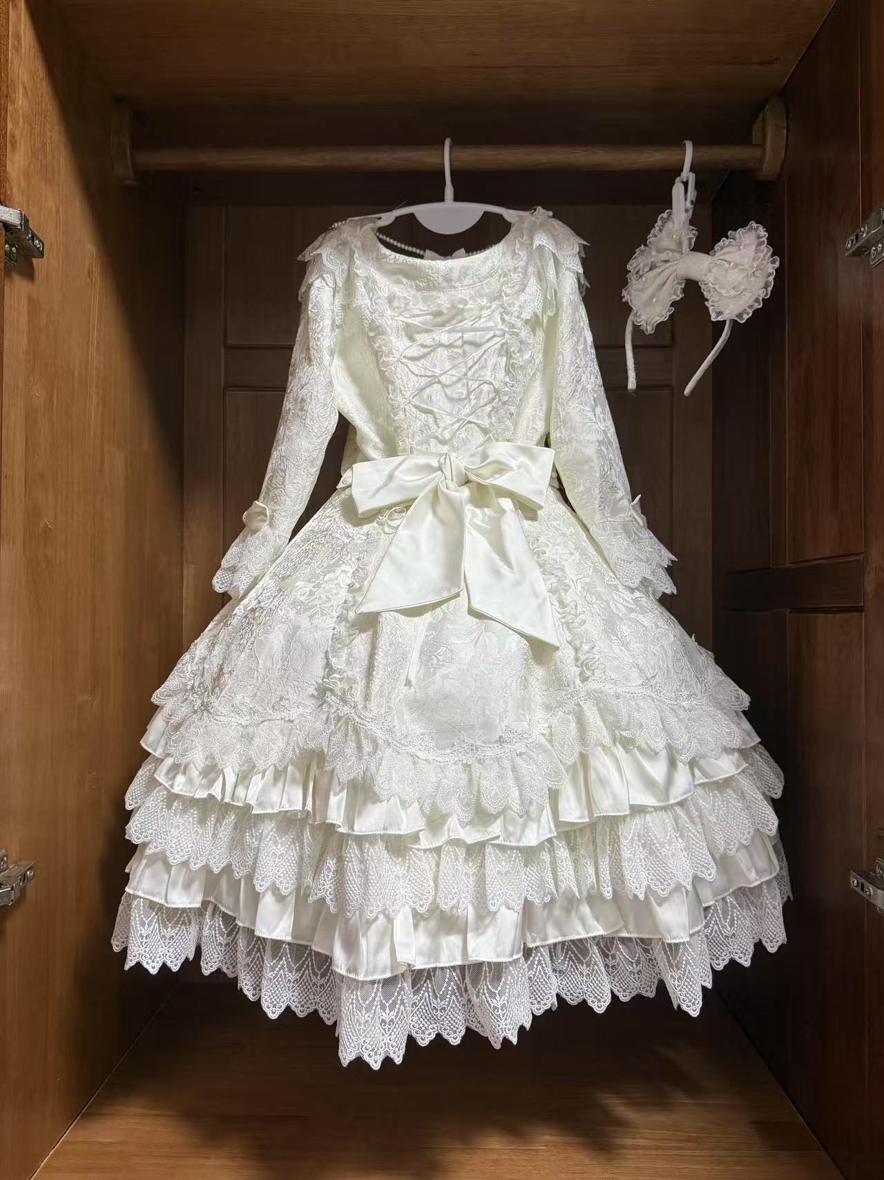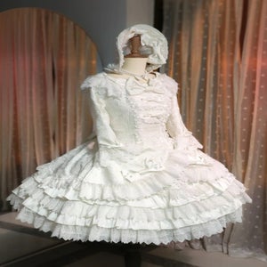 This one-piece dress with numerous elaborate lace layers that shows the retro Victorian style. The back straps can shape the beautiful body line, and multiple bows decorate the grace theme. It is impressive to match with the same series accessories.The fabric is a dark embossed polyester with a pearlized dark pattern, which has a slight shimmer in daylight. The embossed weaving process gives the fabric a rich texture. It is thick yet breathable. Its weight makes it more suitable for spring, fall, and winter wear. The lining is 45-count rayon. The dress is beaded, so be cautious when machine-washing.