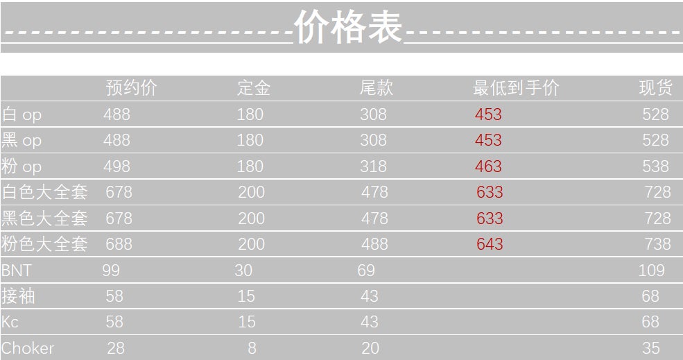 Price listed is for the black and white full set. Pink full set is 738. 528 is for the black and white op. 538 is for the pink op. Bonnet is 109. KC is 68. Choker is 35.