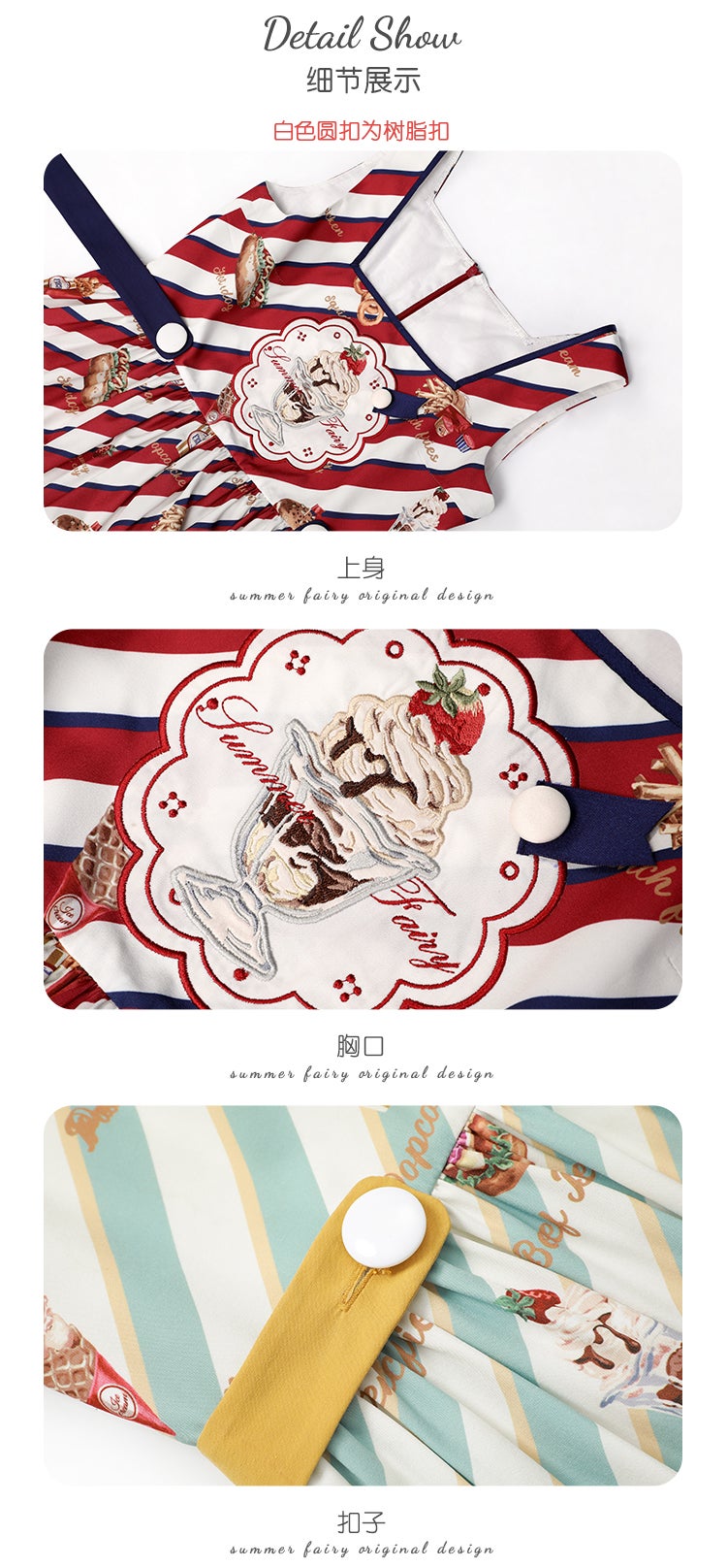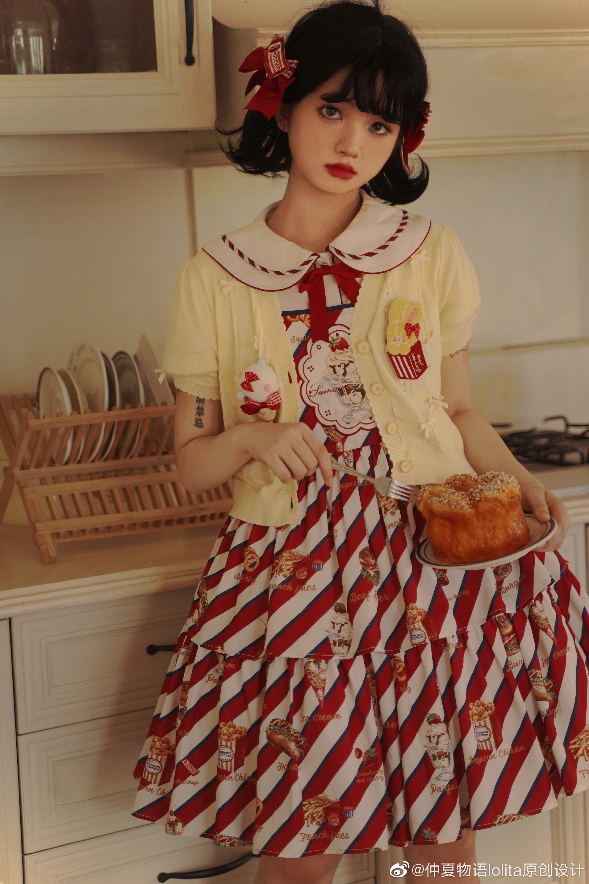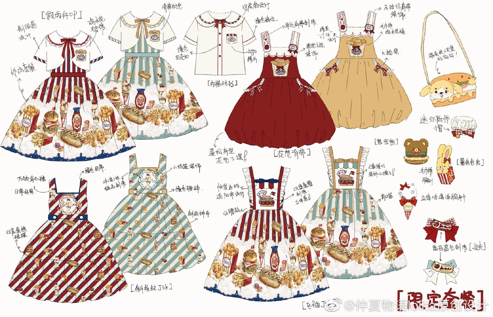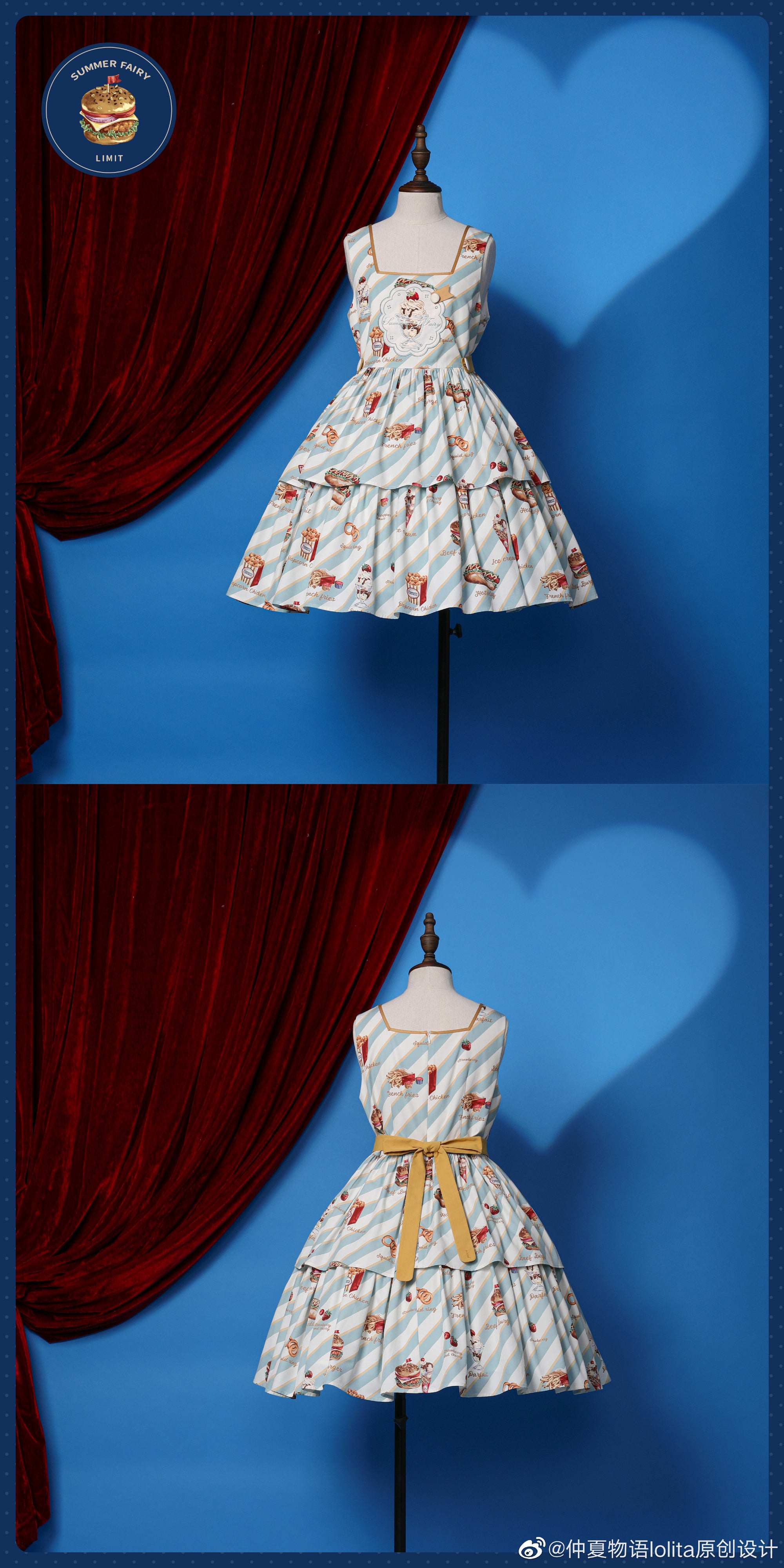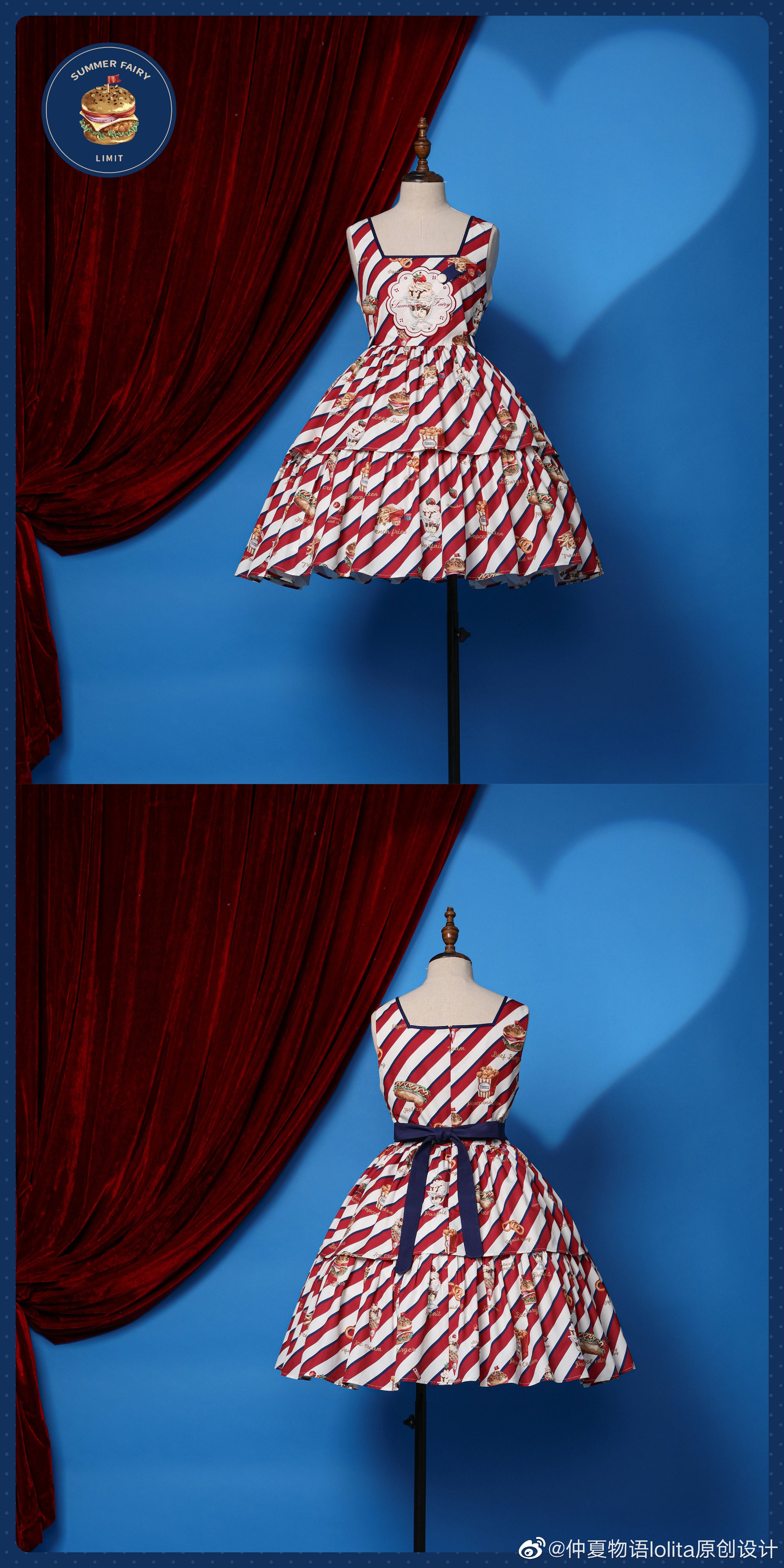 [Brand comment] Summer is for fried chicken, hamburgers, french fries, ice cream! A summer limited package for midsummer girls~ The prints are all red and mint base colors, and the straps are red and yellow, conveying the warmth and lightness of summer. The printed fabric of this series is plain weave four-way stretch, which is smooth and not wrinkled, the strap is polyester fabric, the lining is cotton, which is more breathable, and the shirt is more wrinkle-resistant polyester-cotton material. Vest jsk, a loose square neck vest, is also a good style to wear. This one is specially made with diagonal stripes, which can better match the shape of the two-layer cake. A contrasting ribbon is attached to the neckline to add a sense of small details. The chest is a complete appliqué embroidery. The strawberry parfait is placed in a petal-shaped plate. The upper right corner is a wrap button and a small ribbon with cute little details and prints. The small hamburger flag in the middle echoes, and the two sides of the waist are solid-colored belts with contrasting colors. In addition to the function of closing the waist, the large cloth buckle also becomes the decoration of the waist. This skirt is a double-layer cake, which brings out the simplicity and cuteness. Jsk's way of putting on and taking off is also very convenient with the rear middle zipper.