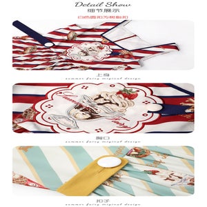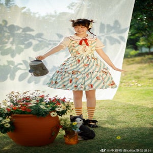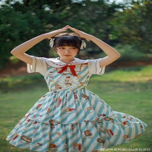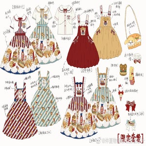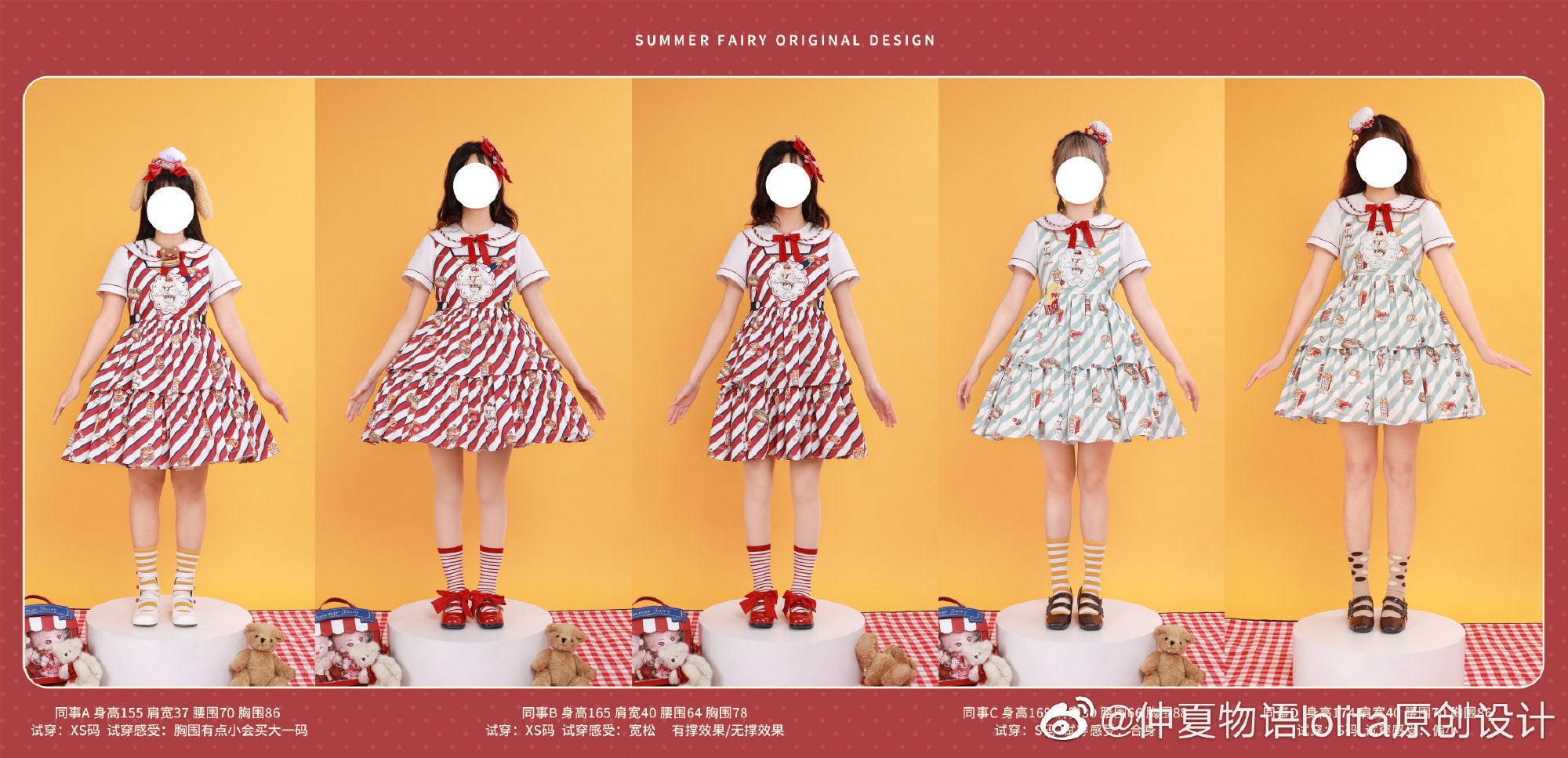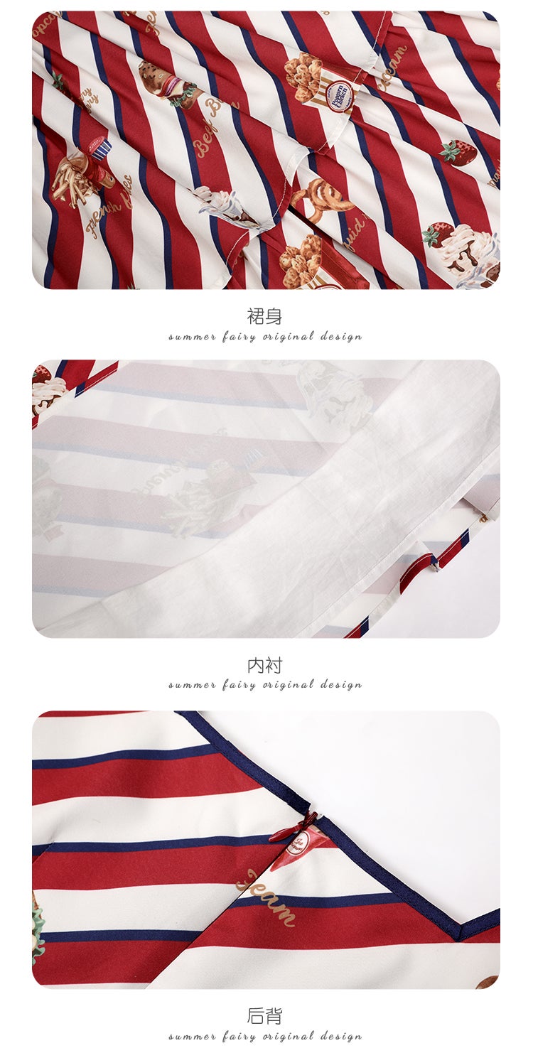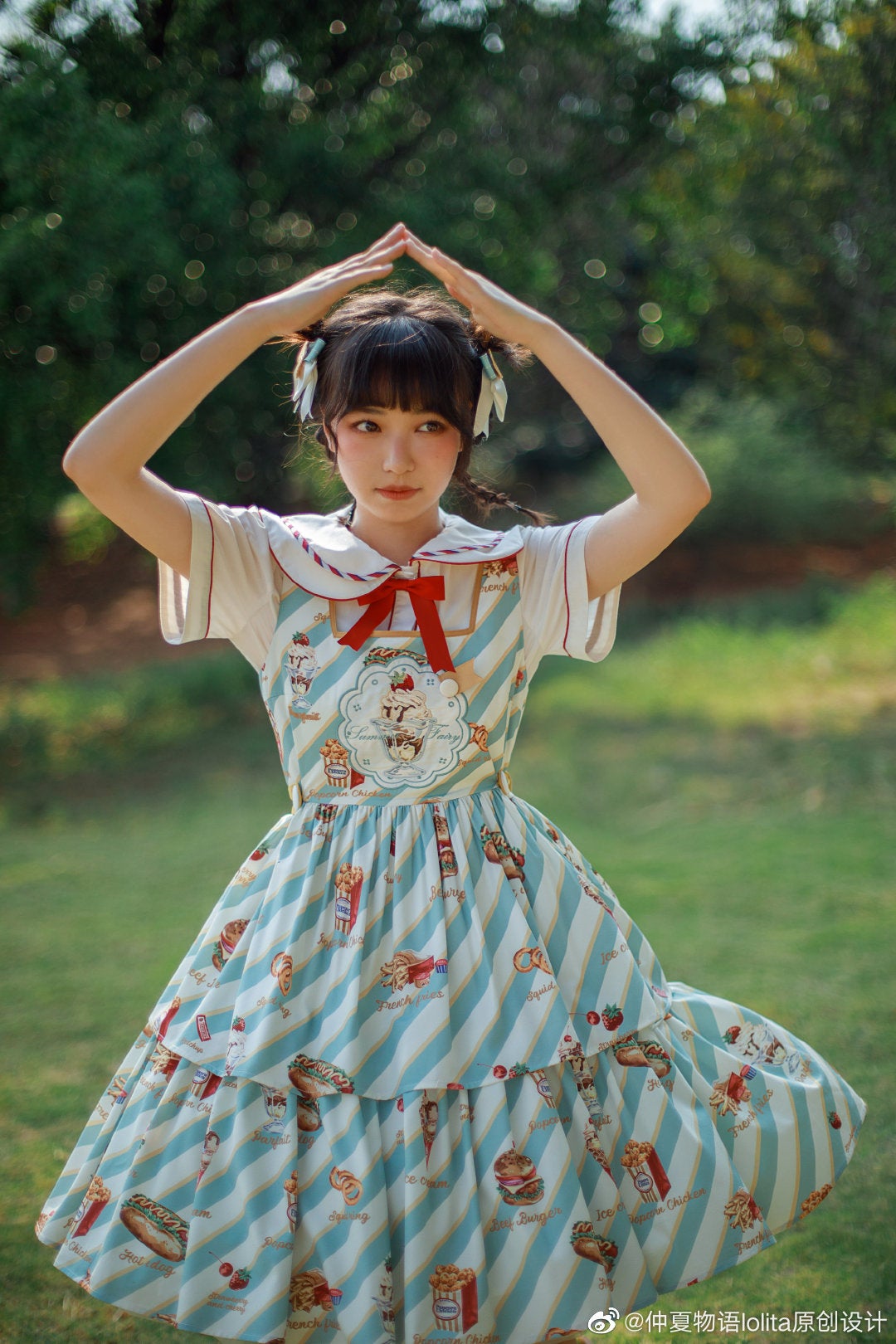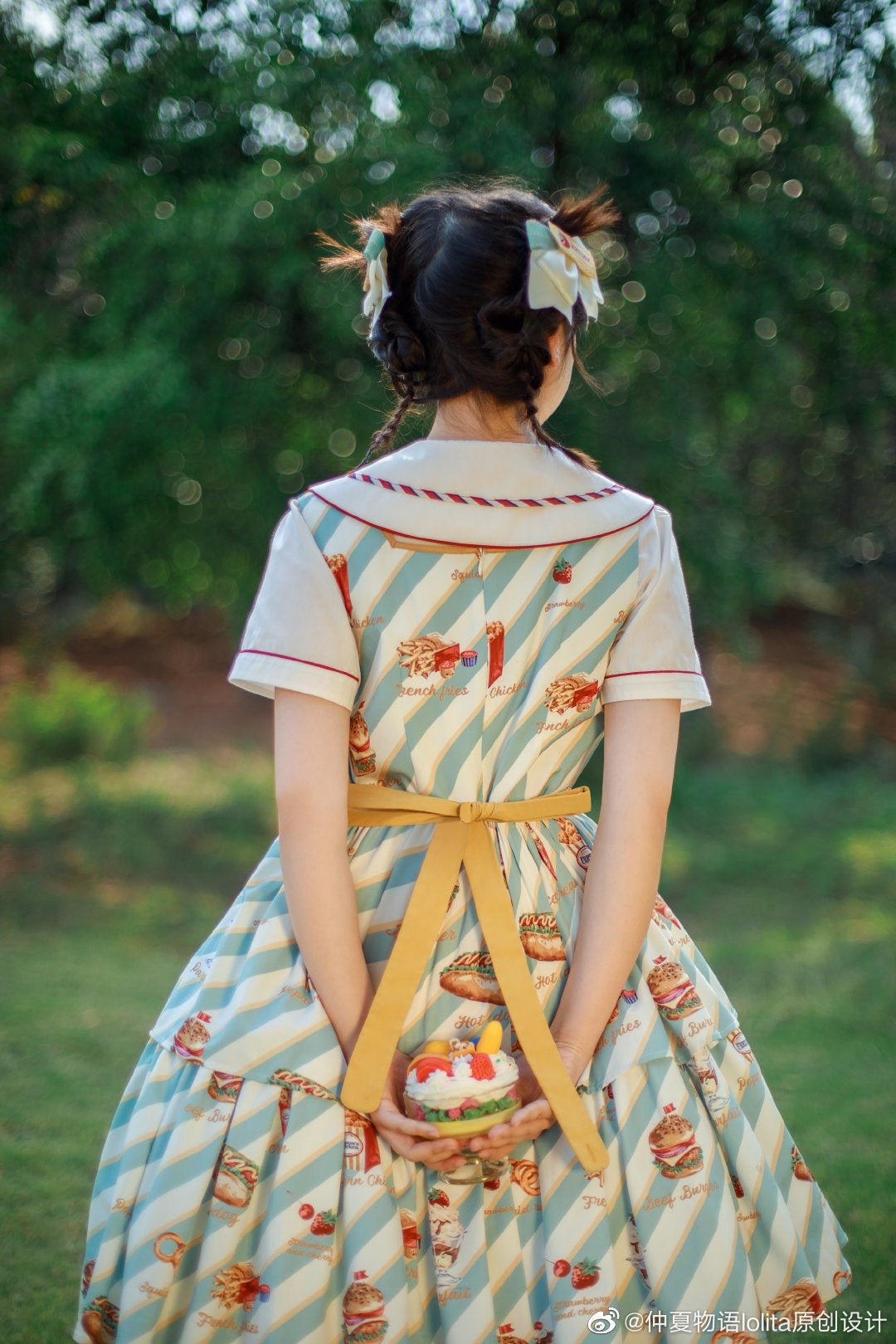 [Brand comment] Summer is for fried chicken, hamburgers, french fries, ice cream! A summer limited package for midsummer girls~ The prints are all red and mint base colors, and the straps are red and yellow, conveying the warmth and lightness of summer. The printed fabric of this series is plain weave four-way stretch, which is smooth and not wrinkled, the strap is polyester fabric, the lining is cotton, which is more breathable, and the shirt is more wrinkle-resistant polyester-cotton material. Vest jsk, a loose square neck vest, is also a good style to wear. This one is specially made with diagonal stripes, which can better match the shape of the two-layer cake. A contrasting ribbon is attached to the neckline to add a sense of small details. The chest is a complete appliqué embroidery. The strawberry parfait is placed in a petal-shaped plate. The upper right corner is a wrap button and a small ribbon with cute little details and prints. The small hamburger flag in the middle echoes, and the two sides of the waist are solid-colored belts with contrasting colors. In addition to the function of closing the waist, the large cloth buckle also becomes the decoration of the waist. This skirt is a double-layer cake, which brings out the simplicity and cuteness. Jsk's way of putting on and taking off is also very convenient with the rear middle zipper.