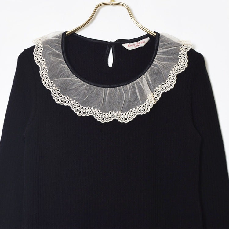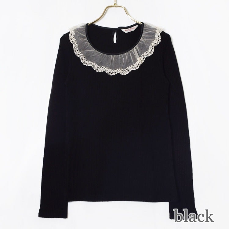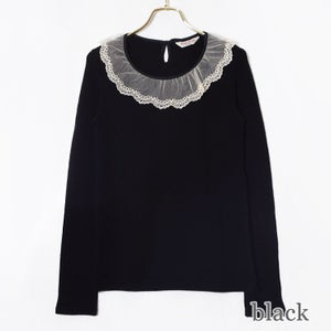 衿ぐりの繊細なチュールレースが華やかな着心地のいいリブカットソー。