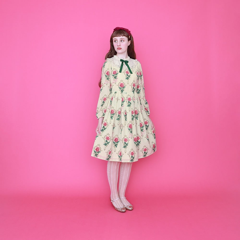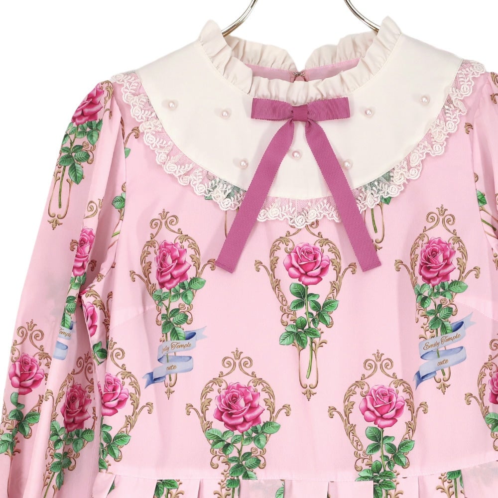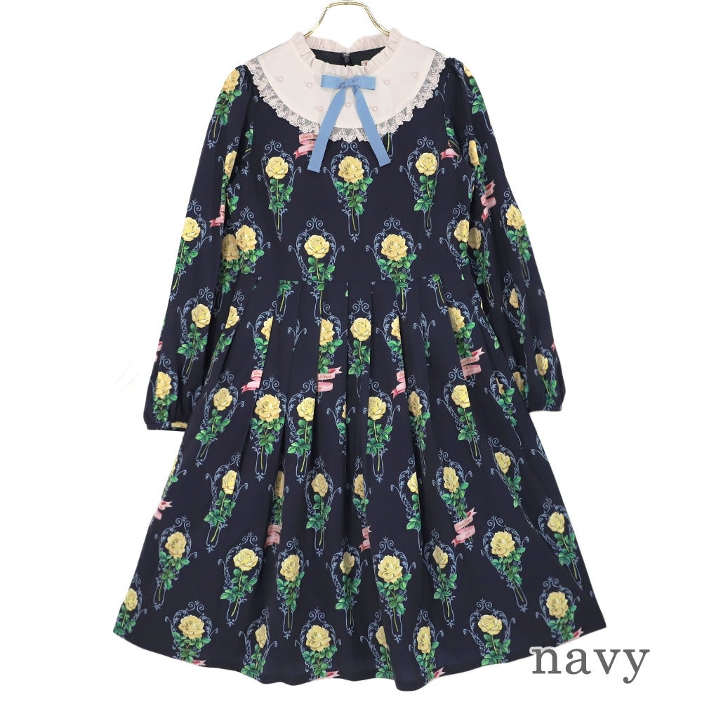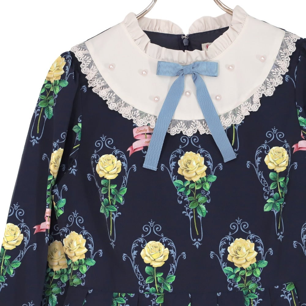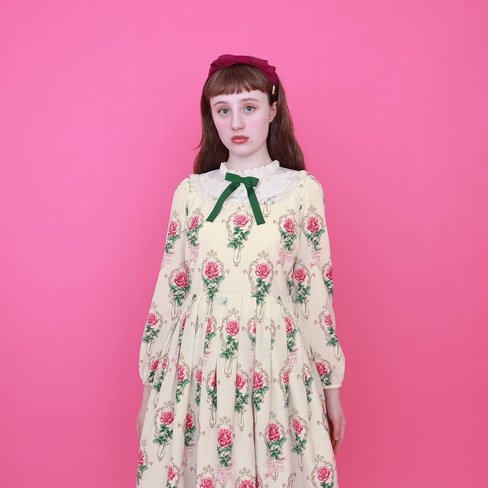 胸元を彩る大きめのパールとローズレースが、可憐な表情を引き立てます