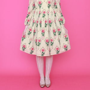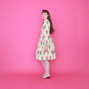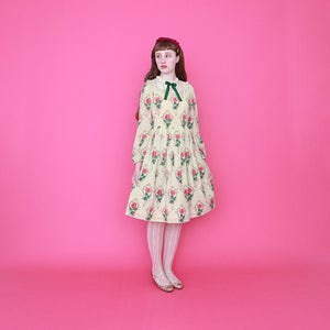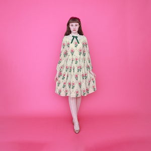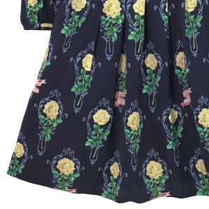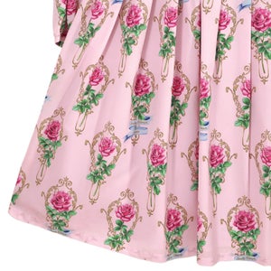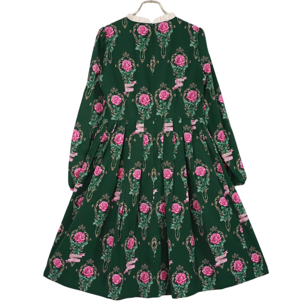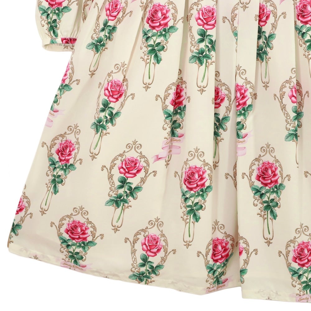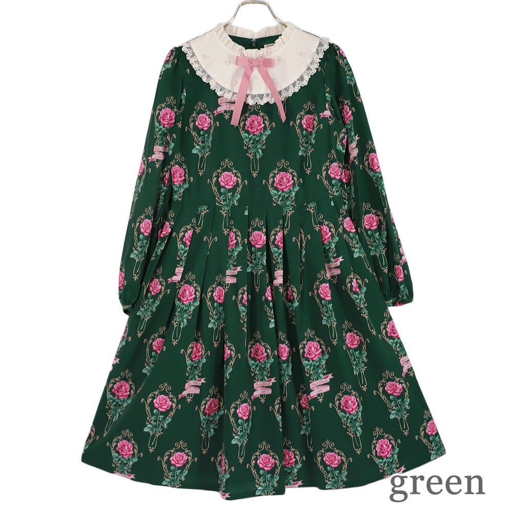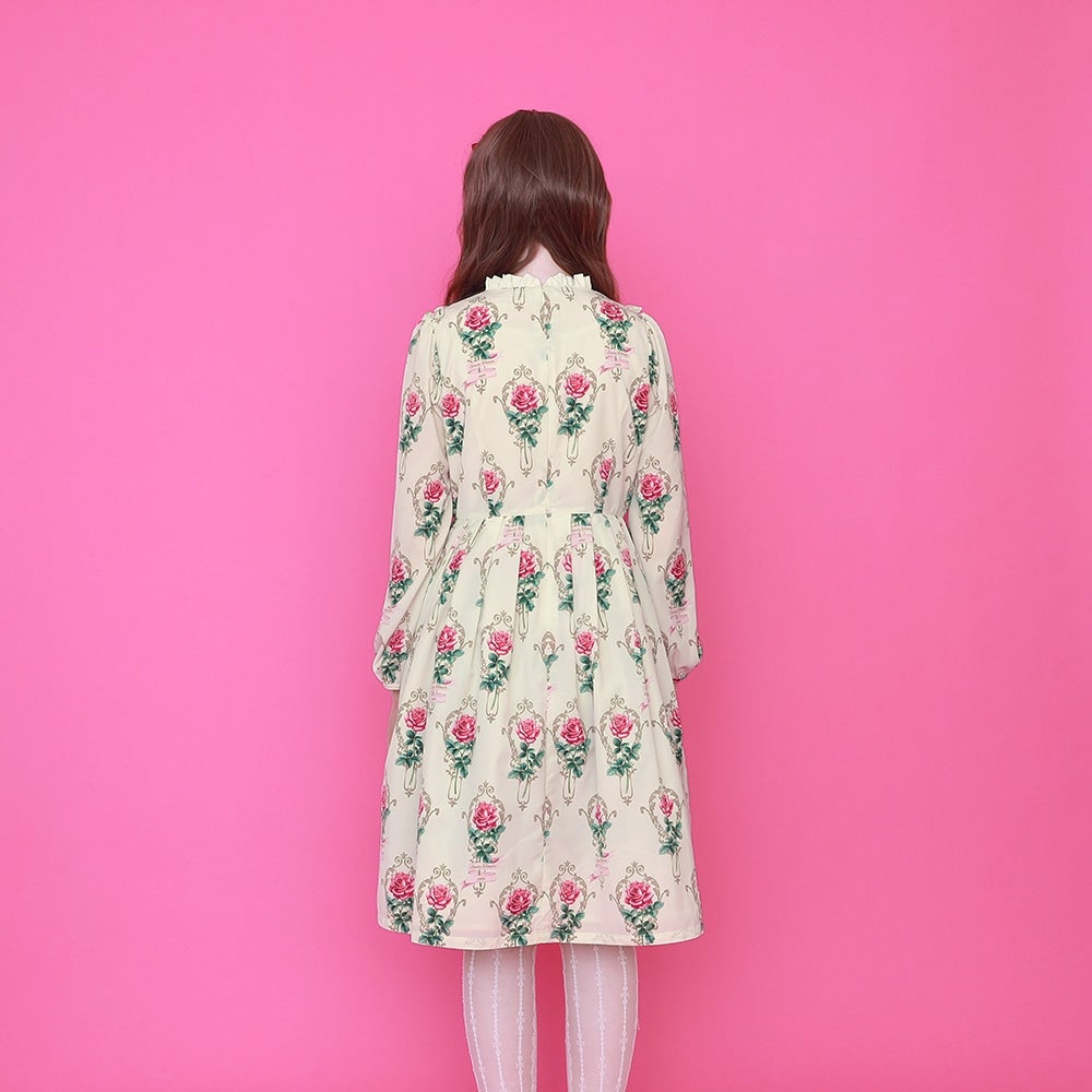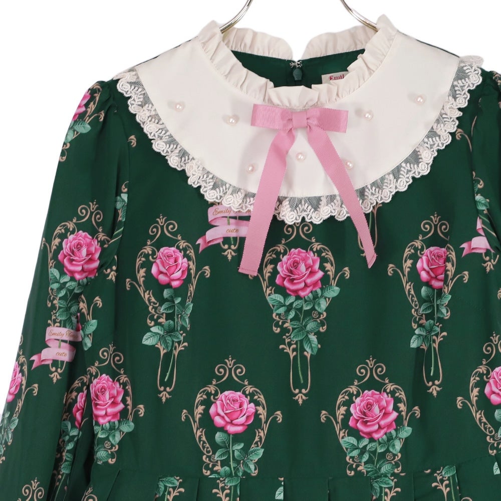胸元を彩る大きめのパールとローズレースが、可憐な表情を引き立てます